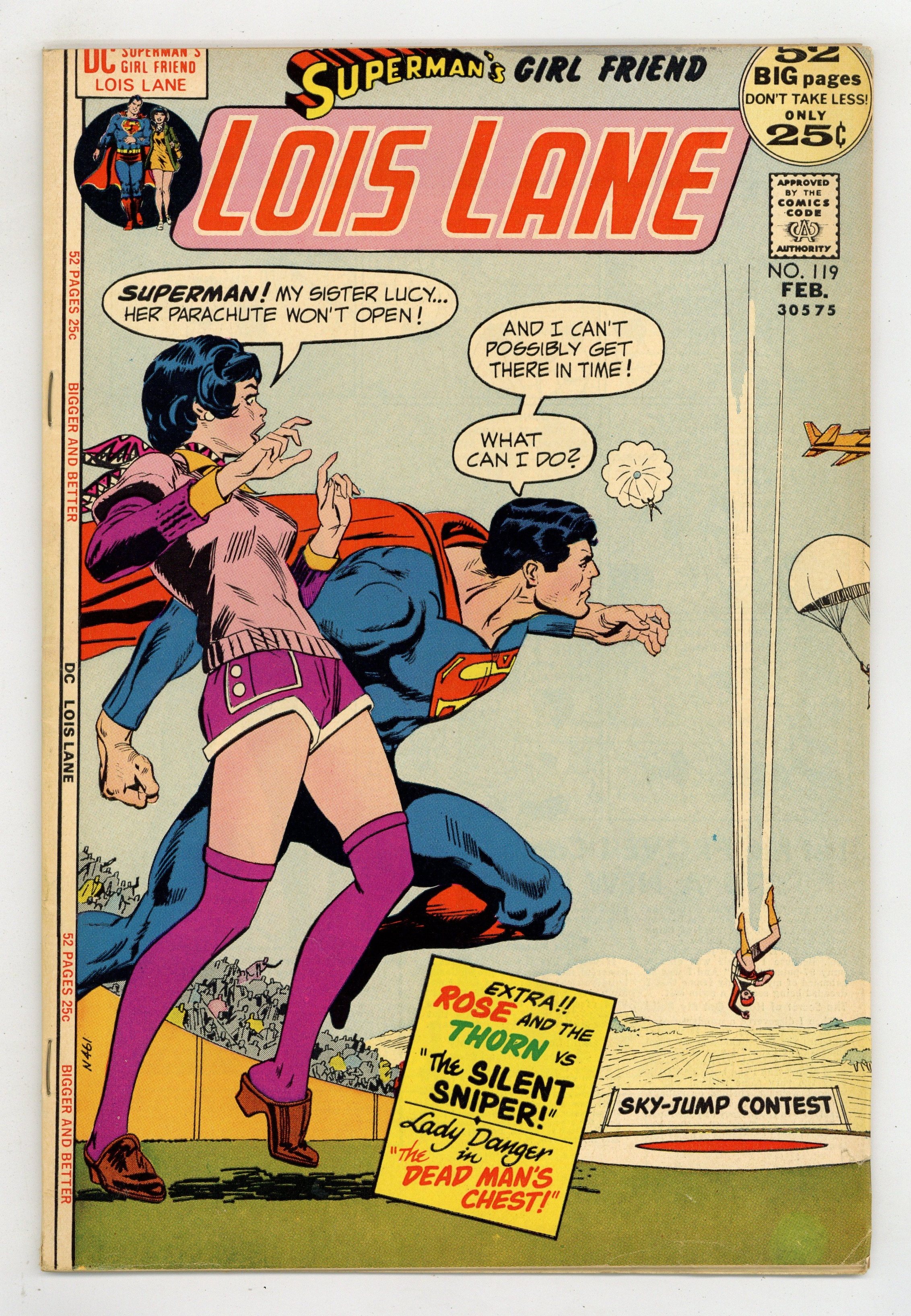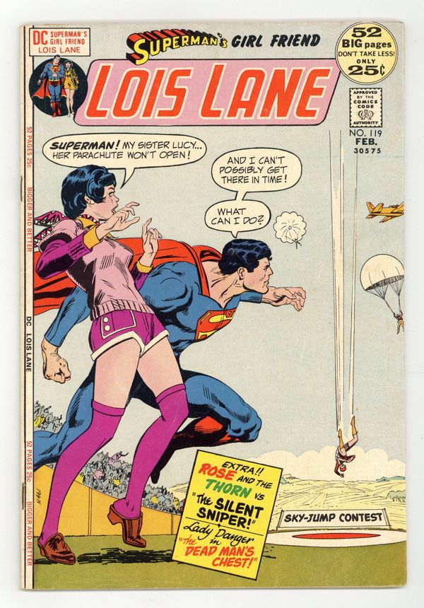 Cover art by Bob Oksner. Inside the Outsiders!, script by Robert Kanigher, pencils by Werner Roth, inks by Vince Colletta and Murphy Anderson (Superman heads only); Lois Lane does a story on the Outsiders, a hippie-type group that believes in peace and love, who are being framed for murder by the Morgan Edge clone. The Dead Man's Chest!, pencils by Bob Oksner, inks by Bernard Sachs; Valerie witnesses a sailer almost killed in a hit-and-run and then discovers that the sailor had supposedly died a year earlier. The Silent Sniper!, script by Robert Kanigher, pencils by Rich Buckler, inks by Dick Giordano; A sniper wounds Danny Stone and then takes a shot at Thorn. One-page Fact File #5 text feature on Wildcat. 52 Pages, Full Color. Cover price $0.25.