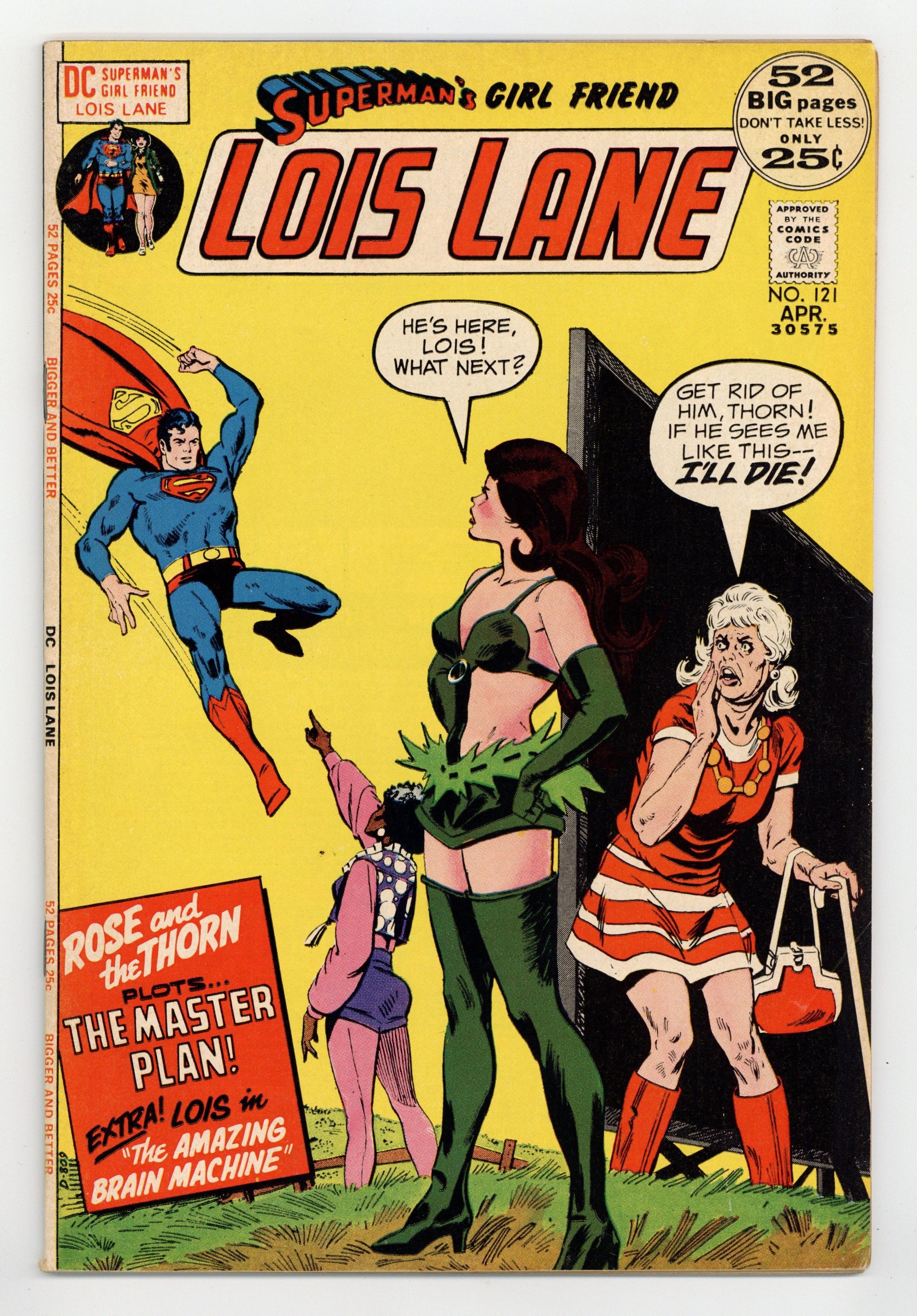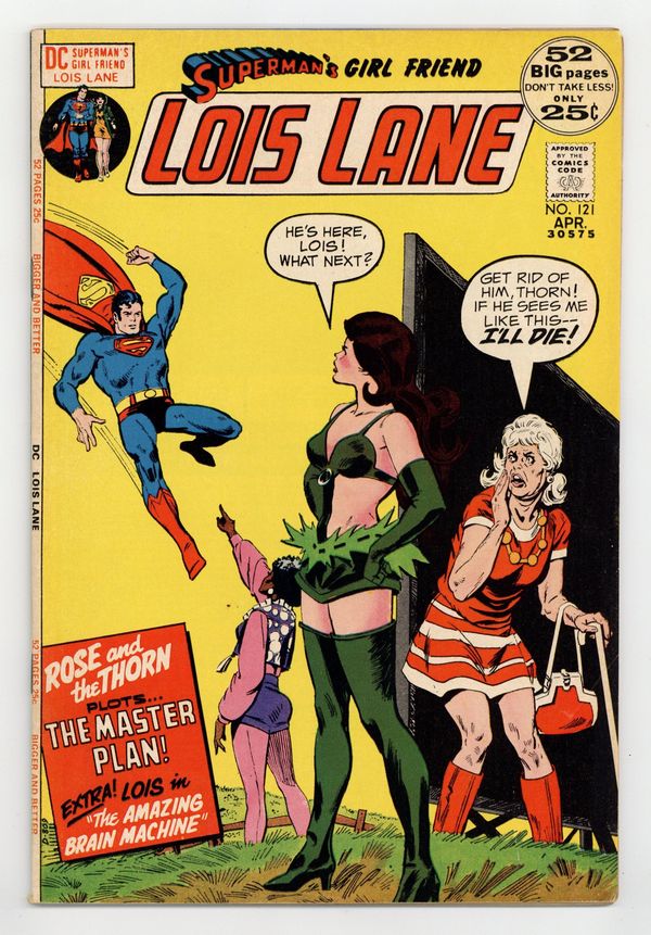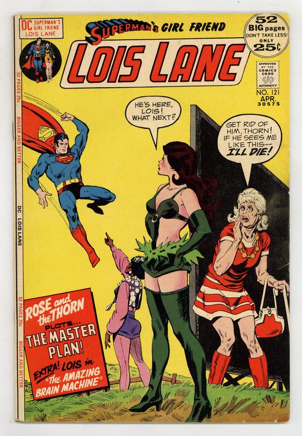Cover pencils by Bob Oksner and Murphy Anderson (Superman head). Everything You Wanted to Know about Lois Lane * But Were Afraid to Ask!, script by Cary Bates, pencils by Werner Roth, inks by Vince Colletta and Murphy Anderson (Superman heads only); Returning to Metropolis several weeks after her sister's death, Lois quits her job at the Daily Planet so that she can work freelance on important stories; She also tells Superman that they are finished, and moves into an apartment with three roommates. Master Plan, pencils by Rich Buckler, inks by Mike Esposito; The Thorn tracks Lois Lane to her apartment while reflecting on a new battle plan against the 100 that will involve Lois and Superman. The Amazing Brain Machine!, art by Kurt Schaffenberger; Lois and Lana each use a super-computer to try and learn how to get Superman to marry her. 52 Pages, Full Color. Cover price $0.25.