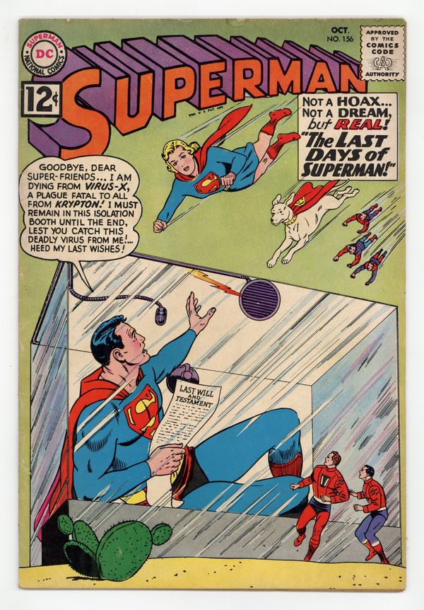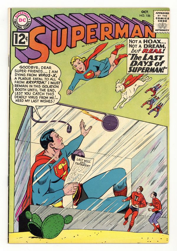 Cover pencils by Curt Swan, inks by George Klein. Superman's Death Sentence! [The Last Days of Superman! part 1], script by Edmond Hamilton, pencils by Curt Swan, inks by George Klein; A Kryptonian artifact containing samples of Virus X crashes on Earth. The Super-Comrades of All Time! [The Last Days of Superman! part 2]; As Superman lies near death, Supergirl recruits Superman's allies to help perform all the great tasks Superman planned to do before he died. Superman's Last Day of Life! [The Last Days of Superman! part 3]. 36 Pages, Full Color. Cover price $0.12.