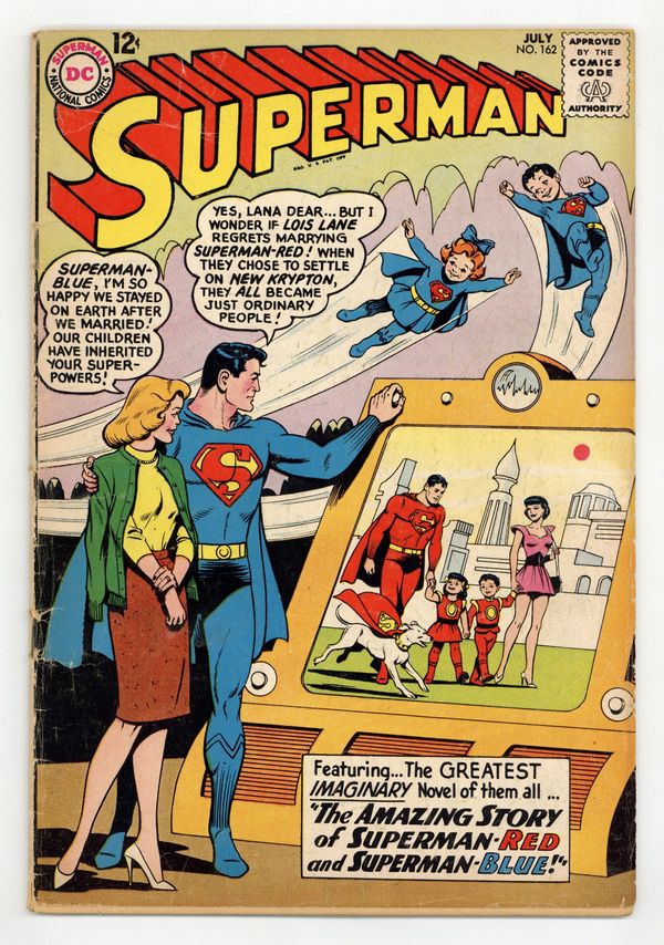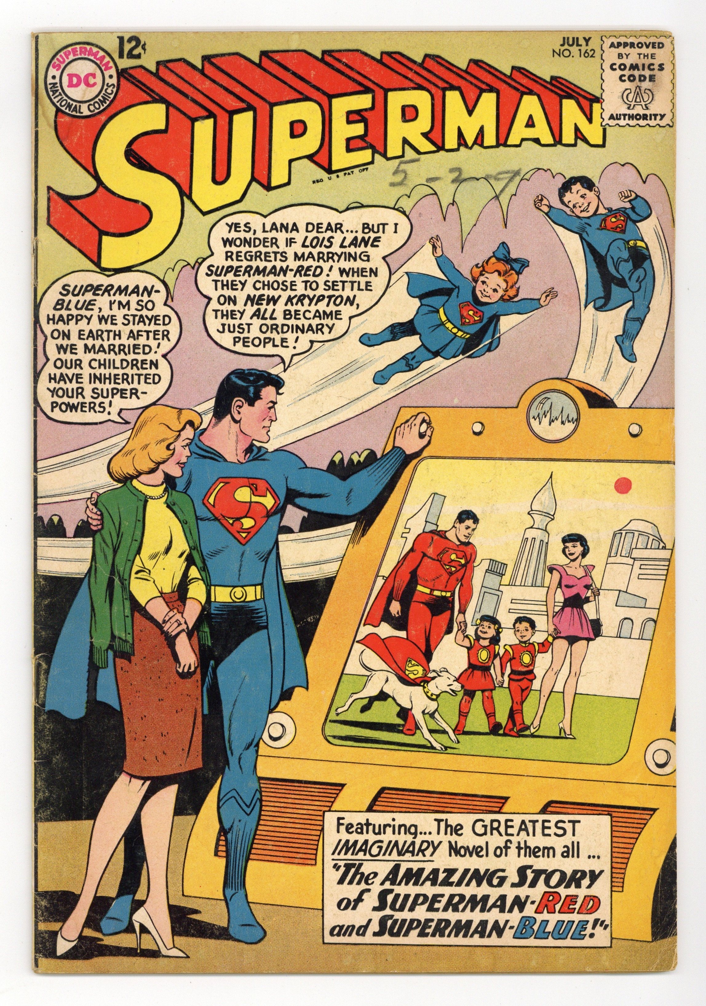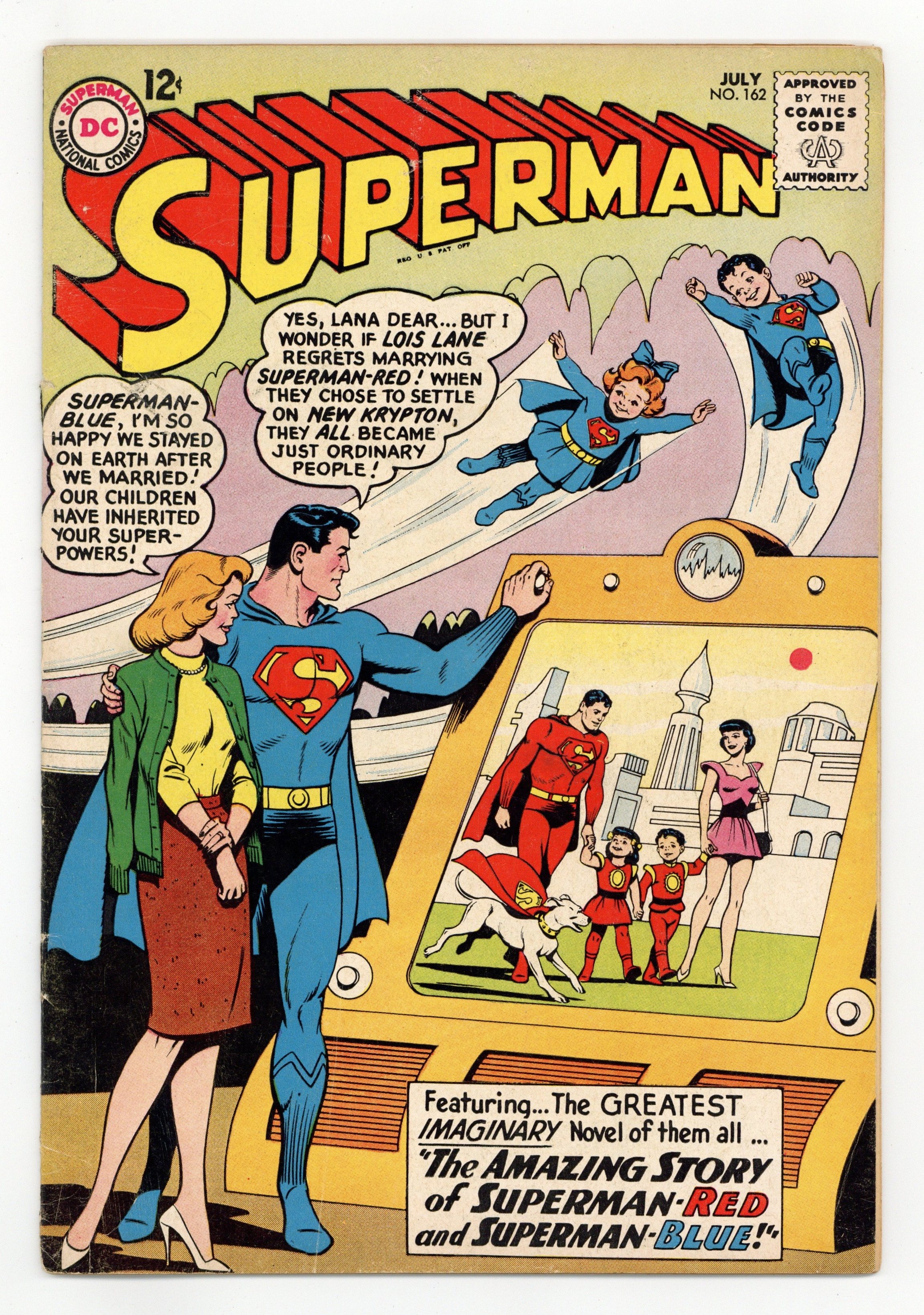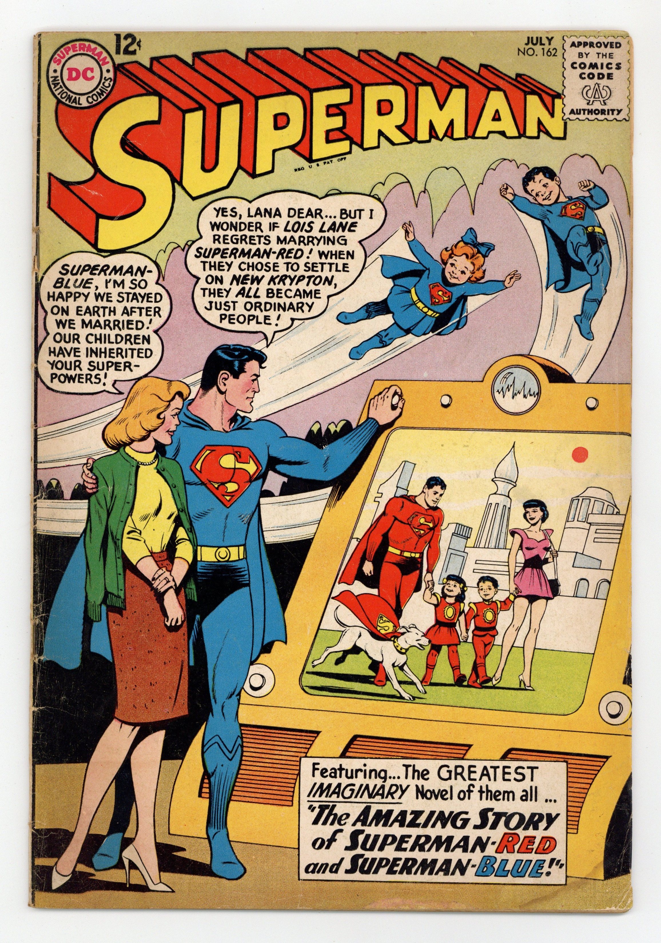 Cover art by Kurt Schaffenberger. The Titanic Twins! [The Amazing Story of Superman-Red and Superman-Blue! part 1], script by Leo Dorfman, pencils by Curt Swan, inks by George Klein; Superman splits into two Supermen in this classic, oft-reprinted story. The Anti-Evil Ray! [The Amazing Story of Superman-Red and Superman-Blue! part 2]; Luthor, Brainiac, Phantom Zoners, Khruschev, and Castro reform; Lex Luthor cures all illnesses. A Tree Grows on Second Street public service announcement, script by Jack Schiff, art by Sheldon Moldoff. The End of Superman's Career! [The Amazing Story of Superman-Red and Superman-Blue! part 3]; The Supermen marry Lois Lane and Lana Lang; Jimmy Olsen marries Lucy Lane; Mr. Mxyzptlk reforms. Super-Turtle humor page by Henry Boltinoff. 36 Pages, Full Color. Cover price $0.12.