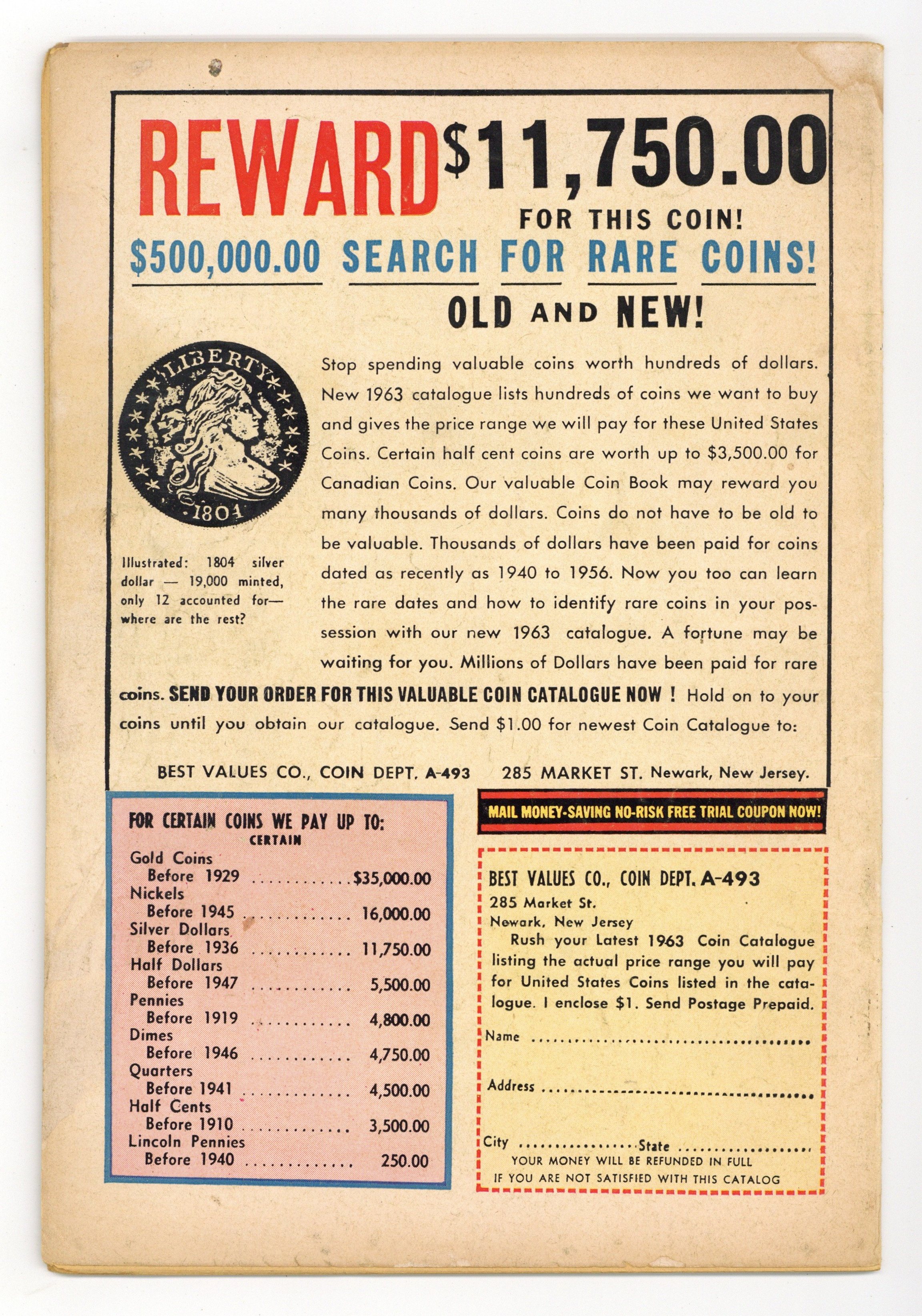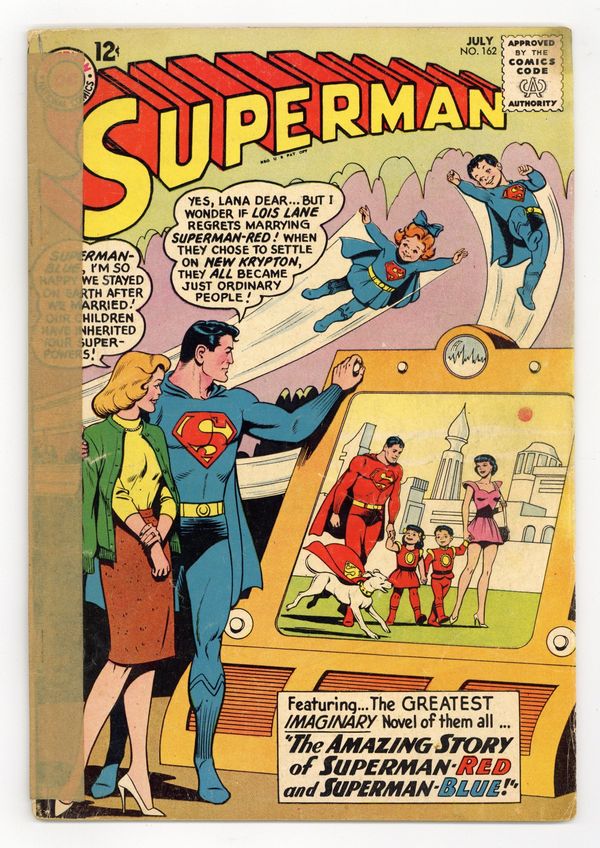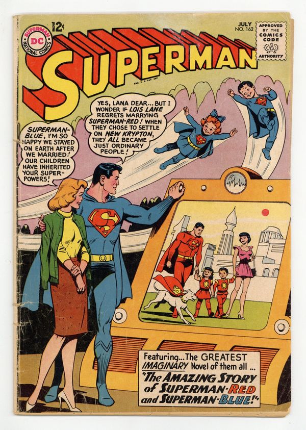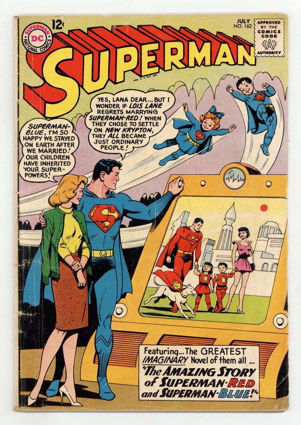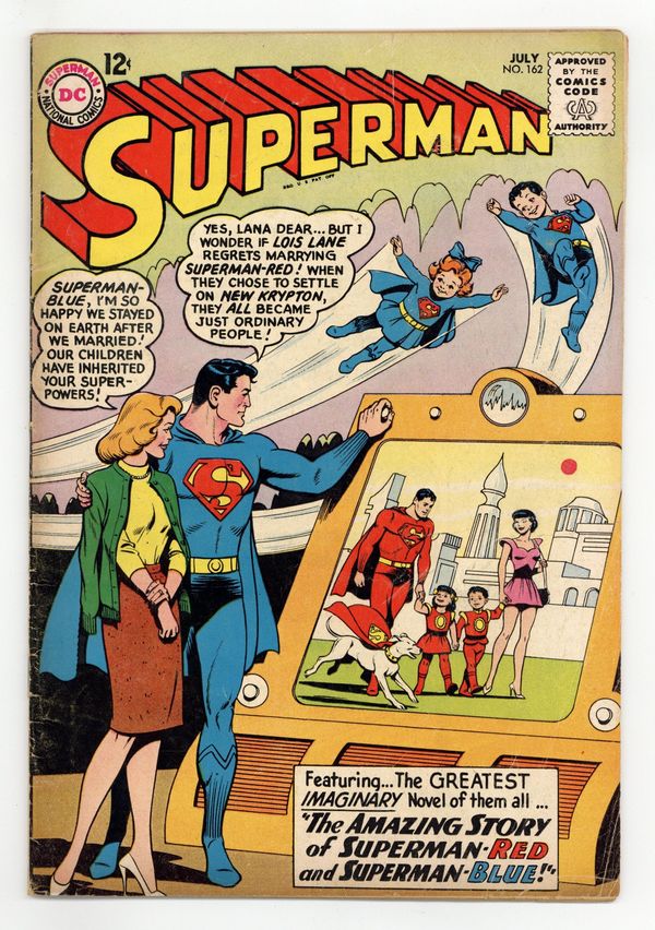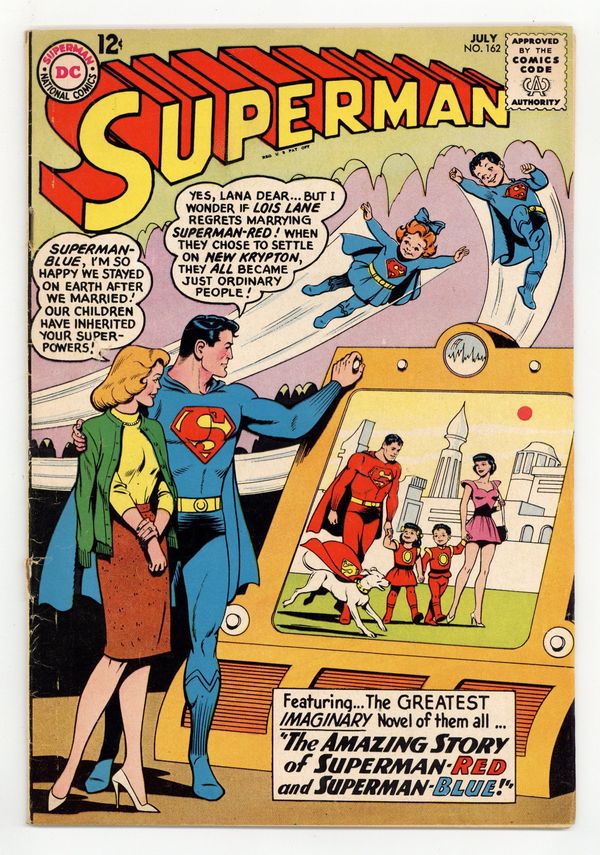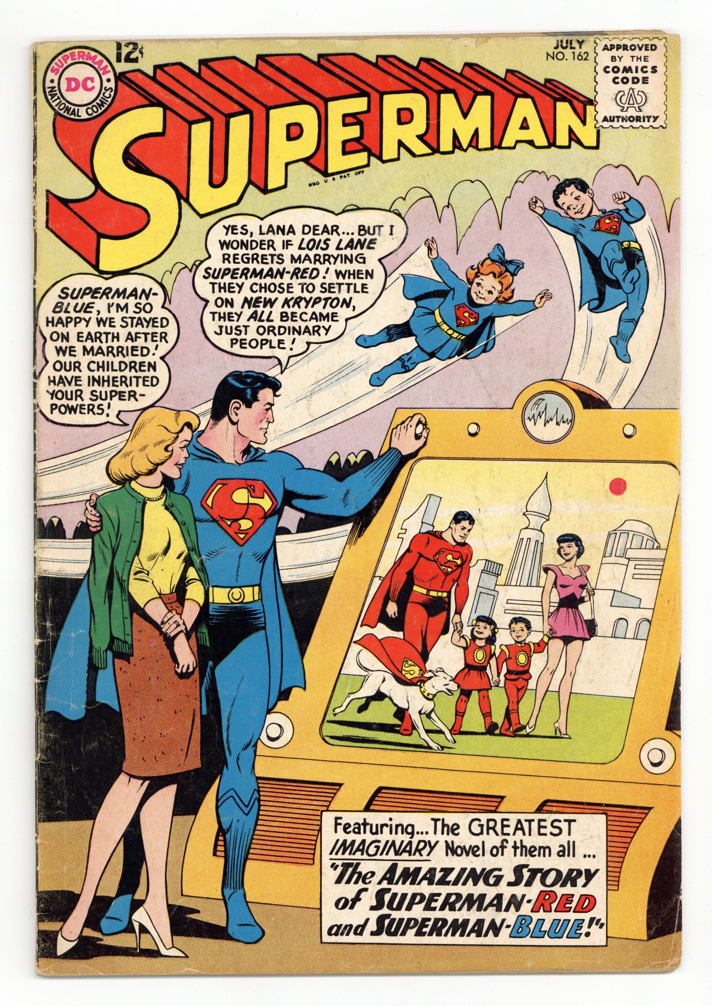 Cover art by Kurt Schaffenberger. The Titanic Twins! [The Amazing Story of Superman-Red and Superman-Blue! part 1], script by Leo Dorfman, pencils by Curt Swan, inks by George Klein; Superman splits into two Supermen in this classic, oft-reprinted story. The Anti-Evil Ray! [The Amazing Story of Superman-Red and Superman-Blue! part 2]; Luthor, Brainiac, Phantom Zoners, Khruschev, and Castro reform; Lex Luthor cures all illnesses. A Tree Grows on Second Street public service announcement, script by Jack Schiff, art by Sheldon Moldoff. The End of Superman's Career! [The Amazing Story of Superman-Red and Superman-Blue! part 3]; The Supermen marry Lois Lane and Lana Lang; Jimmy Olsen marries Lucy Lane; Mr. Mxyzptlk reforms. Super-Turtle humor page by Henry Boltinoff. 36 Pages, Full Color. Cover price $0.12.