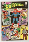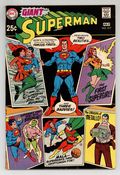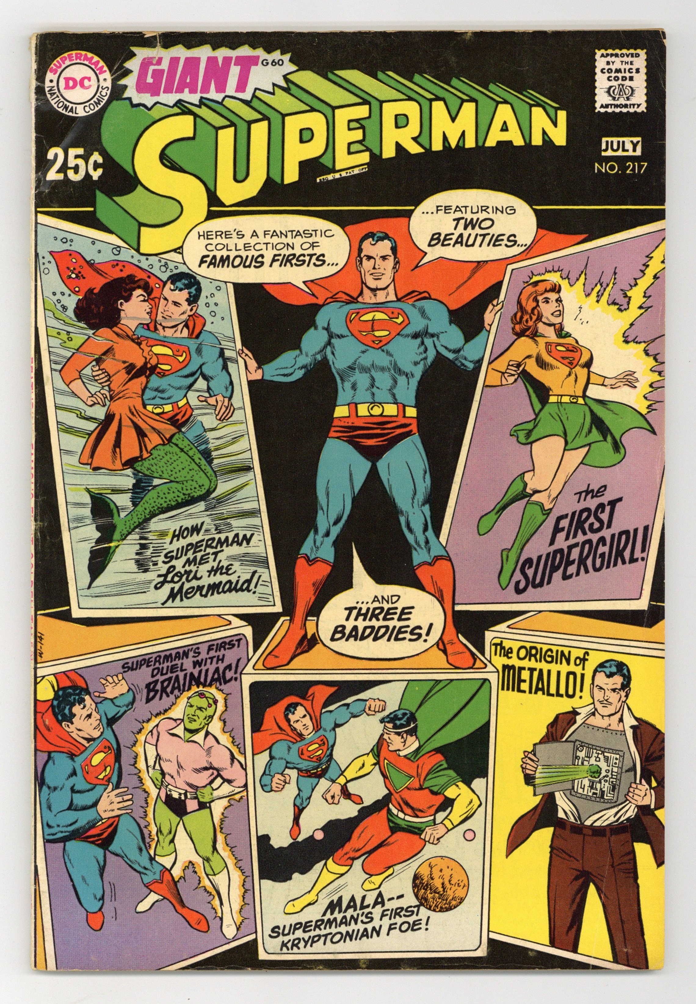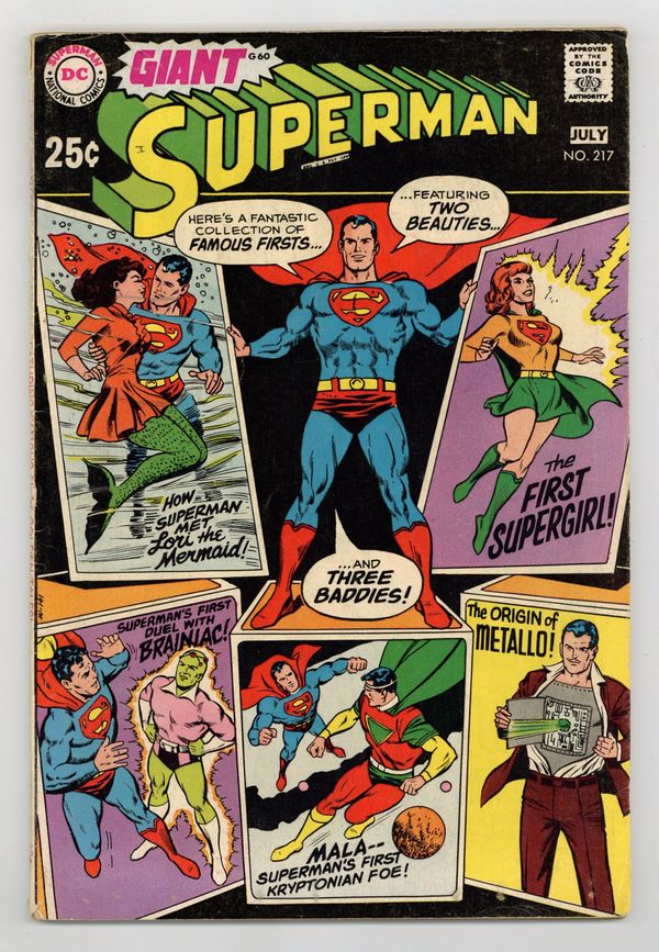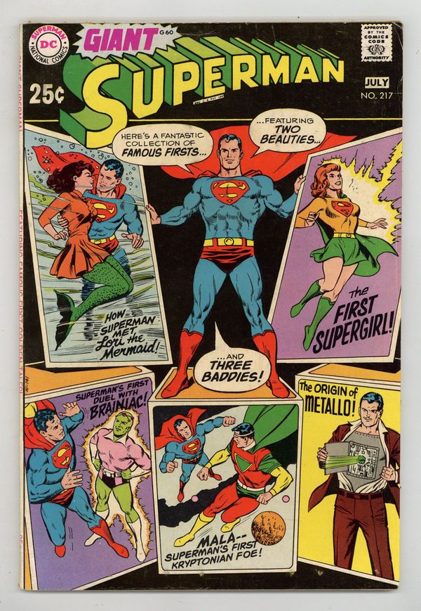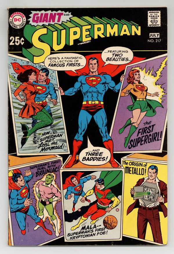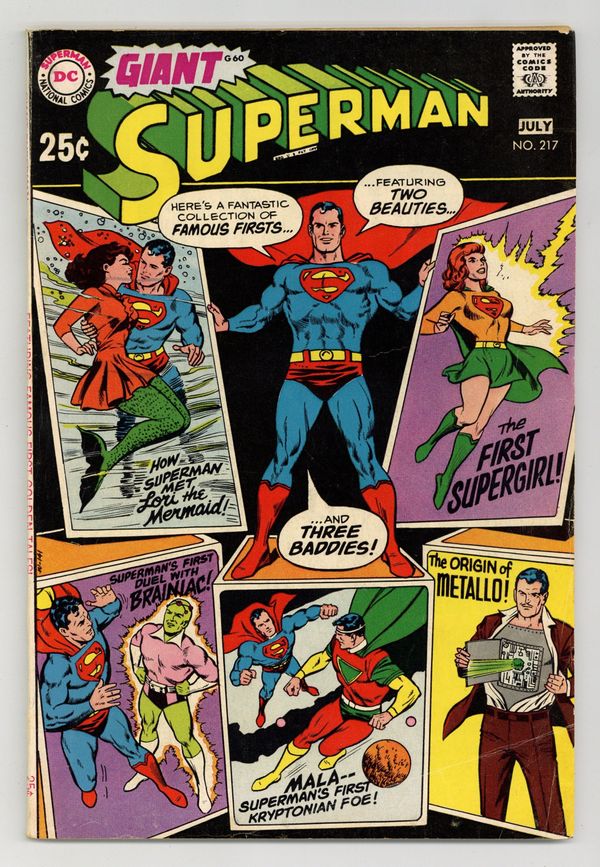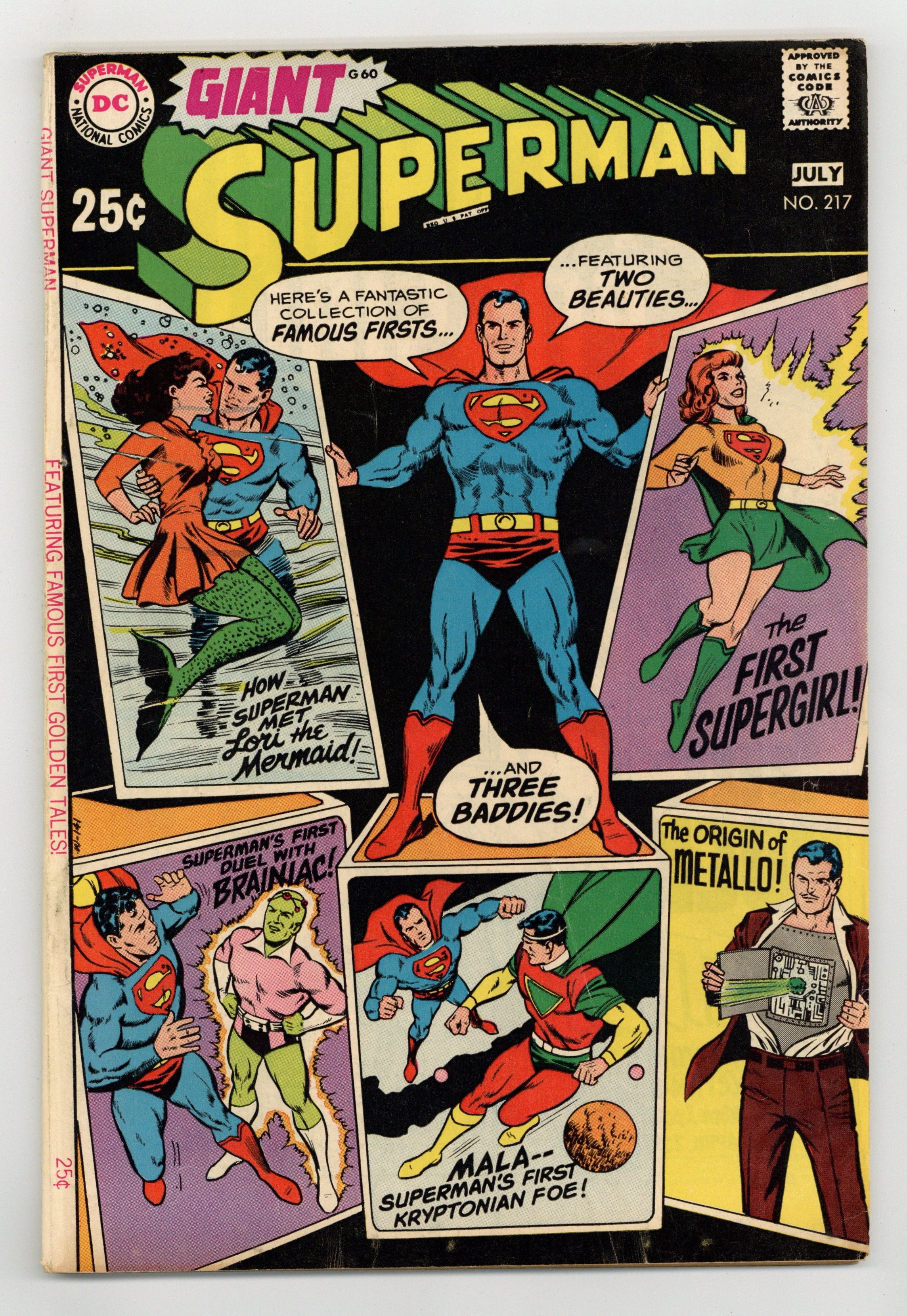 Cover pencils by Curt Swan, inks by Vince Colletta. DC Giant featuring reprinted stories of firsts and origins: The Outlaws From Krypton!, script by Bill Finger, pencils by Wayne Boring, inks by Stan Kaye; Superman's first Kryptonian foe. The Girl in Superman's Past!, script by Bill Finger, pencils by Wayne Boring, inks by Stan Kaye; Superman recalls his college romance with Lori Lemaris, a mermaid from sunken Atlantis. The Super-Duel in Space, script by Otto Binder, art by Al Plastino; While on an experimental rocket, Clark and Lois encounter the alien Brainiac, who plans to shrink and bottle the great cities of Earth and then use them to repopulate his planet. The First Supergirl!, script by Otto Binder, pencils by Dick Sprang, inks by Stan Kaye; Supergirl created by Jimmy's wish on magic totem. Superman and Supergirl pinup by Jim Mooney. The Menace of Metallo!, script by Robert Bernstein, art by Al Plastino; Criminal John Corben, who is nearly killed in an auto accident, is given a robot body powered by uranium. 68 Pages, Full Color. Cover price $0.25.