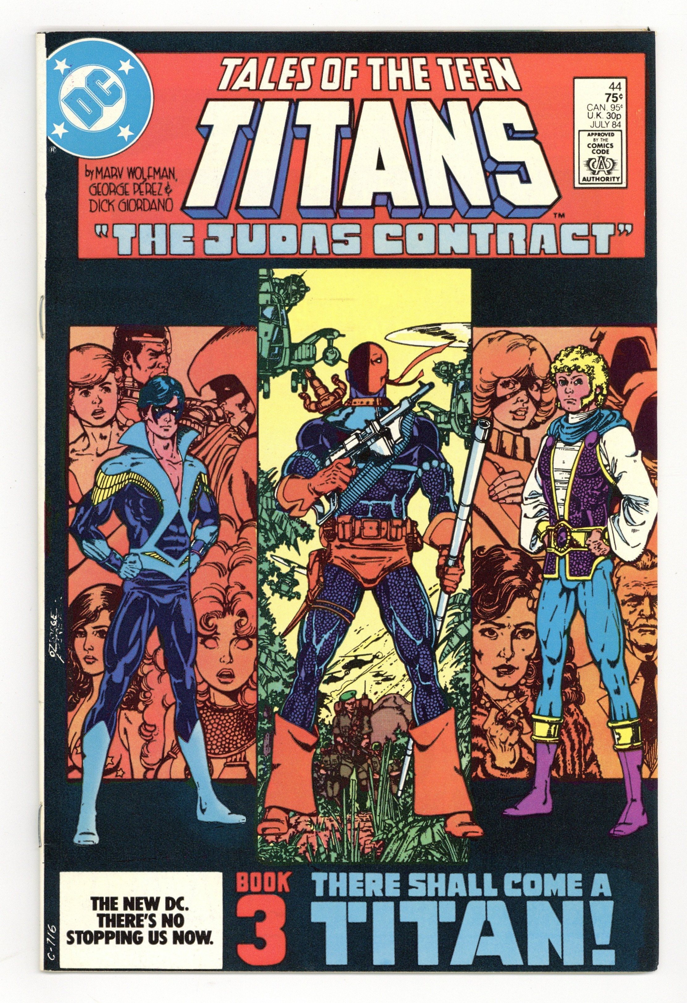 Direct Edition. The Judas Contract: Part 3 of 4: There Shall Come a Titan! - Written by Marv Wolfman & George Perez. Art by George Perez, Dick Giordano and Mike DeCarlo. Cover by George Perez. Adeline Wilson tells Dick Grayson of the origin of Deathstroke, and Dick assumes the name Nightwing for the first time! Starring Nightwing (intro), Jericho (intro), Deathstroke the Terminator, Terra, Adeline Wilson, H.I.V.E., Wintergreen, Grant Wilson (flashback/cameo) and Jackal. Concludes in New Teen Titans (1980) Annual #3. 36 pages, full color. Cover price $0.75.