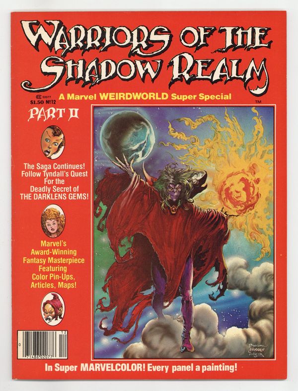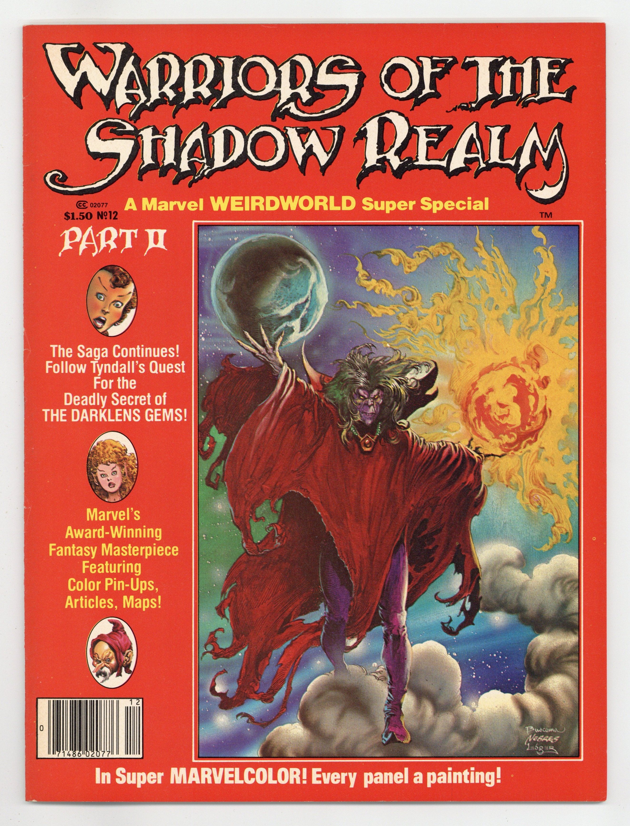 Warriors of the Shadow Realm. Part II of a Weirdworld epic written by Doug Moench, with art by John Buscema, Rudy Nebres and Peter Ledger. Tyndall, Velanna and Mud-Butt encounter a lost race of elves and battle a fallen god. Also includes a history of fantasy illustration by editor Richard Marschall. Full color. Painted cover by Buscema. 52 pages. Cover price $1.50.