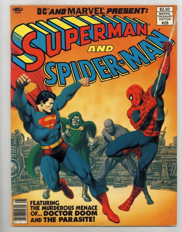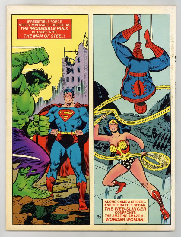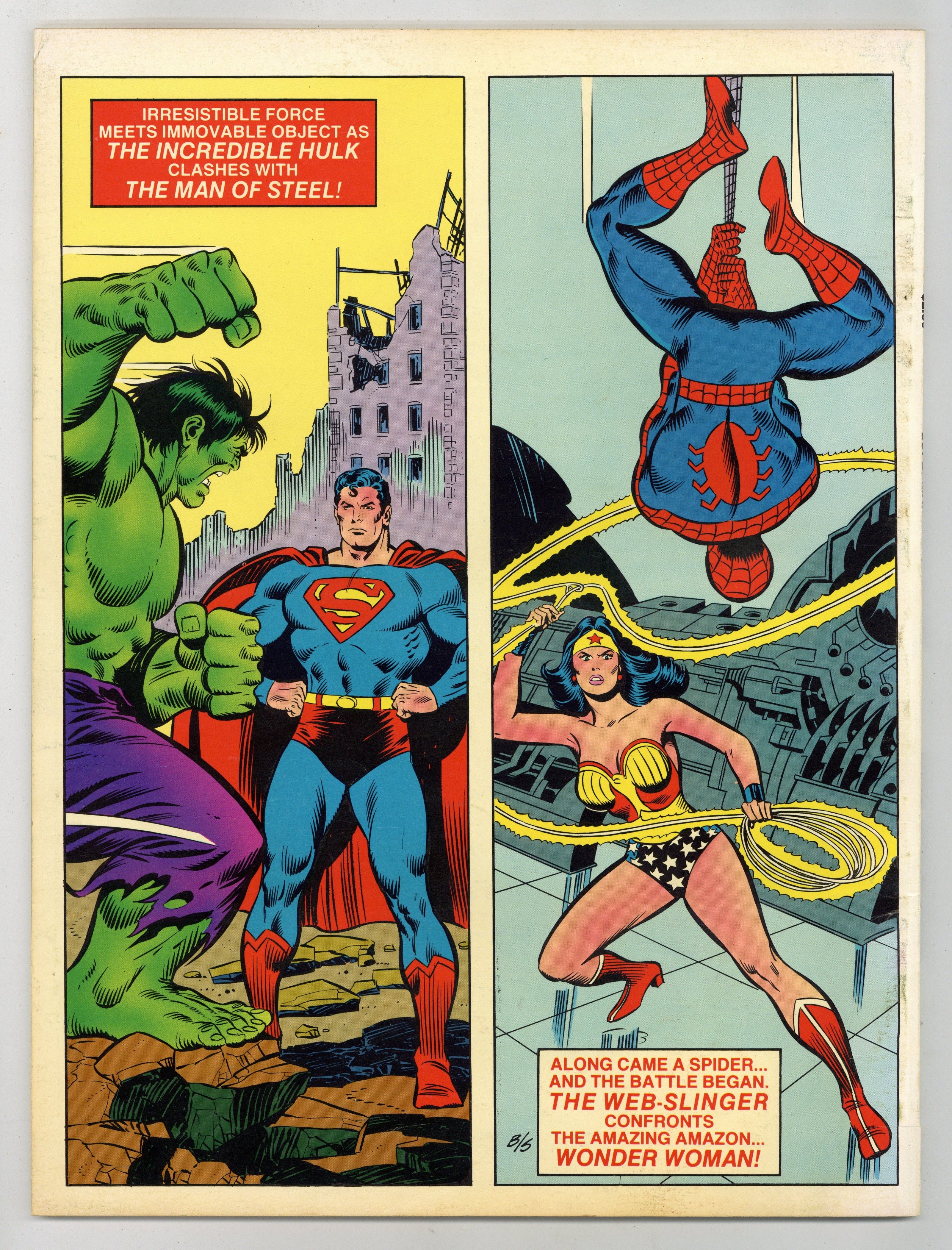 Superman and Spider-Man team up again in this special Marvel/DC crossover. "The Heroes and the Holocaust!" Guest-starring Wonder Woman and the Hulk. Script by Jim Shooter. Pencils by John Buscema. Inks (figures) by Joe Sinnott. Inks (backgrounds) by Terry Austin, Klaus Janson, Bob Layton, Steve Leialoha, Bob McLeod, Al Milgrom, Walt Simonson, Joe Rubinstein, and Bob Wiacek. Plot suggestions by Marv Wolfman. Painted cover by Bob Larkin (with layouts by John Romita). Doctor Doom kicks off his latest campaign for world conquest by sending the Hulk to Metropolis to free the Parasite! However the Green Goliath's massive path of destruction draws the attention of the Man of Steel! And shortly thereafter the clash of the titans erupts! Eventually Superman realizes the Hulk is being controlled from the Latverian embassy and flies to New York to investigate! In the meantime the Daily Bugle sends Peter Parker to Metropolis to get photographs of Superman! But instead of running into Clark Kent's alter ego, the web-slinger encounters Wonder Woman! After a brief skirmish, both heroes deduce that Dr. Doom is causing all the trouble! And a while later all concerned parties converge on the Latverian Monarch's underground complex in Manhattan for the final showdown! The Amazing Spider-Man and Superman vs. Doctor Doom and the Parasite for the freedom of the world! A terrific story! Cameo appearances by J. Jonah Jameson, Joe Robertson, Glory Grant, Perry White, Lois Lane, Jimmy Olsen, Lana Lang, Morgan Edge, and Steve Lombard. (Notes: Spider-Man and Superman first met in the 1976 Marvel/DC crossover: Superman vs. the Amazing Spider-Man (1976 Treasury) #1. The inside front cover illustrates the origins and powers of Superman and the web-slinger. The inside back cover displays an alternate cover for this issue by John Buscema. The back cover depicts Superman battling the Hulk and the wall-crawler clashing with Wonder Woman. This story takes place in an alternative universe known as Earth-7642 in Marvel continuity. This issue was reprinted in 1996 in Superman and Spider-Man (1996 comic-sized) #1. Book dimensions approximately 10" x 13".) 64 pages. Cover price $2.50.