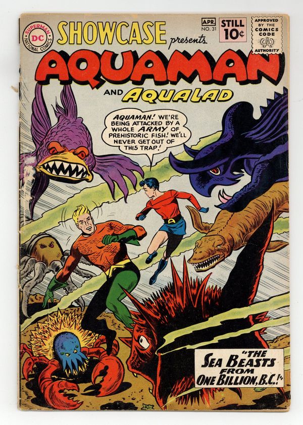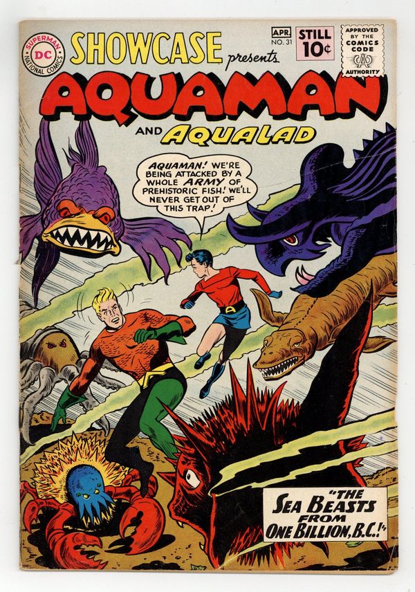 Cover pencils by Dick Dillin, inks by Sheldon Moldoff. The Sea Beasts from One Billion B.C. starring Aquaman, Aqualad, Professor Richards, and John Cook, script by Jack Miller, art by Nick Cardy; John Cook steals Professor Richards' ray that will turn a normal fish into a large sea monster. 36 Pages, Full Color. Cover price $0.10.