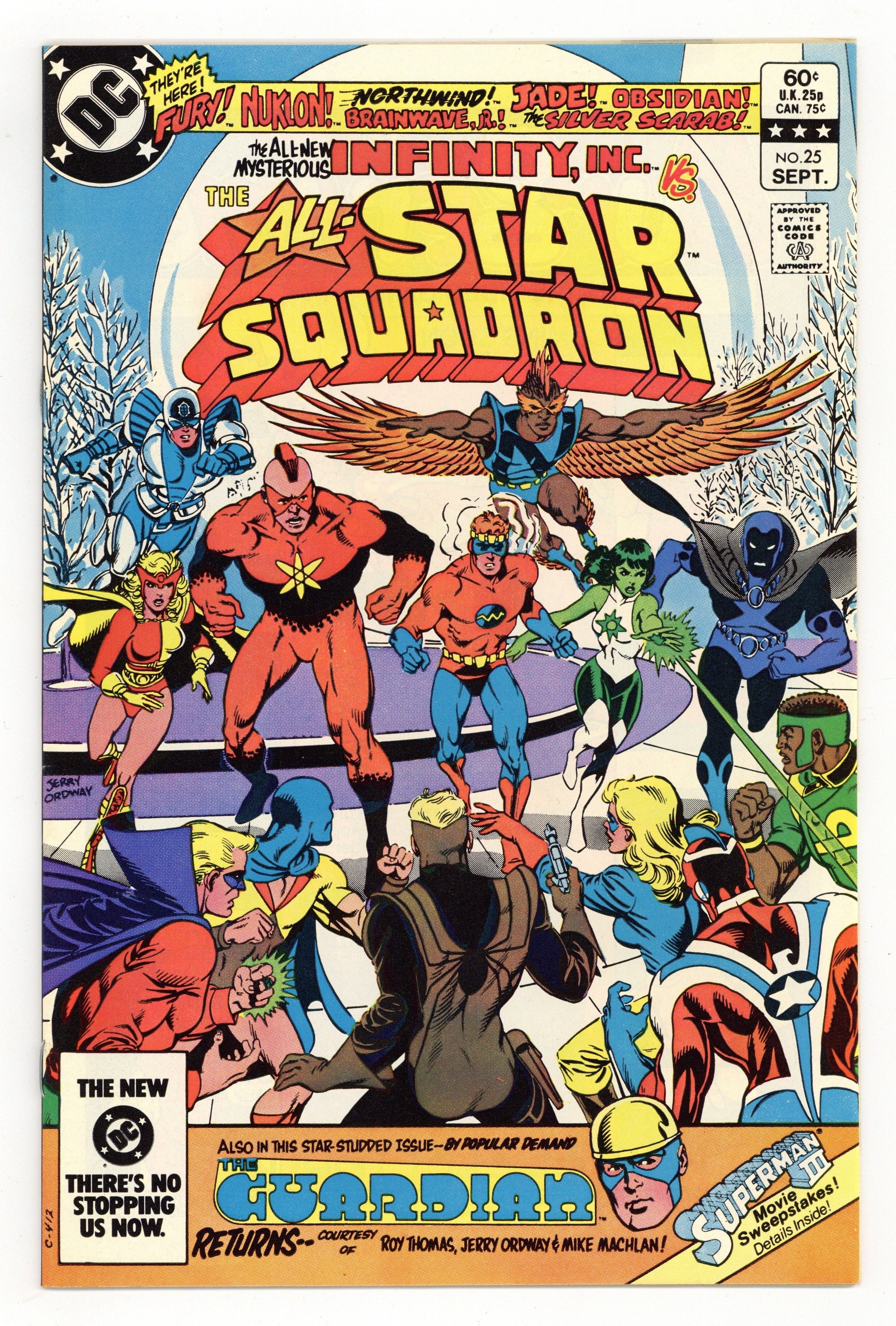 Direct Edition. Cover art by Jerry Ordway. The Infinity Syndrome!, script by Roy Thomas, pencils by Jerry Ordway, inks by Mike Machlan; the All-Star Squadron continue battling the Amazing Man; while at the War Department in Washington, the JSA learns of the Ultra-Humanite's plan to attack U.S. defense plants; the Amazing Man agrees to team with the All-Stars against the Ultra-Humanite. Letter from Sheldon Mayer. 36 pgs. $0.60. Cover price $0.60.