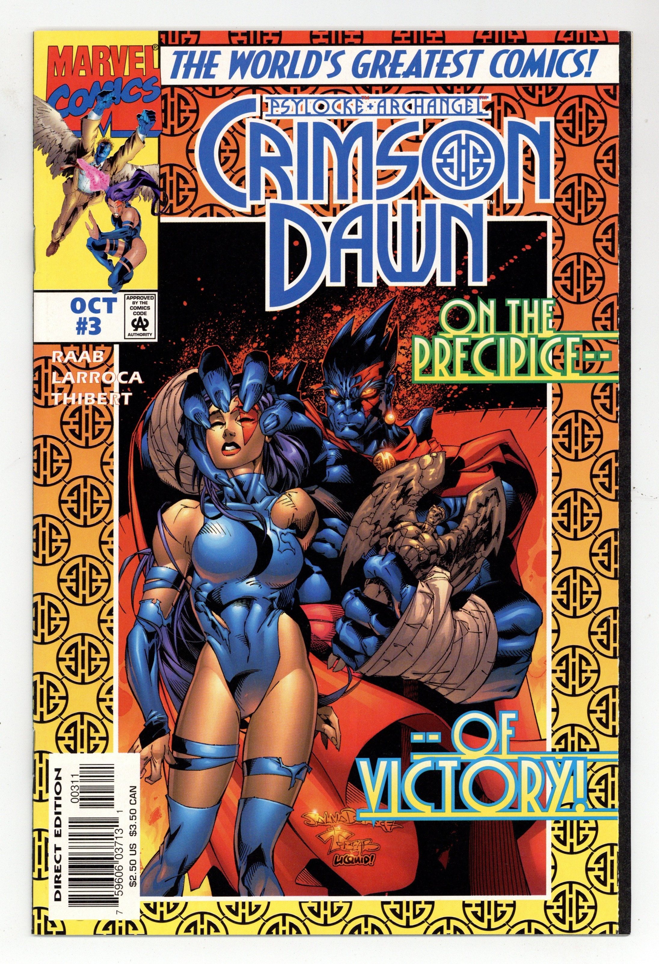 The shadowy Ultimate Undercloak wants to replace Psylocke, and if the mystical mite known as Gomurr can't help Archangel, she'll die! Written by Ben Raab. Art and cover by Salvador Larroca and Art Thibert. Cover price $2.50.