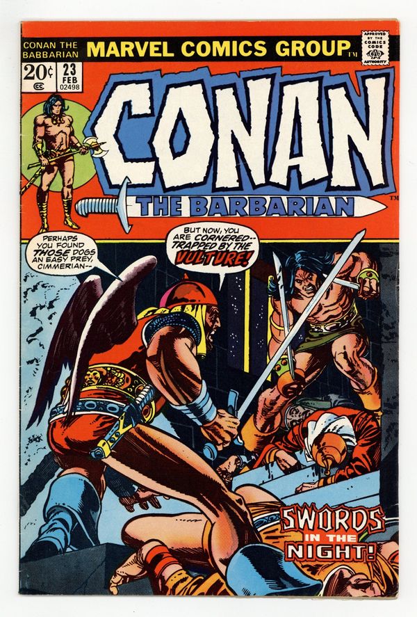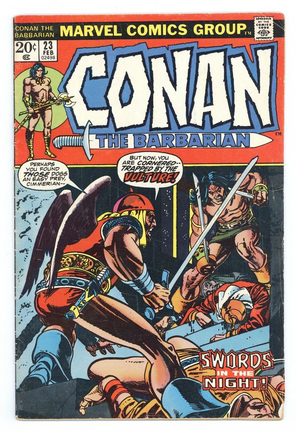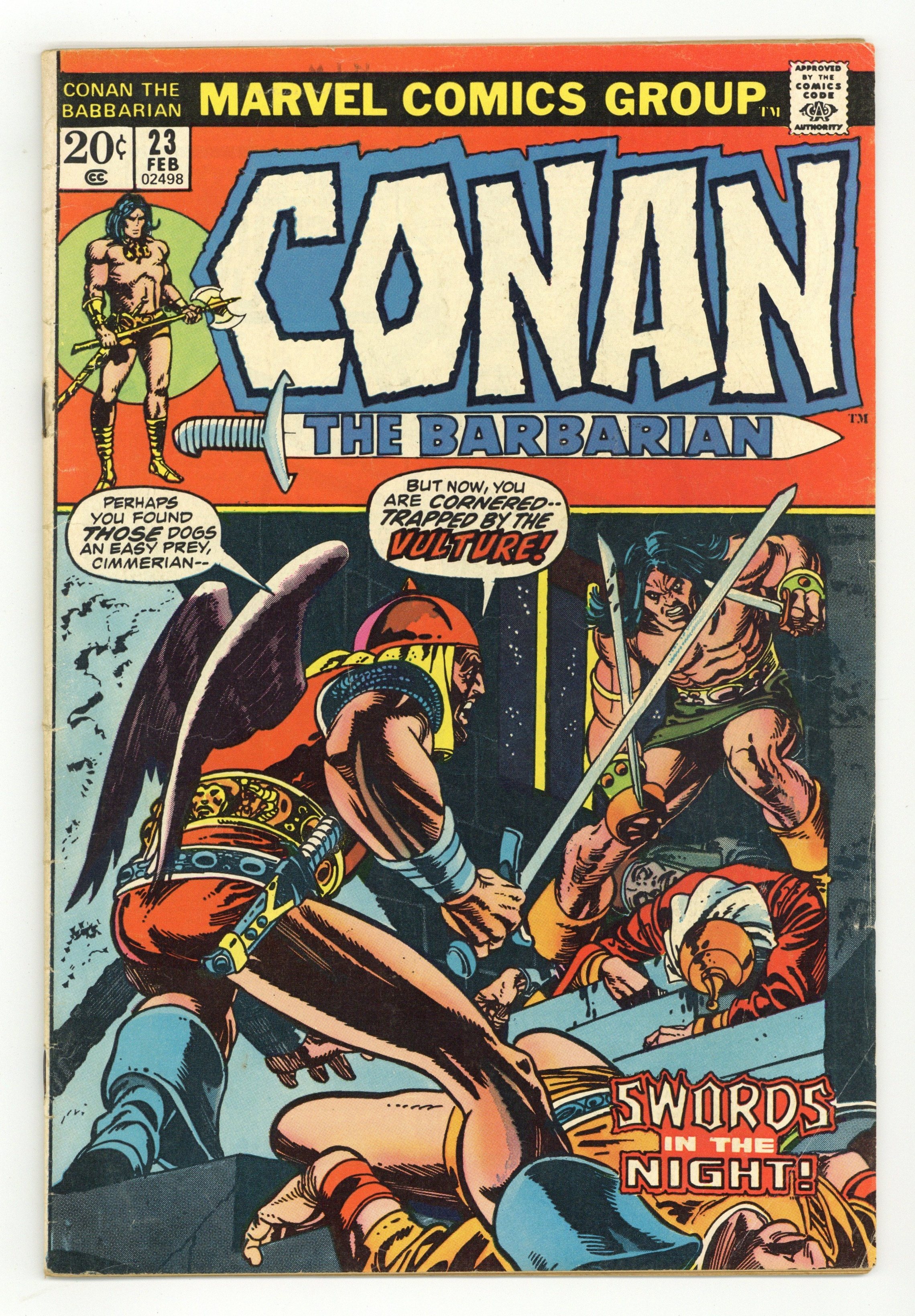 Tags: Marvel Legacy Numbering: Conan (part 23), Conan$95.00Cover art by Gil Kane. First appearance of Red Sonja in The Shadow of the Vulture, script by Roy Thomas, pencils by Barry Windsor-Wmith, inks by Sal Buscema, Dan Adkins, and Chic Stone; setting: Pah-Dishah, Makkalet; Conan delivers message from Makkalet to Pah-Disha; Red Sonja saves Conan's life twice; Conan kills Mikhal Oglu (vulture) and sends his head to Yezdigerd; adapted from the non-Conan story by Robert E. Howard featuring a female warrior, Red Sonya. 36 pgs. Cover price $0.20. Cover price $0.20.