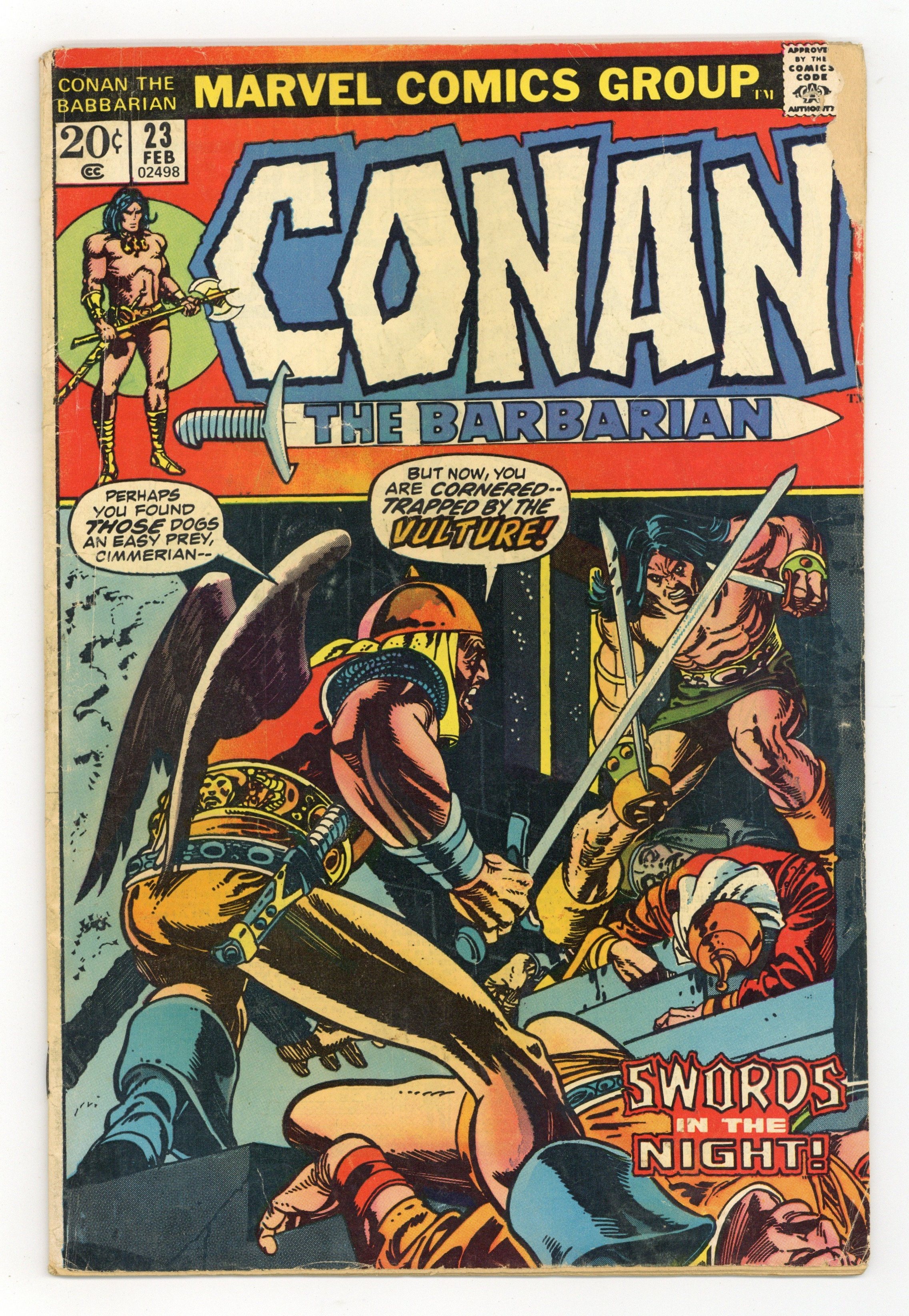 Cover art by Gil Kane. First appearance of Red Sonja in The Shadow of the Vulture, script by Roy Thomas, pencils by Barry Windsor-Wmith, inks by Sal Buscema, Dan Adkins, and Chic Stone; setting: Pah-Dishah, Makkalet; Conan delivers message from Makkalet to Pah-Disha; Red Sonja saves Conan's life twice; Conan kills Mikhal Oglu (vulture) and sends his head to Yezdigerd; adapted from the non-Conan story by Robert E. Howard featuring a female warrior, Red Sonya. 36 pgs. Cover price $0.20. Cover price $0.20.