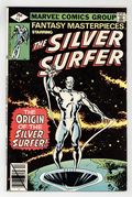 Direct Edition. Reprints Silver Surfer (1969 1st Series) #1. "The Origin of the Silver Surfer!" Cameos by the Incredible Hulk, Doctor Doom, and the Fantastic Four. Written by Stan Lee. Art by John Buscema and Joe Sinnott. Many years ago, in order to prevent the total annihilation of his civilization and homeworld, Norrin Radd bargained with the Devourer of Worlds. Imbued with the Power Cosmic, he became the Silver Surfer and Herald of Galactus. However, on the fateful day he arrived on Earth, for love of humanity, he betrayed his master, and thus was cursed to never traverse the space-ways again. This is his story. Cover price $0.75.