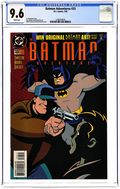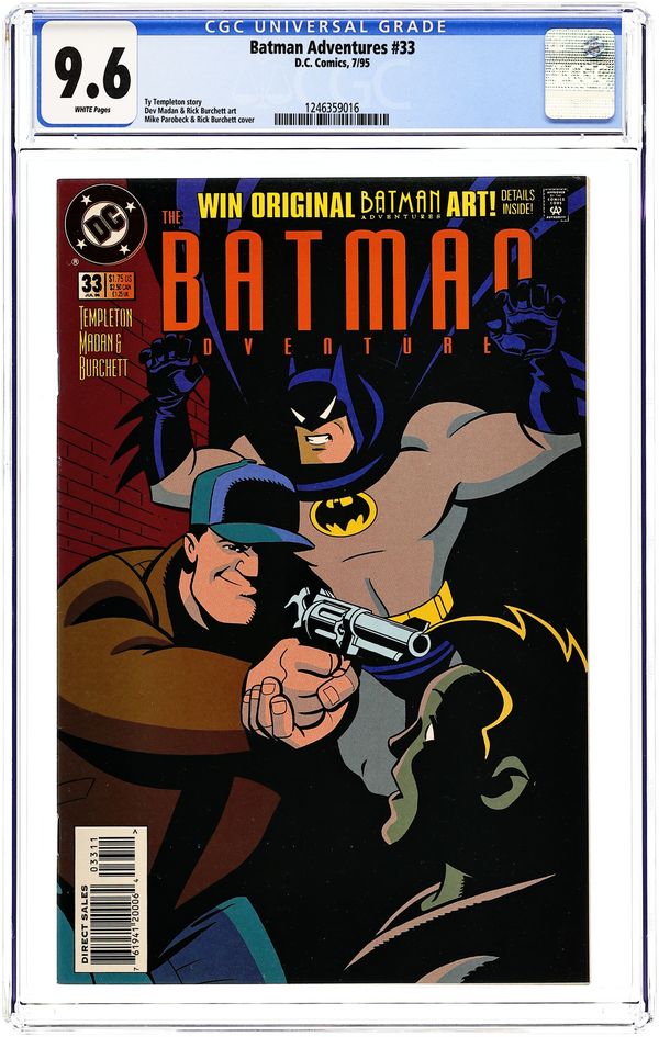 "Just Another Night." While Bruce Wayne is on a movie date with his girlfriend and her son, a gun-wielding crook steps in, echoing Batman's origin story in poignant fashion. Based on Batman The Animated Series. Script by Ty Templeton, pencils by Dev Madan, inks by Rick Burchett. Cover by Mike Parobeck and Rick Burchett. Cover price $1.75.