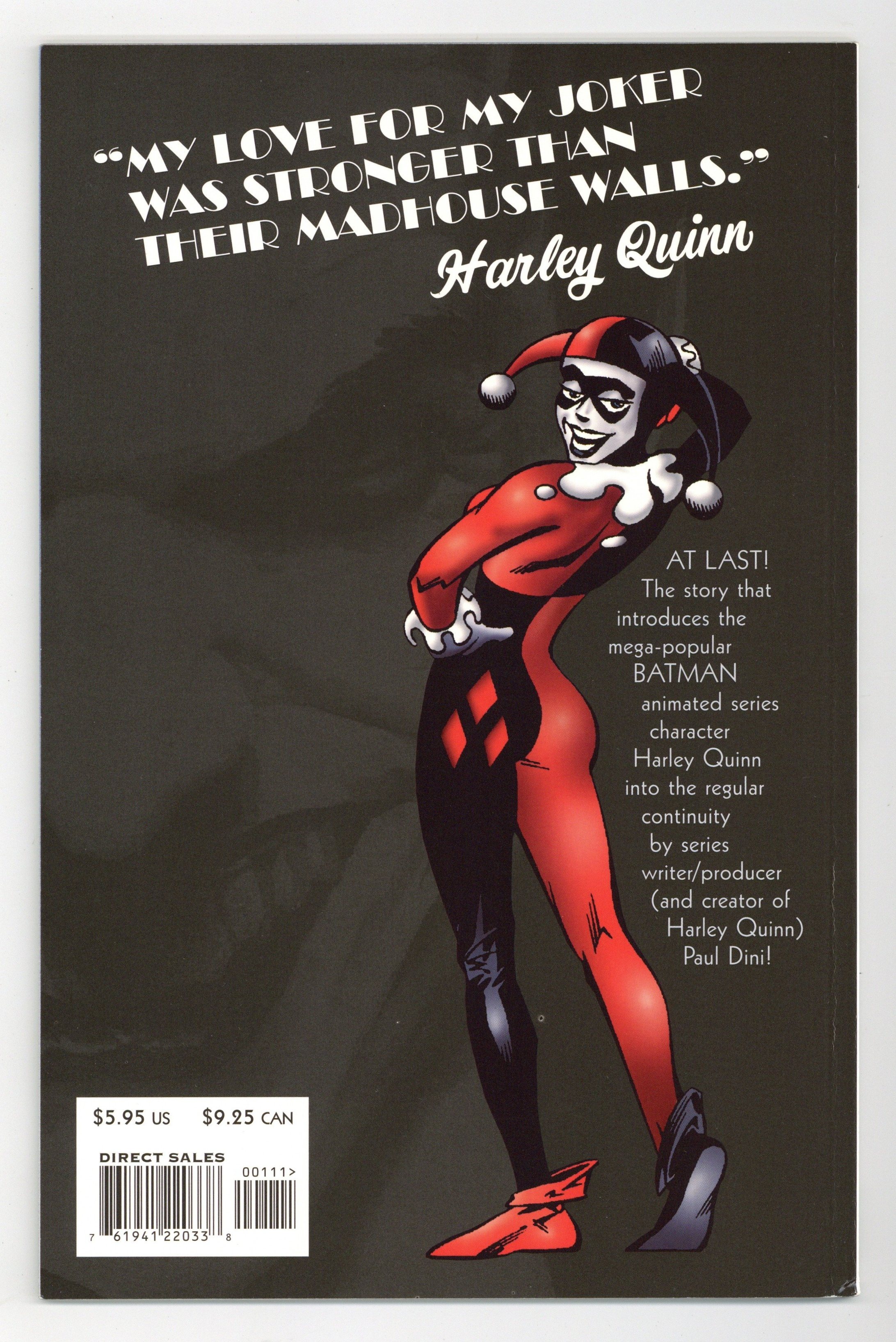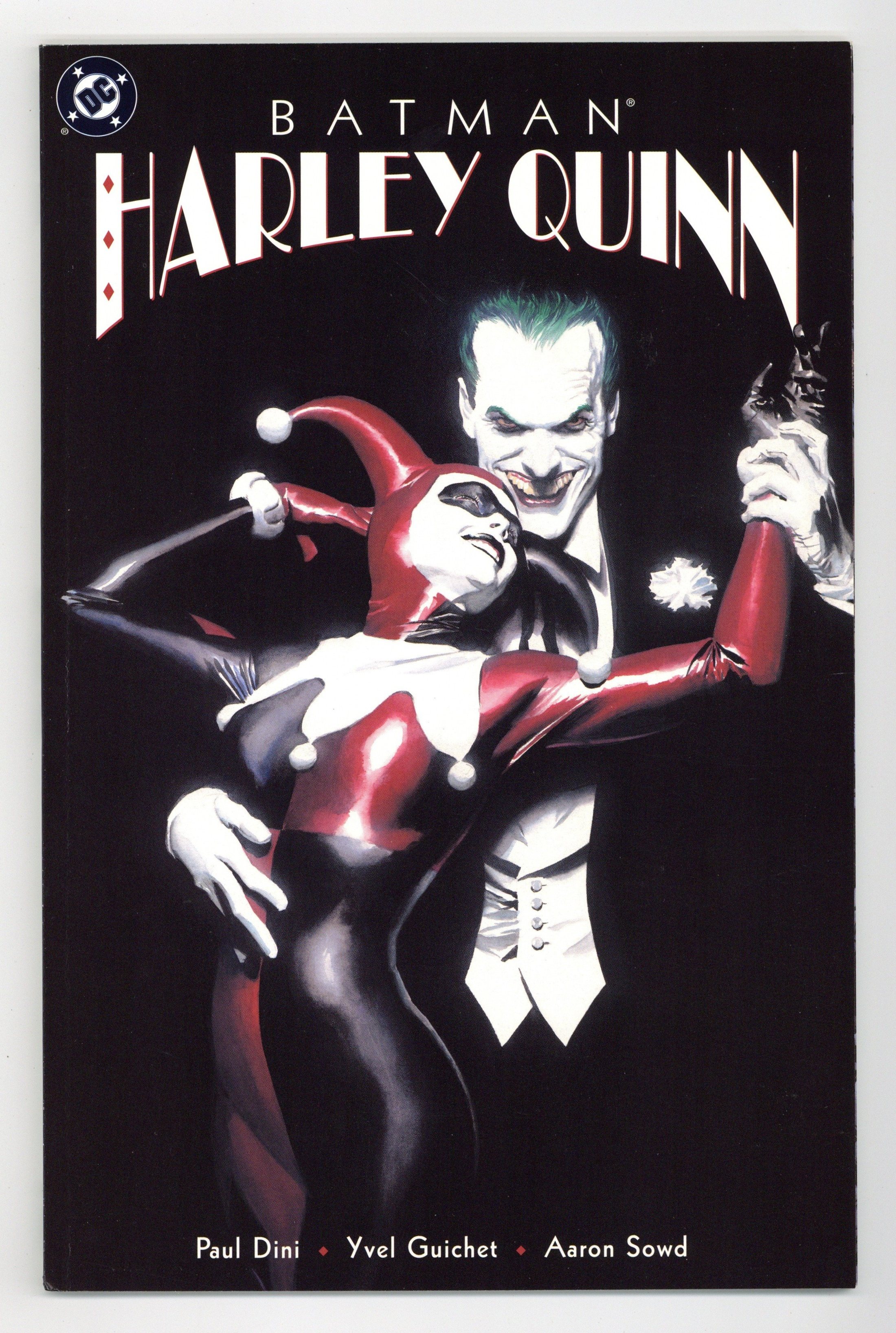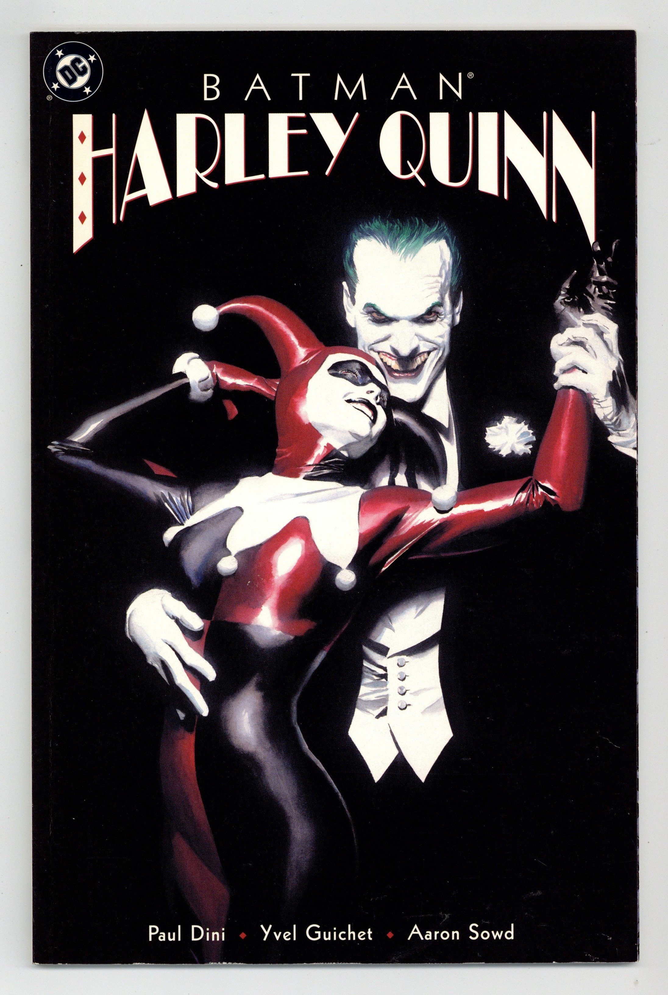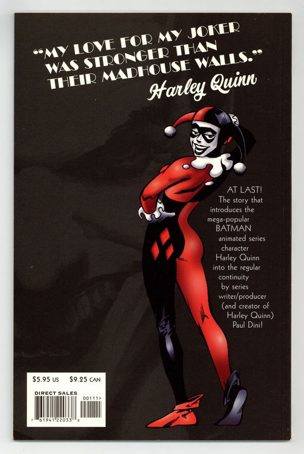 Tags: Batman No Man's Land (part 41)$210.001st Printing (2nd and 3rd printings have 2nd and 3rd printing notices on inside front cover). Written by Paul Dini; art by Yvel Guichet and Aaron Sowd; painted cover by Alex Ross. The most popular character introduced in Batman's animated adventures enters the DC Universe and "No Man's Land" in a Prestige one-shot written by Harley's creator, Paul Dini (SUPERMAN: PEACE ON EARTH), with a painted cover by PEACE ON EARTH's Alex Ross and stunning interiors by Yvel Guichet and Aaron Sowd. Since Gotham's fall, the Joker has been relatively quiet...but that's about to change as former Arkham Asylum doctor Harleen Quinzel joins the Clown Prince of Crime to put him back on top. But when their unusual partnership leaves Harley a little worse for wear, she enlists Poison Ivy's help. Now the Joker and Batman are going to learn that this souped-up Harley's not going to be pushed around anymore. Prestige Format. FC, 52 pg.$5.95" Batman No Man's Land Cover price $5.95.