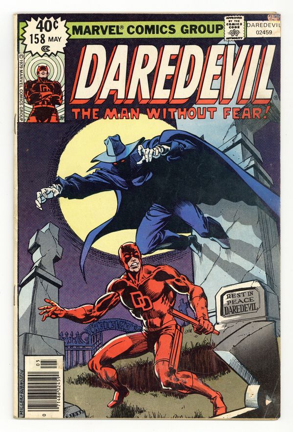First Frank Miller Daredevil. First 40-cent cover price. Cover pencils by Frank Miller, inks by Joe Rubinstein. A Grave Mistake!, script by Roger McKenzie (Death-Stalker origin on page 7 plotted by Marv Wolfman), pencils by Frank Miller , inks by Klaus Janson.; Matt is captured by the Ani-Men and has a final showdown with Death-Stalker in a graveyard; the Unholy Three (Ape Man, Bird Man, Cat Man) appear. This issue contains a statement of ownership--average print run 393,978; average paid circulation 111.559. Miller/Joe Rubinstein cover. 36 pgs. Cover price $0.40. Cover price $0.40.