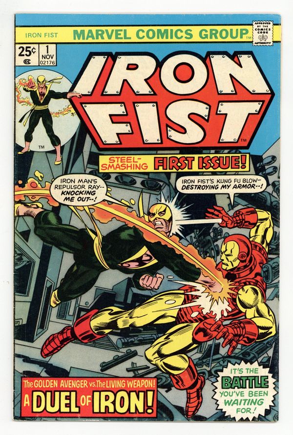 "A Duel of Iron!" Guest-starring Iron Man and Misty Knight. Story by Chris Claremont. Art by John Byrne and Al Williams. Story continued from Marvel Premiere #25. Daniel Rand was reborn in the fires of a dragon's heart in the mystical land of K'un Lun. Now, he is the living weapon known as Iron Fist, finally in his own series. Hot on the trail of Colleen Wing's kidnappers, Iron Fist has come to Stark International seeking answers. Wanted by the police for a murder he did not commit, Danny comes face-to-face with the Invincible Iron Man, and Shell Head is in no mood to give a wanted man the benefit of the doubt. It's the Golden Avenger vs. the Living Weapon. Marvel Value Stamp. Cover price $0.25.