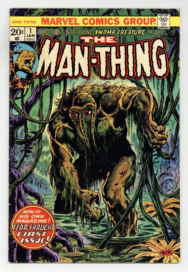 $150.00"Battle for the Palace of the Gods!" Written by Steve Gerber. Art by Val Mayerik and Sal Tarpani. Cover by Frank Brunner. Now in its own magazine - the macabre Man-Thing, the most startling sawmp-creature of all! 32 pages, FC. NOTE: 2nd appearance of Howard the Duck. Cover price $0.20.