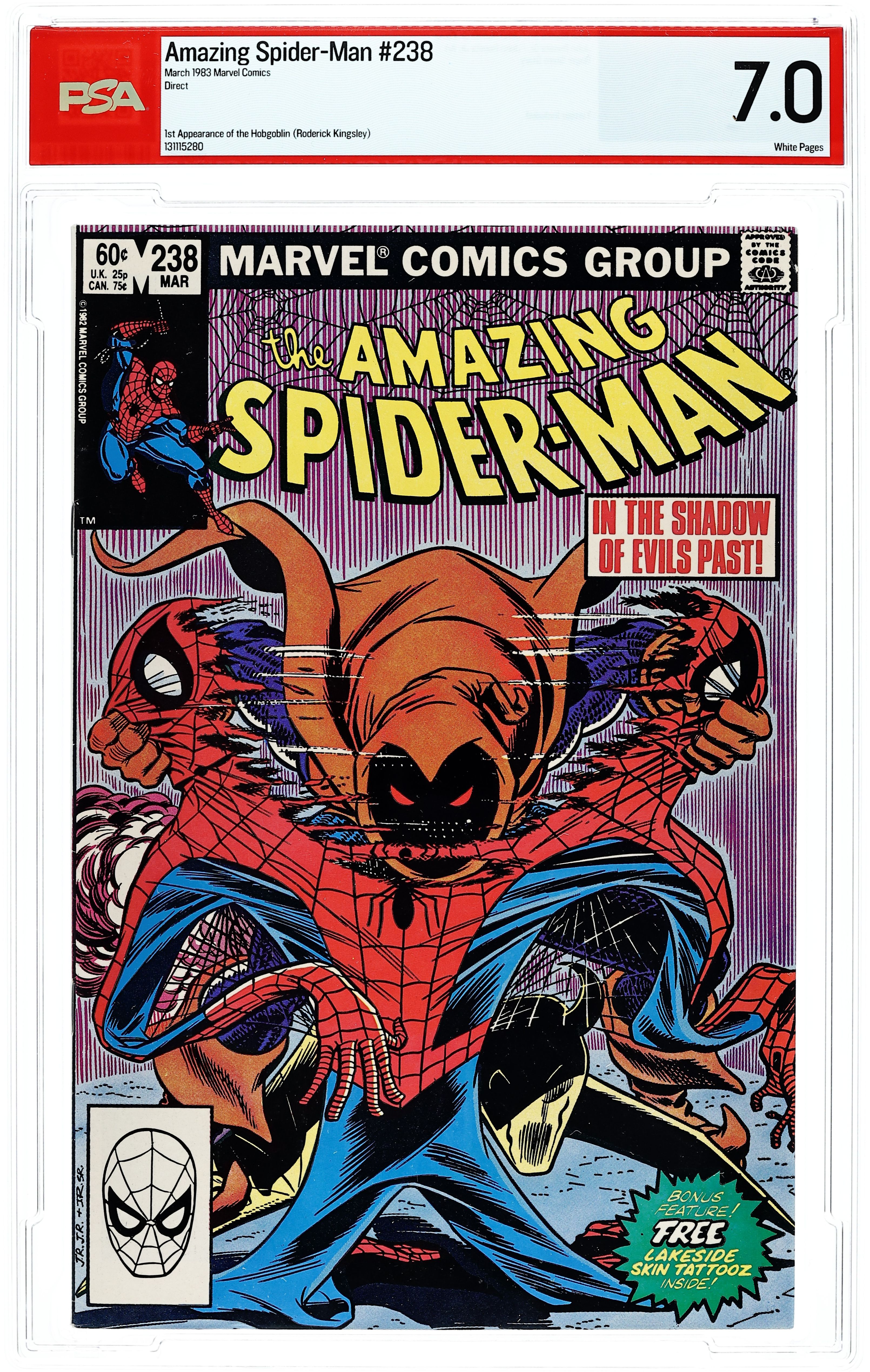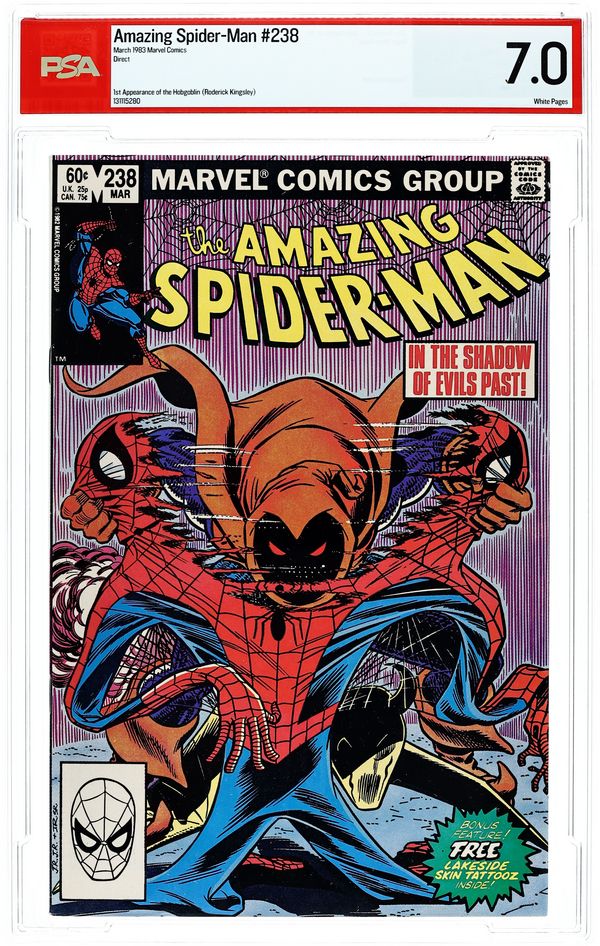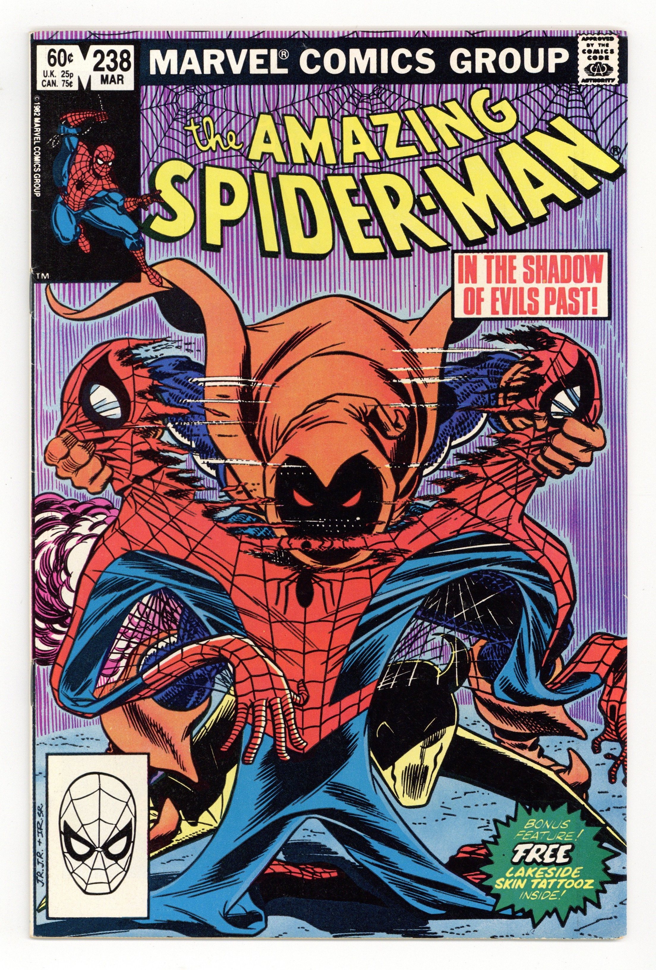 IMPORTANT: Issue 238A HAS the Lakeside Skin Tattooz insert. Direct Edition. First appearance of the Hobgoblin in "Shadow of Evils Past!" Script by Roger Stern. Art by John Romita Jr. (breakdowns) and John Romita Sr. (finishes). Cover by John Romita Jr. and John Romita Sr. One of the landmark issues of the Amazing Spider-Man! And the beginning of the long secret identity mystery of the Hobgoblin! After escaping from the web-slinger, a bank robber stumbles upon an underground hideout of the (deceased) Green Goblin! Not knowing what to do with his discovery, the small-time hood shows the secret lair to an underworld associate! Unfortunately for the wondrous wall-crawler, the devious associate knows exactly what to do: resurrect the Green Goblin...with a twist! And a short time later a new super-villain is born! The Hobgoblin! Cameo appearance by Mary Jane Watson. Flashback cameo by Norman Osborn (aka the Green Goblin). (Notes: The secret identity of the original Hobgoblin takes many twists and turns over the next decade. Who actually operates as the Hobgoblin in this issue is revealed in the Spider-Man: Hobgoblin Lives (1997) Limited Series (written by Roger Stern). This issue was reprinted in Marvel Tales 257 and also in the 1992 trade paperback: the Amazing Spider-Man -- Origin of the Hobgoblin.) 36 pages. Cover price $0.60.