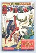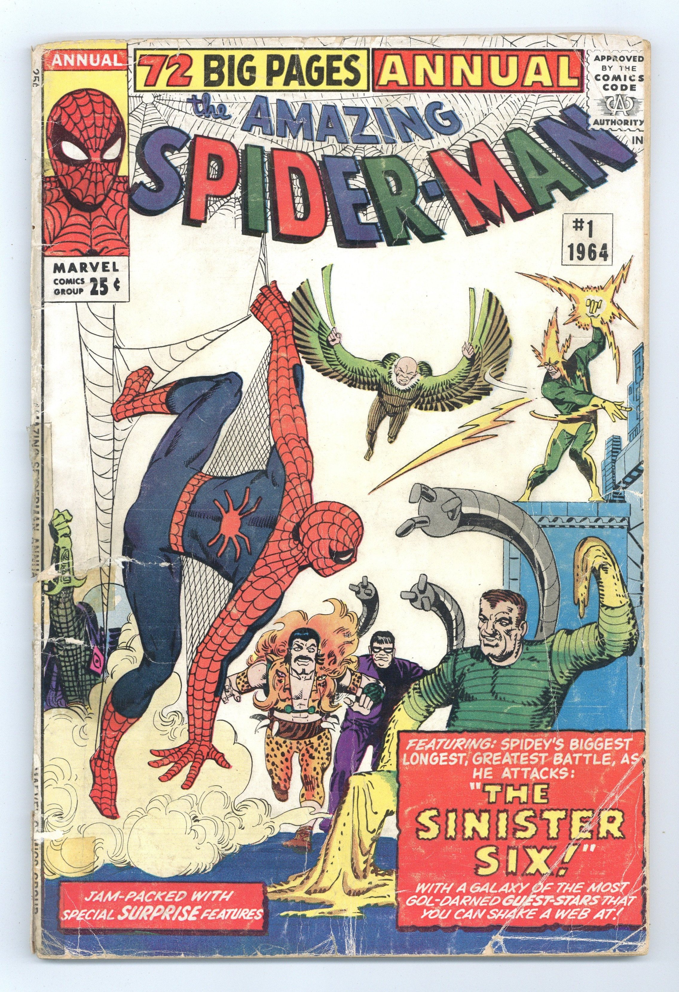 Cover art by Steve Ditko. First appearance of the Sinister Six (Doctor Octopus, Electro, Kraven the Hunter, Mysterio, Sandman, and the Vulture) in a new 41-page story, "The Sinister Six!" Script by Stan Lee, art by Steve Ditko; Dr. Octopus organizes the Sinister Six, composed of other Spider-Man Villains; They capture Betty Brant and Aunt May and force Spider-Man to rescue them. Cameos by the X-Men, the Fantastic Four, Captain America, Thor, Iron Man, Iron Man, Giant Man, and the Wasp. Lots of back-up features (all art by Ditko): 14 pages of pin-ups (Spider-Man's most famous foes); 9-page "The Secrets of Spider-Man"; 3-page "How Stan Lee and Steve Ditko Create Spider-Man!"; and other miscellaneous pin-ups. Giant 76-page issue! Most of this issue reprinted in Marvel Tales # 150. 76 pgs., full color. Cover price $0.25.