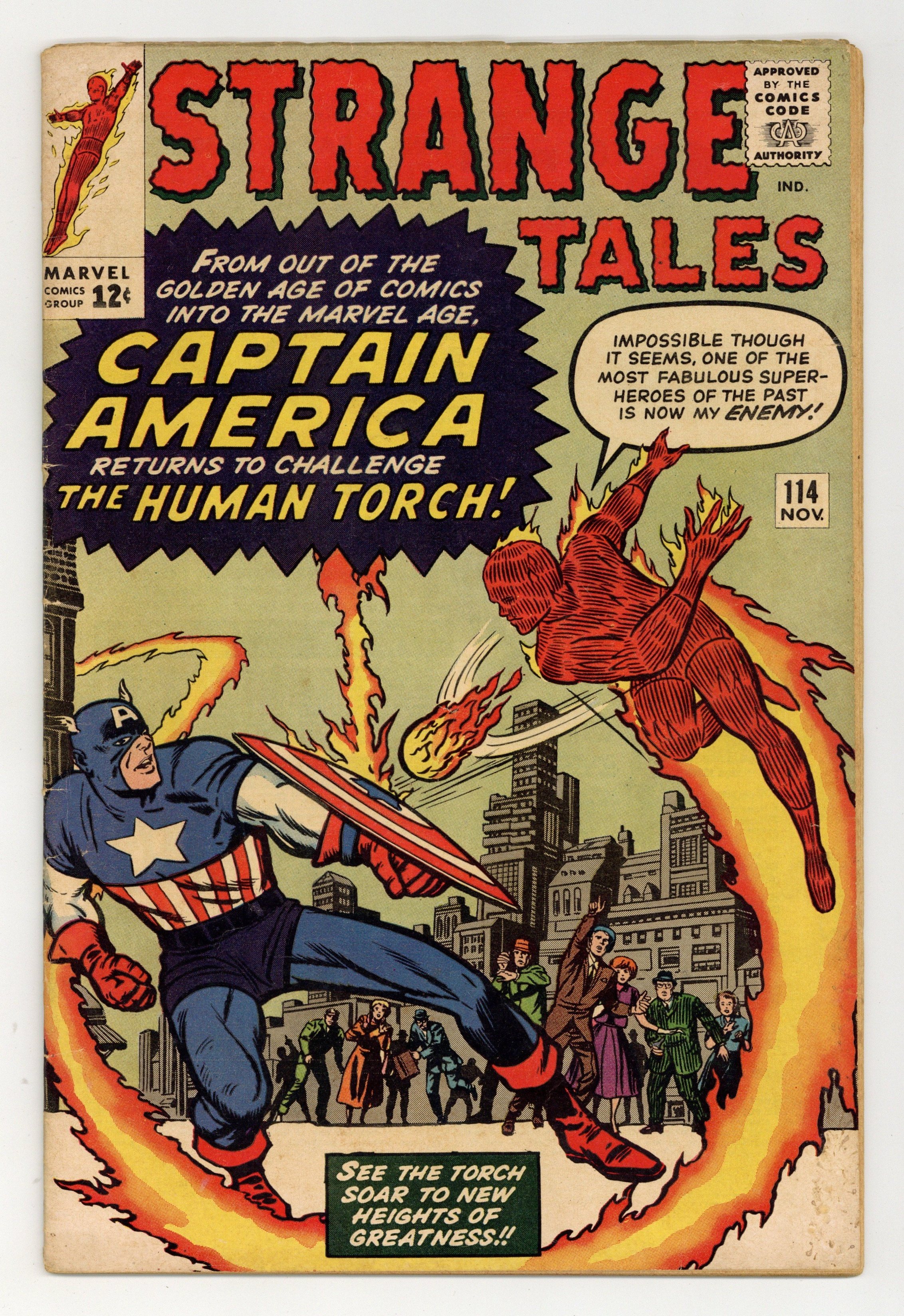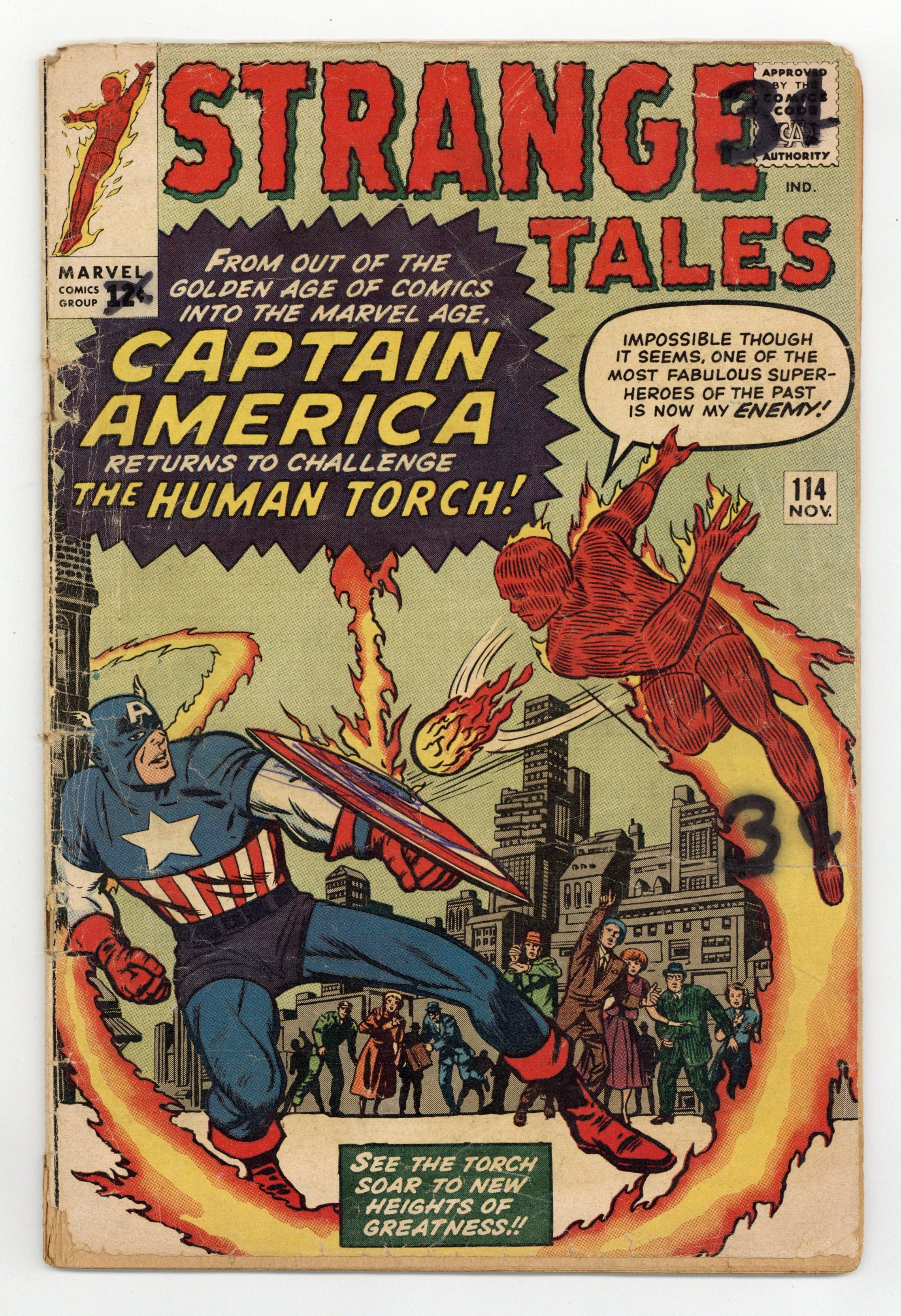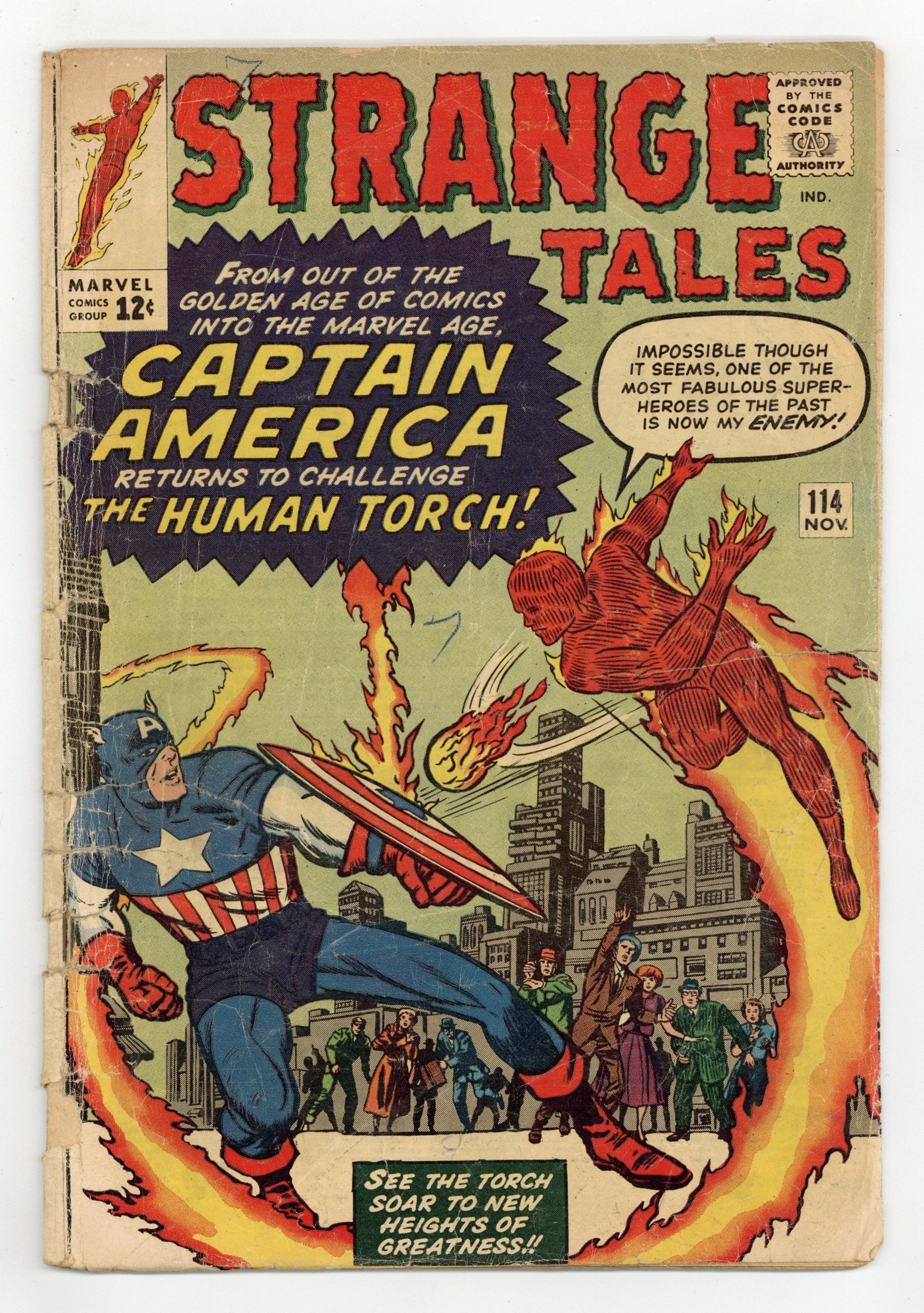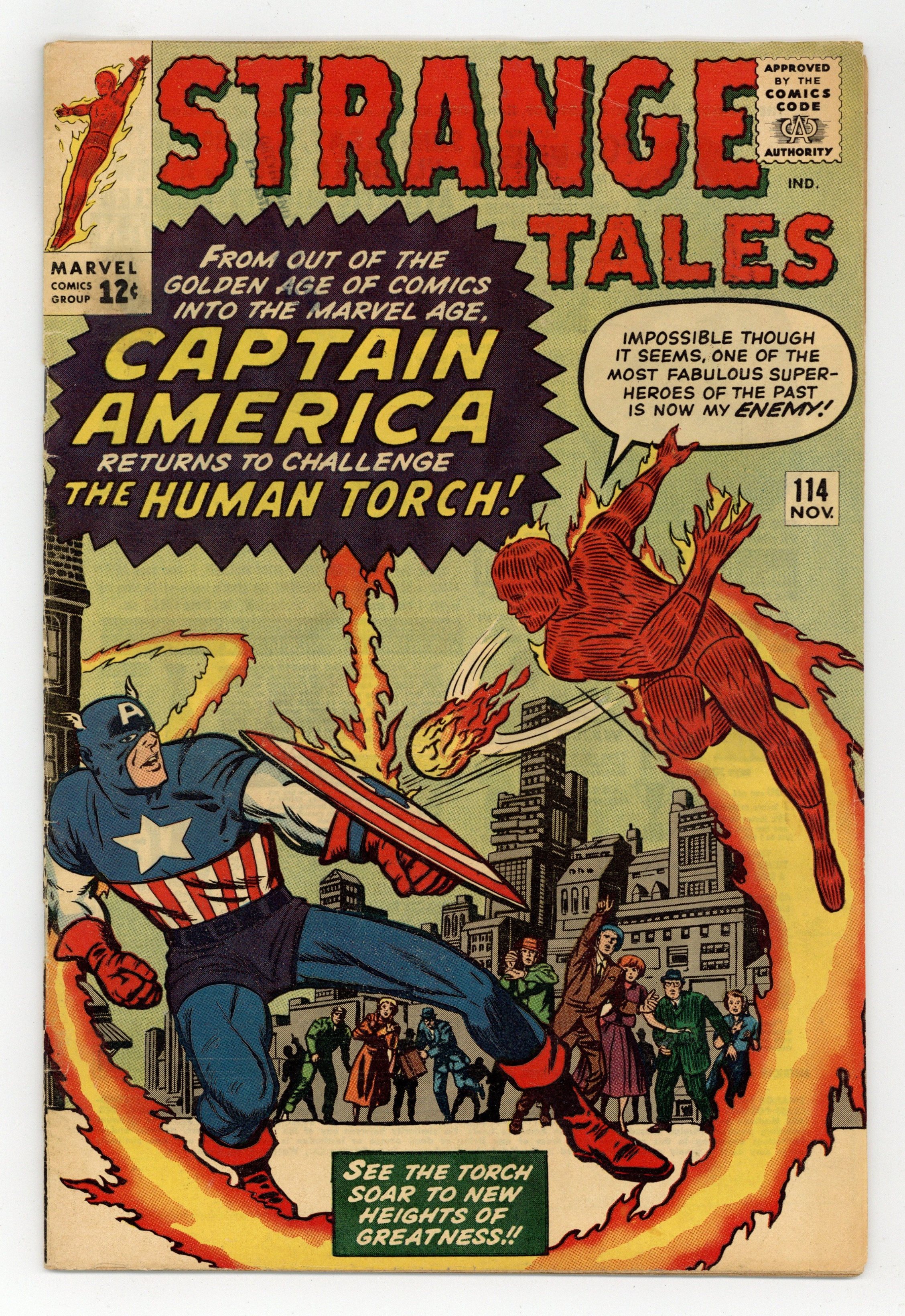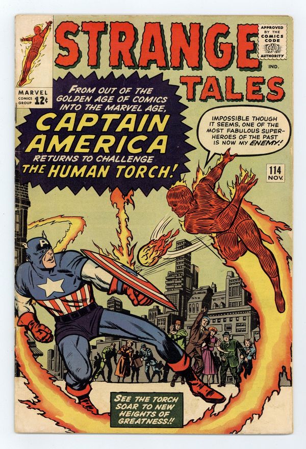 Starts Jan 3 Cover pencils by Jack Kirby, inks by Dick Ayers. "The Human Torch Meets... Captain America", script by Stan Lee (co-plot, dialogue) and Jack Kirby (co-plot, uncredited), pencils by Jack Kirby, inks by Dick Ayers; The Human Torch is upstaged by the return of Captain America, but the Torch realizes that it is his old enemy the Acrobat in disguise and defeats him; This is the first appearance of Captain America since the Golden Age (though it's actually the Acrobat from issue 106 disguised as the hero). "The Bridge" text story. Third appearance of Dr. Strange in "The Return of the Omnipotent Baron Mordo!", script by Stan Lee and Steve Ditko (co-plot), pencils by Steve Ditko, inks by George Roussos; Strange is lured into a trap in England by Baron Mordo, but defeats him with the help of a woman with latent magical talents; First appearance of Victoria Bentley. 36 pgs., full color. Cover price $0.12.