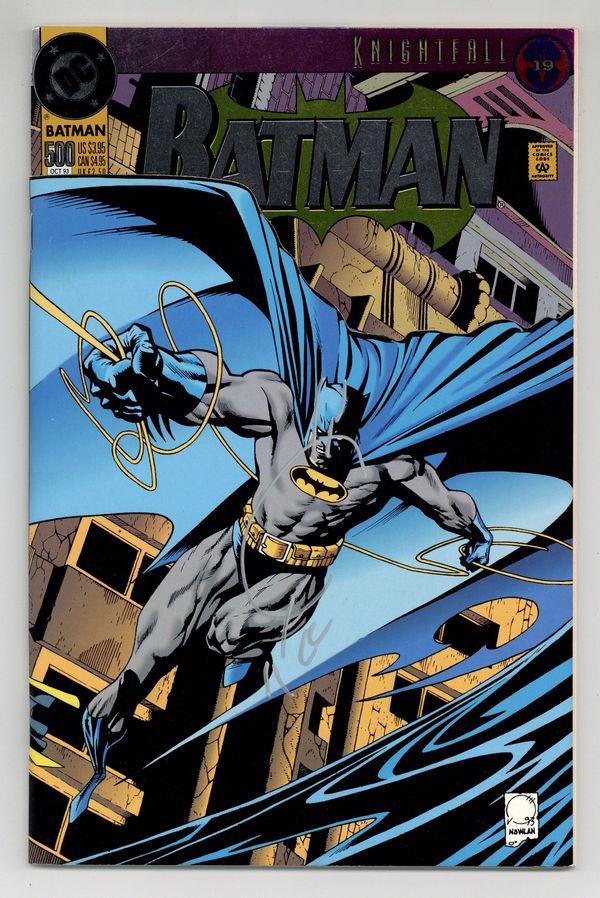 THIS COMIC IS NOT POLYBAGGED. Wraparound die-cut cover by Joe Quesada & Kevin Nowlan. KnightFall Part 19. The concluding chapter of KnightFall finds Batman (Jean-Paul Valley) determined to break Bane the way the villain broke his predecessor in "Dark Angel." Nightwing cameo. Written by Doug Moench. Art for Chapter 1 ("The Fall") by Jim Aparo & Terry Austin. Art for Chapter 2 ("The Descent") by Mike Manley. Comes with 2 postcards: 'Classic Batman' by Jim Aparo and 'The New Batman' by Mike Manley. 68 Pages, Full Color. Cover price $3.95.