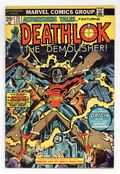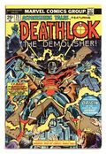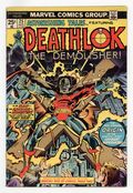 $45.00This issue not only marks George Perez's first pro comic art, but the first appearance of Deathlok! Cover pencils by Rich Buckler, inks by Klaus Janson. A Cold Knight's Frenzy, script by Rich Buckler (Plot; Concept) and Doug Moench (Script), pencils by Rich Buckler, inks by Rich Buckler (Primary Inks), Klaus Janson (Ink Assist), Al Milgrom (Ink Assist), and Mike Esposito (Ink Assist); Deathlok is shown to be a robot with a human mind that has the ability to override its programming; Deathlok has a flashback showing that his old army buddy Major Simon Riker is responsible for his creation. Stan Lee's Soapbox, art by Rich Buckler. Creation of Deathlok article, art by Rich Buckler. Promo for Giant-Size Spider-Man #1. Deathlok creation satire, script by Doug Moench, pencils by George Perez, inks by Mike Esposito; George Perez' first published work. Marvel Value Stamp #68 featuring Daimon Hellstrom [Son of Satan]. 36 pgs. $0.25. Cover price $0.25.