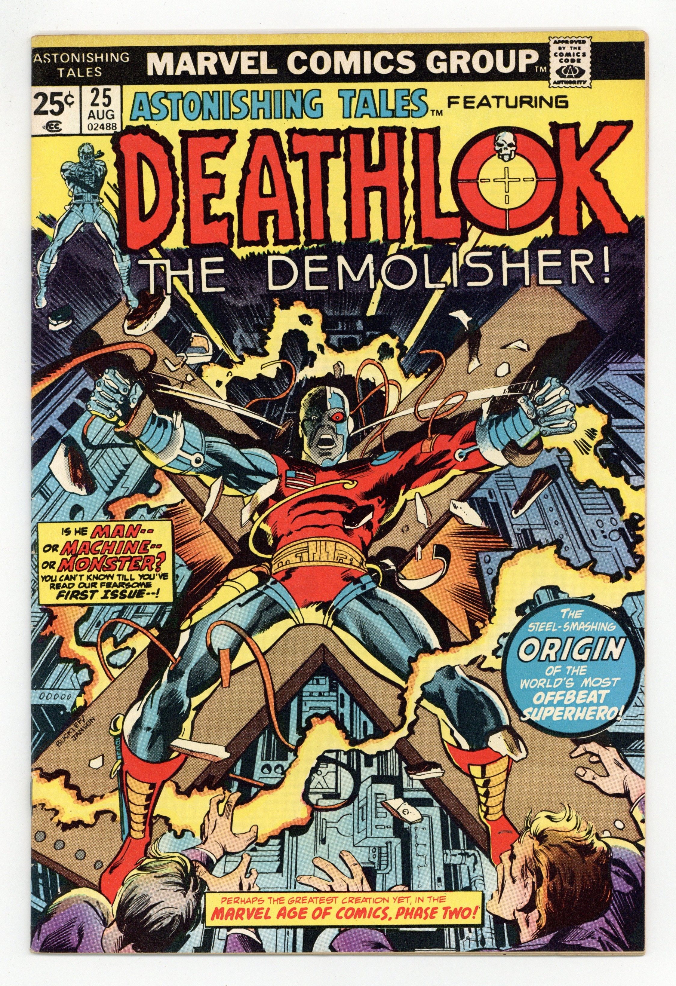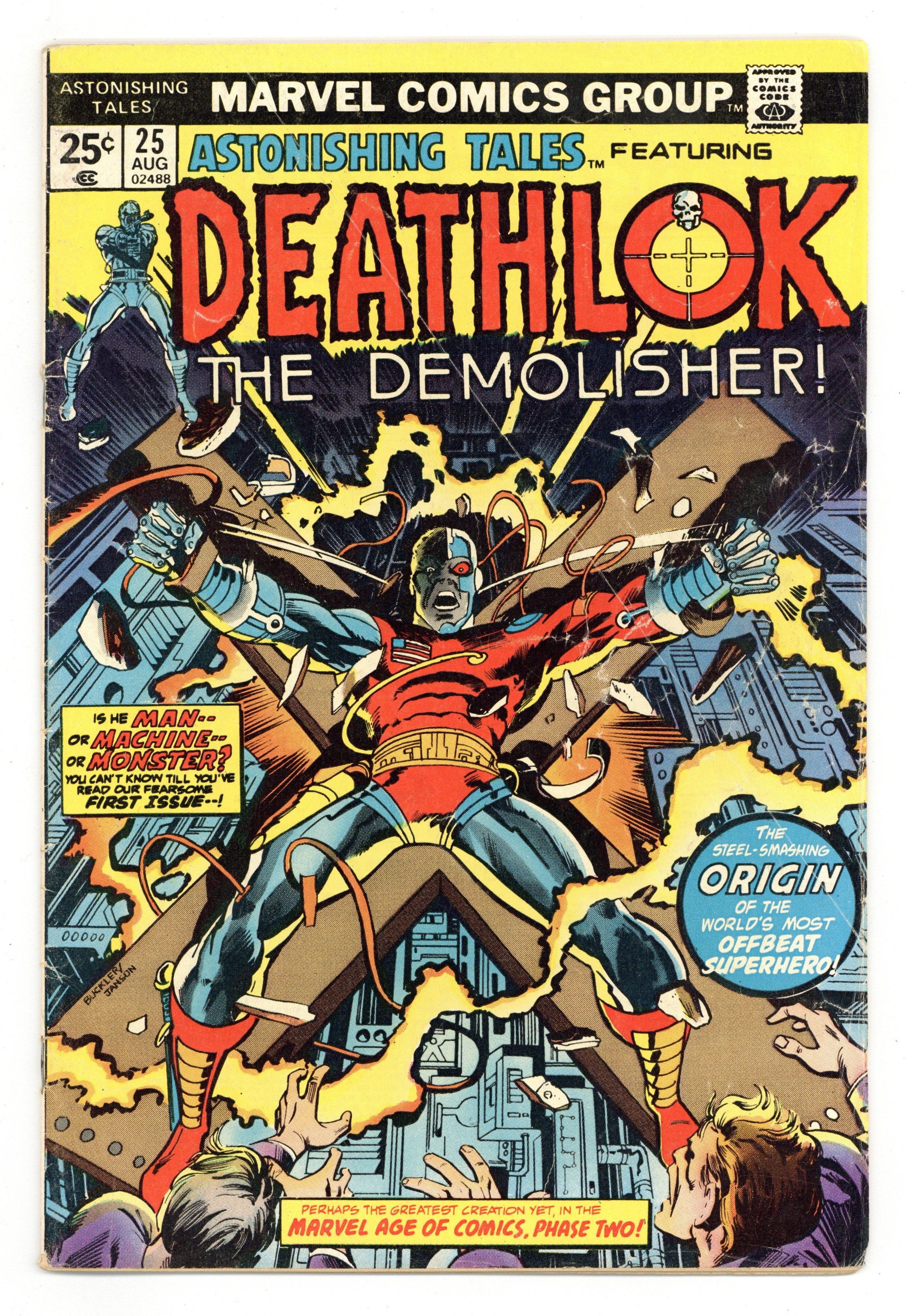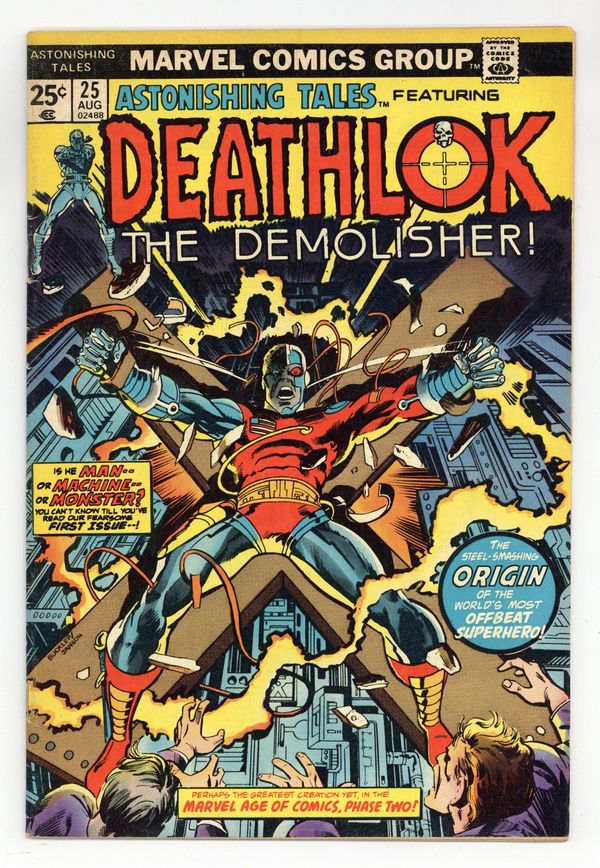 This issue not only marks George Perez's first pro comic art, but the first appearance of Deathlok! Cover pencils by Rich Buckler, inks by Klaus Janson. A Cold Knight's Frenzy, script by Rich Buckler (Plot; Concept) and Doug Moench (Script), pencils by Rich Buckler, inks by Rich Buckler (Primary Inks), Klaus Janson (Ink Assist), Al Milgrom (Ink Assist), and Mike Esposito (Ink Assist); Deathlok is shown to be a robot with a human mind that has the ability to override its programming; Deathlok has a flashback showing that his old army buddy Major Simon Riker is responsible for his creation. Stan Lee's Soapbox, art by Rich Buckler. Creation of Deathlok article, art by Rich Buckler. Promo for Giant-Size Spider-Man #1. Deathlok creation satire, script by Doug Moench, pencils by George Perez, inks by Mike Esposito; George Perez' first published work. Marvel Value Stamp #68 featuring Daimon Hellstrom [Son of Satan]. 36 pgs. $0.25. Cover price $0.25.