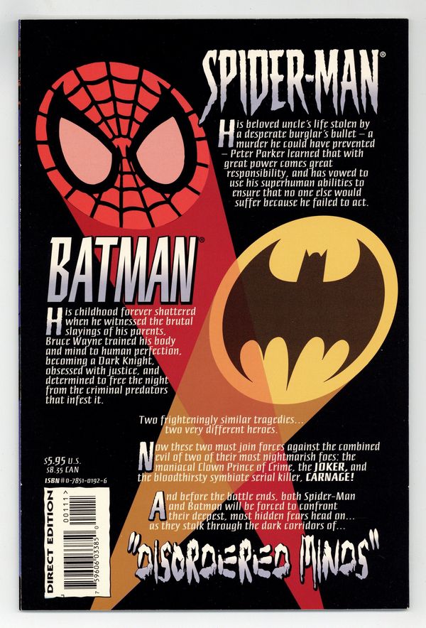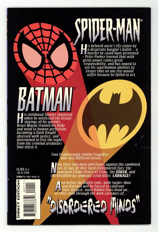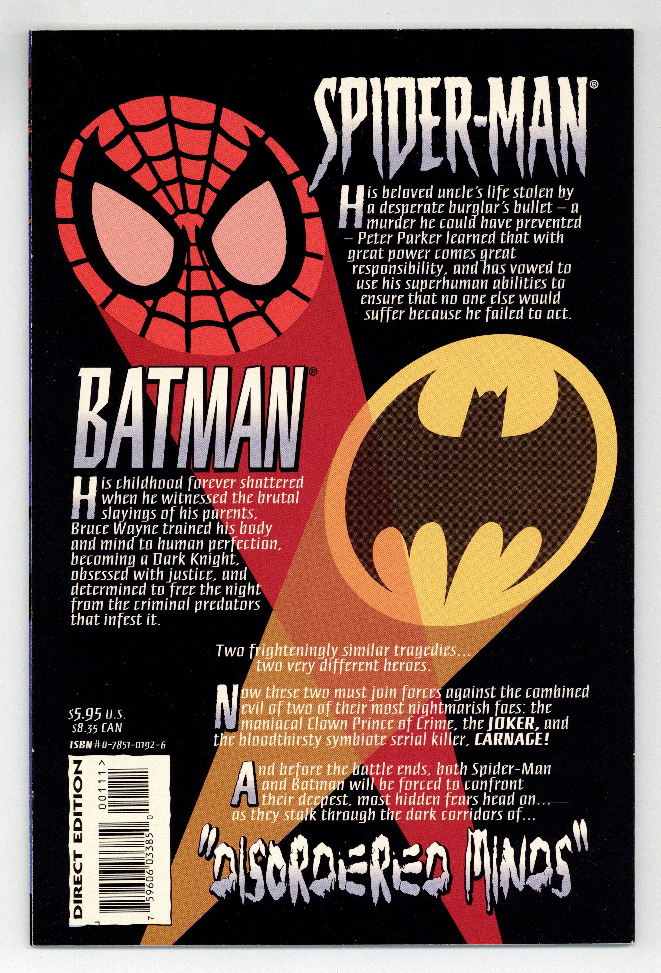 Direct Edition. "Disordered Minds!" Story by J.M. DeMatteis. Art by Mark Bagley, Scott Hanna, and Mark Farmer. Two of comic's biggest icons must team-up to take down two of their craziest villains. Can Batman, the Dark Knight Detective, and the Amazing Spider-Man set aside their differences long enough to stop the maniacal machinations of the psychotic Carnage and the Joker, Clown Prince of Crime? Squarebound edition with embossed cover. Cover price $5.95.