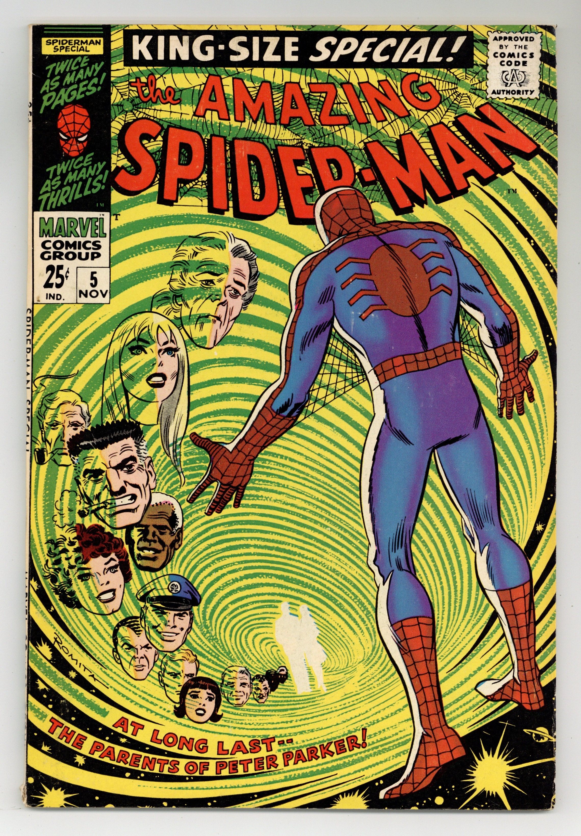 First printing and first appearances of Richard Parker and Mary Parker in an all-new 40-page story "The Parents of Peter Parker!" Script by Stan Lee. Pencils by Larry Lieber. Inks by Mike Esposito (aka Mickey Demeo). Consulting by John Romita (layouts). Cover by John Romita. While moving an old trunk in his Aunt's house, Peter finds pictures and newspaper clippings of his deceased parents. Apparently they were considered traitors by the U.S. government before their deaths in a plane crash in Algeria almost two decades ago. After Aunt May provides a few more details, Peter vows to uncover the truth about his parents! To that end the web-slinger links up with the Fantastic Four and flies to North Africa! In the middle of the Kasbah, the Amazing Spider-Man finally comes face-to-face with the man who framed his parents: the sinister Red Skull! Wow, can the wall-crawler exonerate his parents and change his family legacy forever? Or will the spectacular son meet the same fate as his father...at the hands of the Red Skull? A terrific story! Cameo appearances by the Human Torch, Mr. Fantastic, and the Thing. Flashback cameo by Ben Parker. (Notes: This story features the second Red Skull (aka Albert Malik). He appears many years later in Solo Avengers 6 and Captain America 347.) First backup feature: "A Day at the Daily Bugle" One-page illustration of the Daily Bugle newsroom with J. Jonah Jameson, Joe Robertson, Ned Leeds, and Betty Brant. Script by Stan Lee. Pencils by Larry Lieber. Inks by Mike Esposito. Assists by John Romita. Second backup feature: "Peter Parker, the Super Sports Star!" Two-page illustration of the web-slinger as a baseball player and football player. Third backup feature: "Where It's At" One-page drawing of Spider-Man's usual hangouts. Fourth backup feature: "This is Spidey as We Know Him, But--" Two-page illustration of other publications' characters dressed as Spider-Man. Fifth backup feature: "Here We Go-a-Plotting!" Three-page parody of the Marvel Bullpen starring Stan Lee, Larry Lieber, and John Romita. Script and Pencils by Marie Severin. Inks by Frank Giacoia. (Notes: The inside front cover features selected artwork from the story. The issue includes a full-page ad for Spectacular Spider-Man (1968) Magazine 2. A second printing of this issue was published in 1994 and only available through JC Penney stores. This story was reprinted in Marvel Tales 264 & 265.) 68 pages. 25 cent cover price. Cover price $0.25.