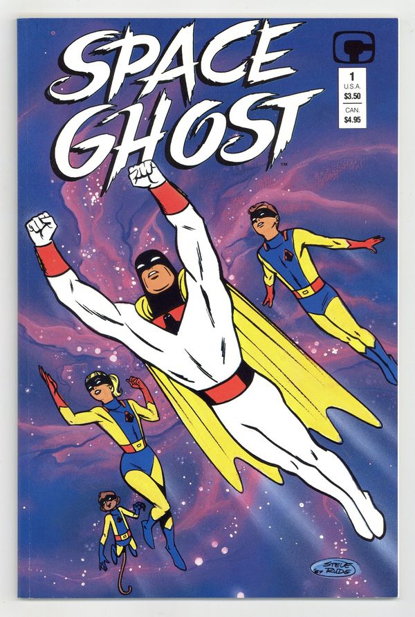 "The Sinister Spectre." Story by Mark Evanier and Steve Rude. Pencils, front and back cover by Steve Rude. Inks by Willie Blyberg. Painted color by Ken Steacy. A mysterious figure breaks Space Ghosts most dangerous foes out of Gaolworld. It will take the combined power and ingenuity of Space Ghost, Jan and Jace, and Blip the monkey to recapture them. However, even if they do, they still have to face the hooded figure who freed them. While the face behind that hood is the last one anyone would expect. Contains a 5 page article on the development of the original Space Ghost cartoons by Mark Evanier. 48 pages. Square bound. Full painted color. Cover price $3.50.