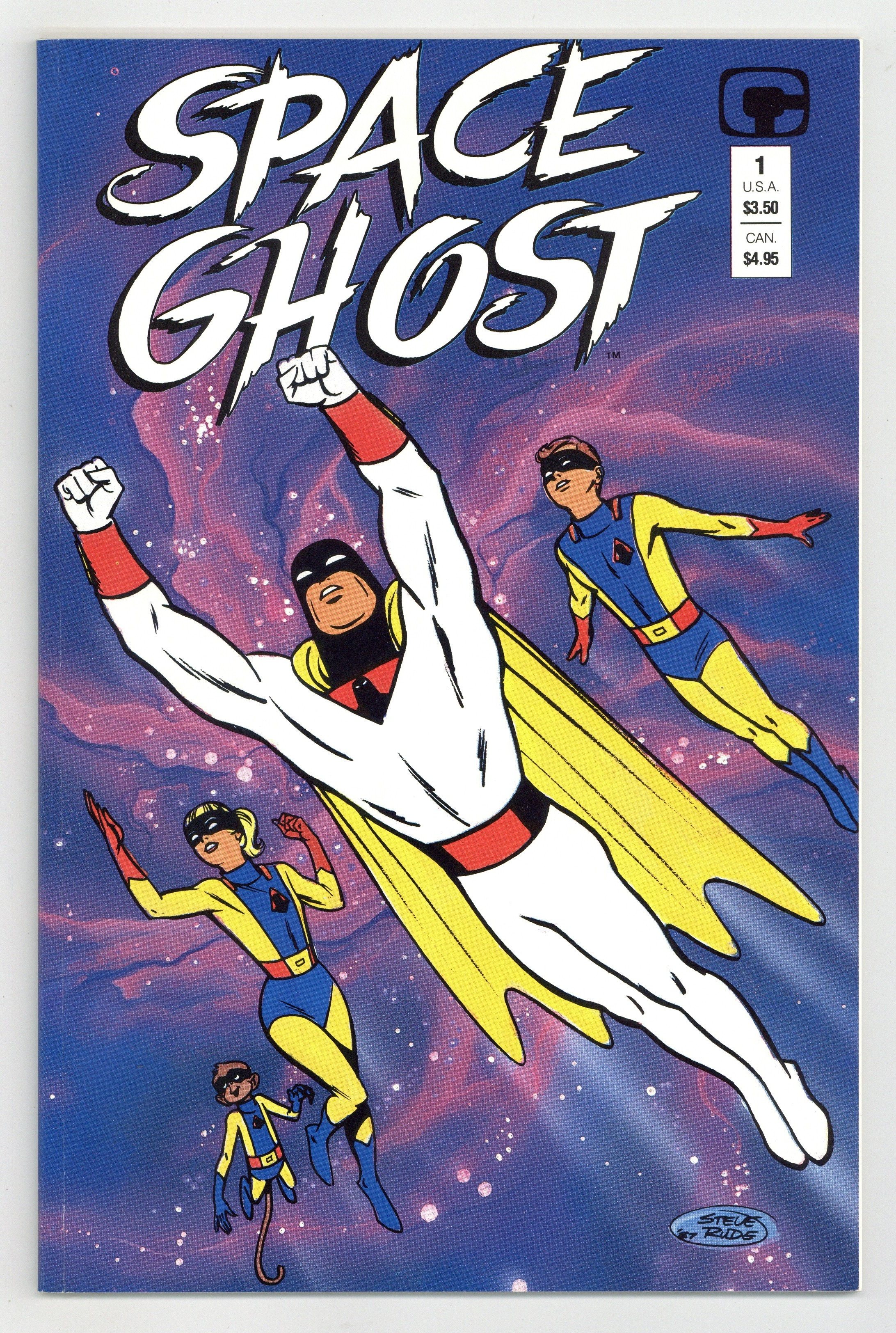 $27.00"The Sinister Spectre." Story by Mark Evanier and Steve Rude. Pencils, front and back cover by Steve Rude. Inks by Willie Blyberg. Painted color by Ken Steacy. A mysterious figure breaks Space Ghosts most dangerous foes out of Gaolworld. It will take the combined power and ingenuity of Space Ghost, Jan and Jace, and Blip the monkey to recapture them. However, even if they do, they still have to face the hooded figure who freed them. While the face behind that hood is the last one anyone would expect. Contains a 5 page article on the development of the original Space Ghost cartoons by Mark Evanier. 48 pages. Square bound. Full painted color. Cover price $3.50.