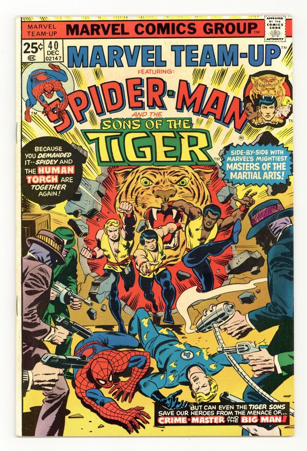 "Murder's Better The Second Time Around!" Part 2 of 2. Guest-starring Spider-Man, the Human Torch, and the Sons of the Tiger (1st full-color appearance). Script by Bill Mantlo. Pencils by Sal Buscema. Inks by Mike Esposito and Dave Hunt. Cover by Sal Buscema and Mike Esposito. It's a wild free-for-all in an abandoned warehouse as Spider-Man and the Human Torch duke it out with the Big Man, Crime Master, Sandman, and the Enforcers! However, the two heroes are badly outnumbered and go down to defeat! Fortunately though, a group of martial artists is training nearby and stumble across the captive torch and wall-crawler! Now the odds suddenly look better as the Sons of the Tiger join the fray! During the furious final battle, friendships will be formed, mysteries will be solved, and tragedy will strike! (Notes: The Sons of the Tiger appear next in Deadly Hands of Kung Fu 19. This issue contains a full-page ad for Hostess Fruit Pies featuring the Hulk vs. the Abomination and Wendigo.) 36 pages. Cover price $0.25.