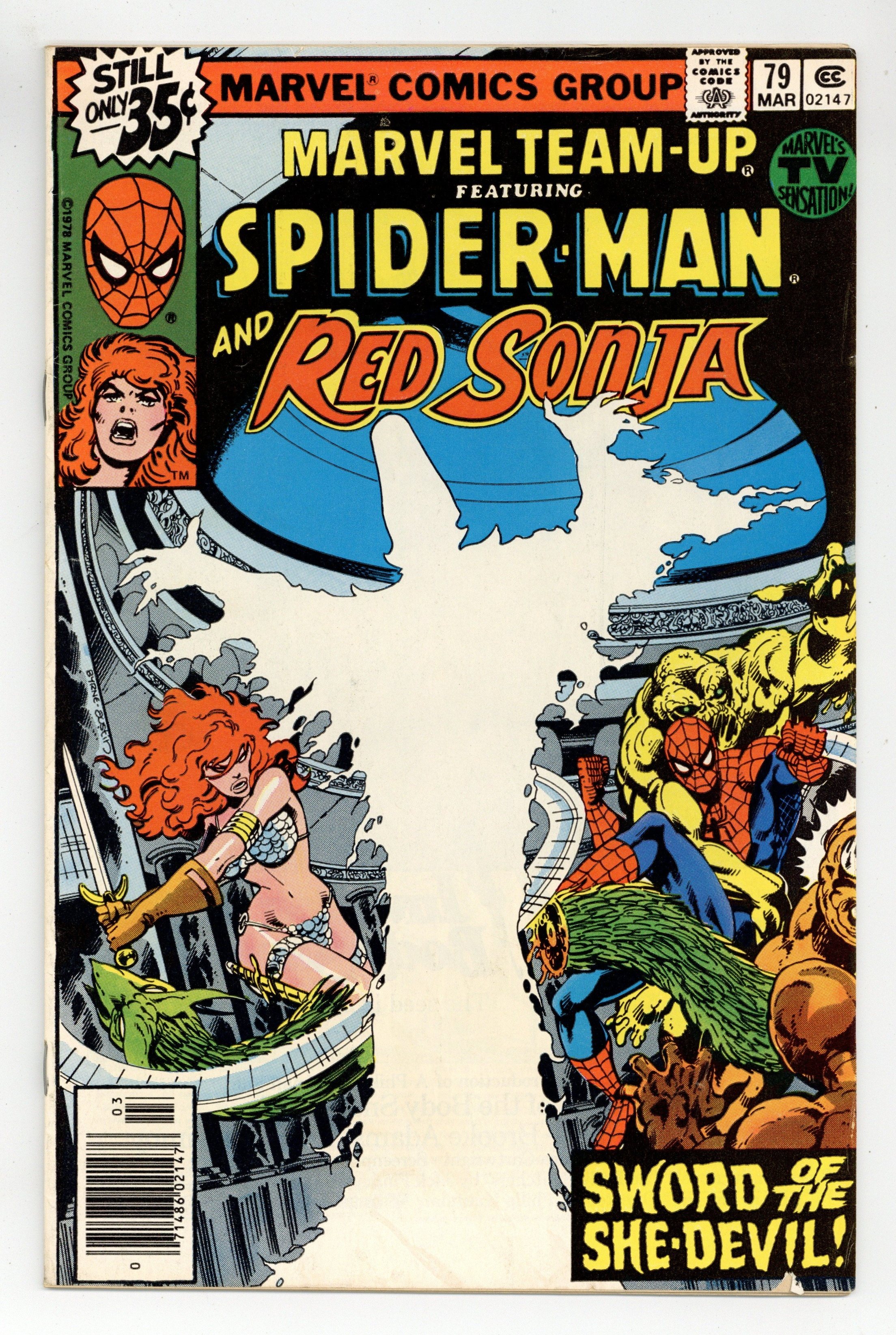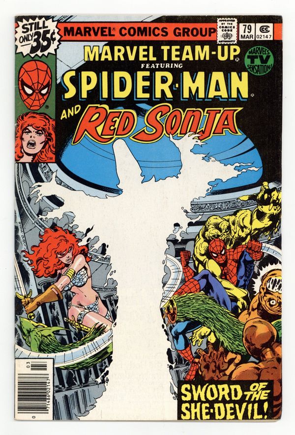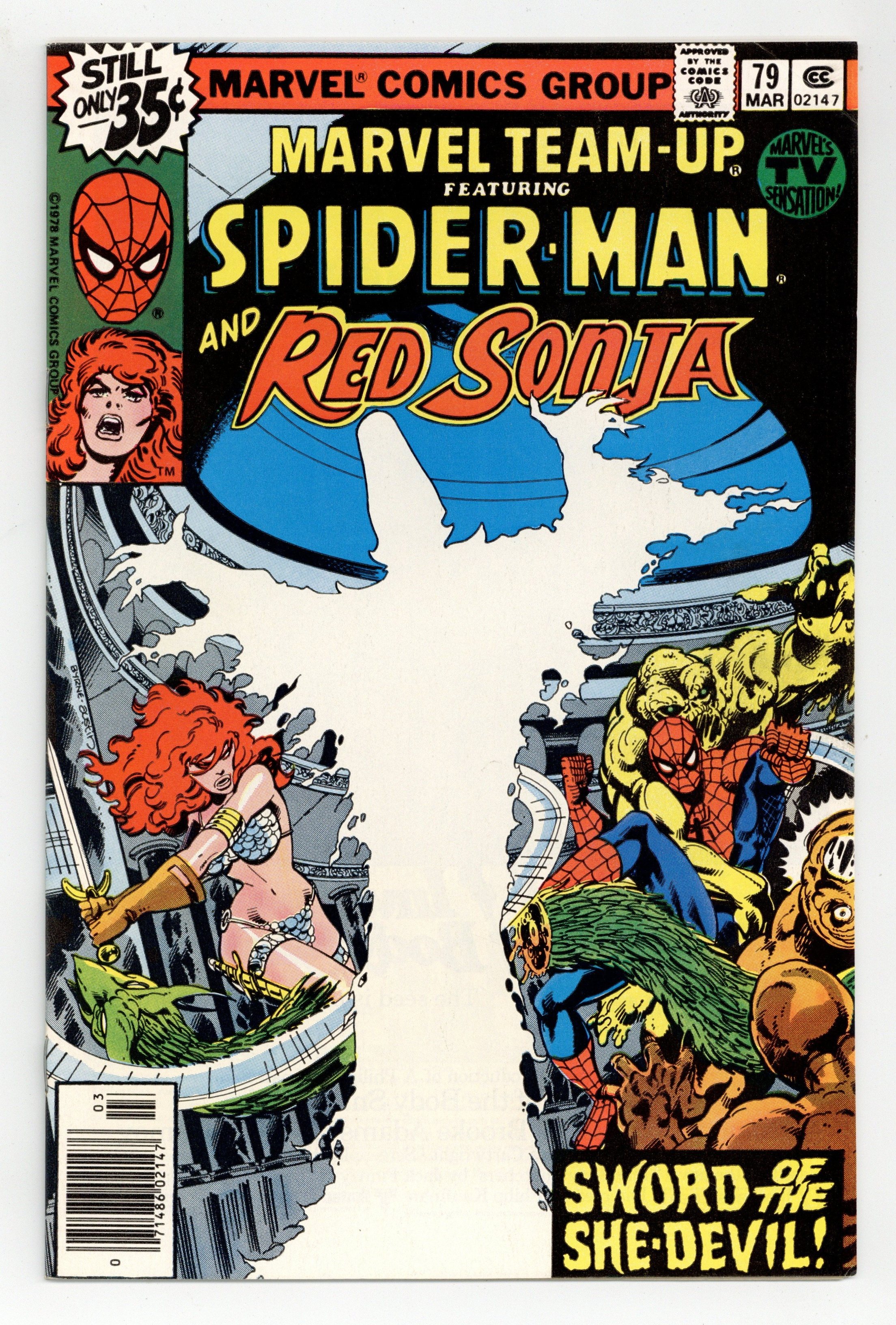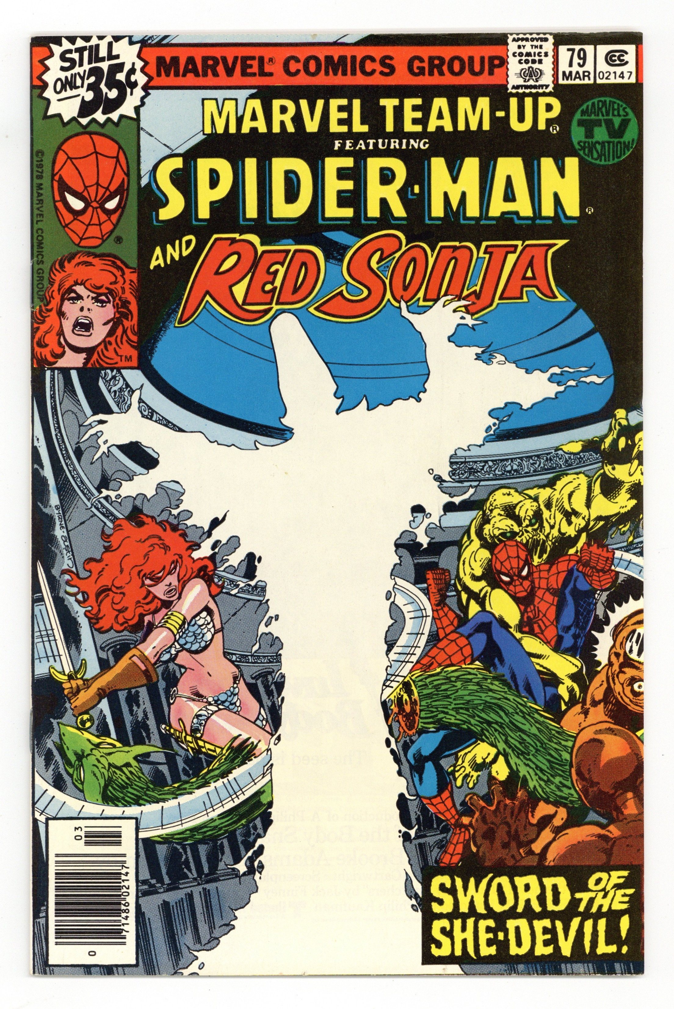 "Sword of the She-Devil" Guest-starring Spider-Man and Red Sonja. Plot and Script by Chris Claremont. Plot and Pencils by John Byrne. Inks by Terry Austin. Cover by John Byrne and Terry Austin. An emergency situation is developing at the Metropolitan Museum of Art! The Daily Bugle dispatches Peter Parker and a reporter to the site, but someone else sneaks along...Mary Jane Watson! The web-slinger quickly enters the museum and is attacked by grotesque monsters! Mary Jane rushes inside to help the struggling wall-crawler, but what can she do? How about grab the ancient sword of Red Sonja! And in a dazzling transformation...Mary Jane Watson becomes Red Sonja! Now the Amazing Spider-Man and the She-Devil with a Sword team up against the evil sorcerer Kulan Gath! Will New York City survive...and Ms. Watson too? An excellent story! Cameo appearance by Clark Kent on page 3. (Notes: This is a key appearance of Mary Jane Watson during the time period (between 1979 and 1983) when she rarely appeared in any of the Spider-Man titles. Kulan Gath appears next in Uncanny X-men 190. This is the final issue of the Claremont-Byrne run on the Marvel Team-Up title. This issue was reprinted in Marvel Tales 208.) 36 pages. Cover price $0.35.