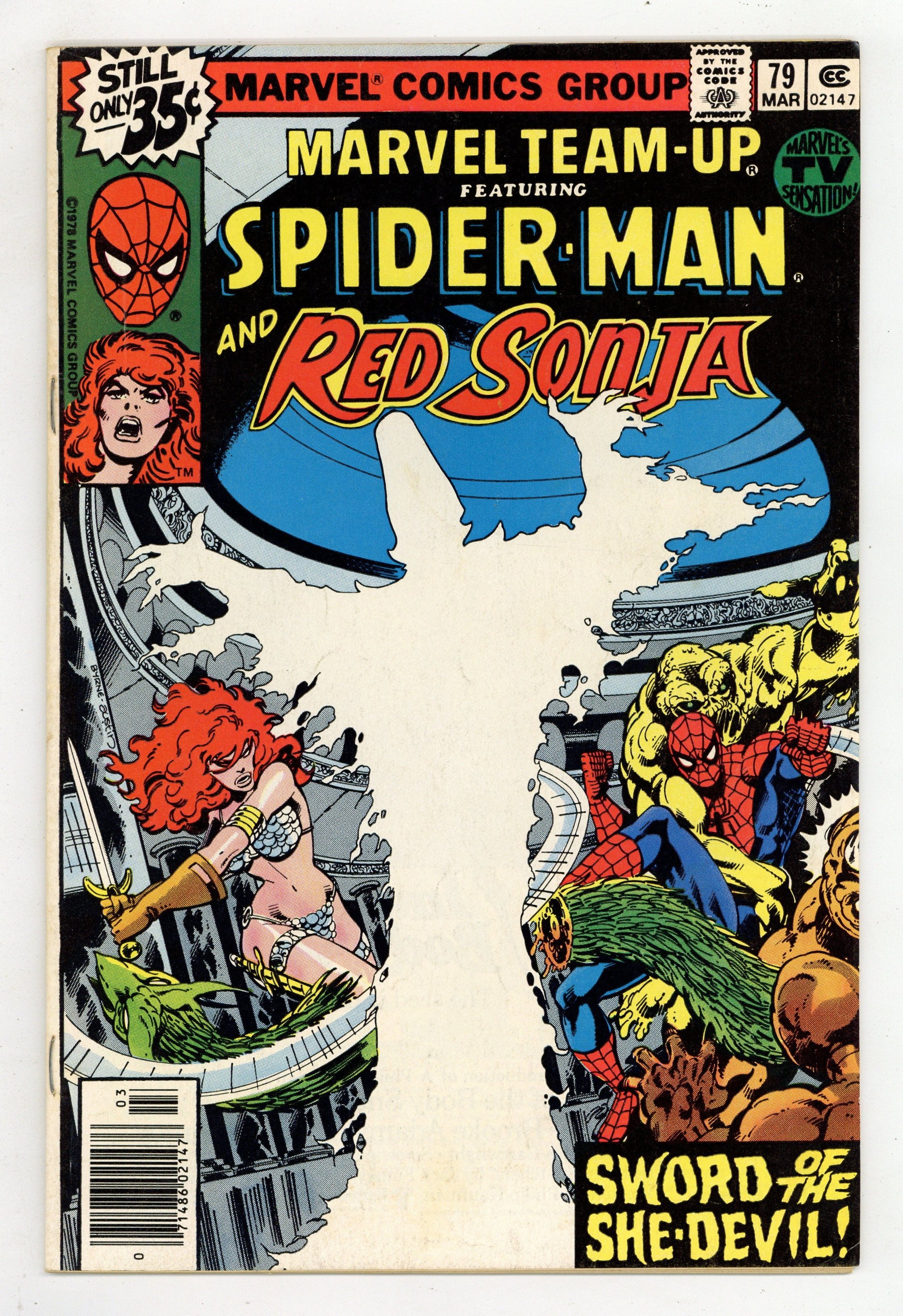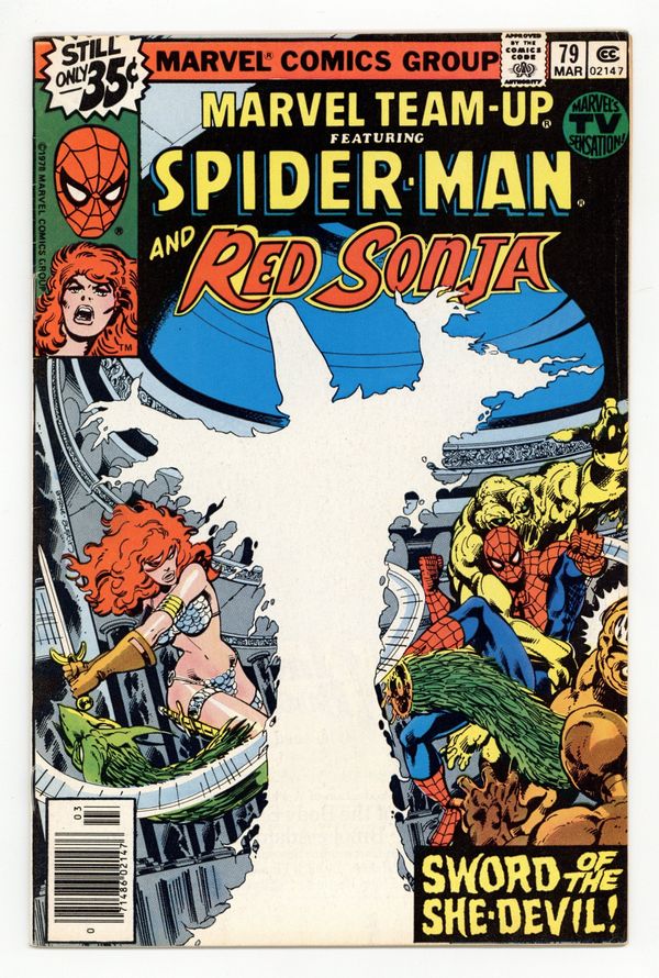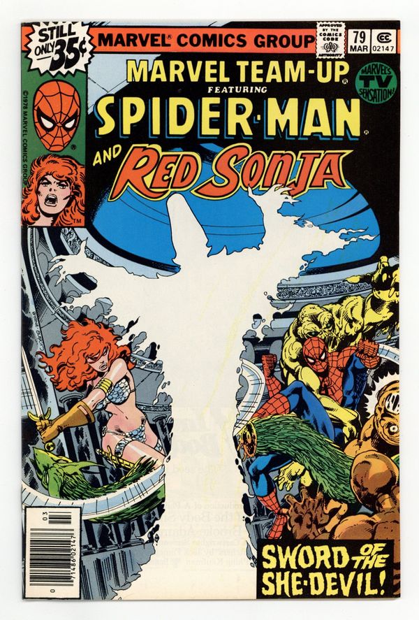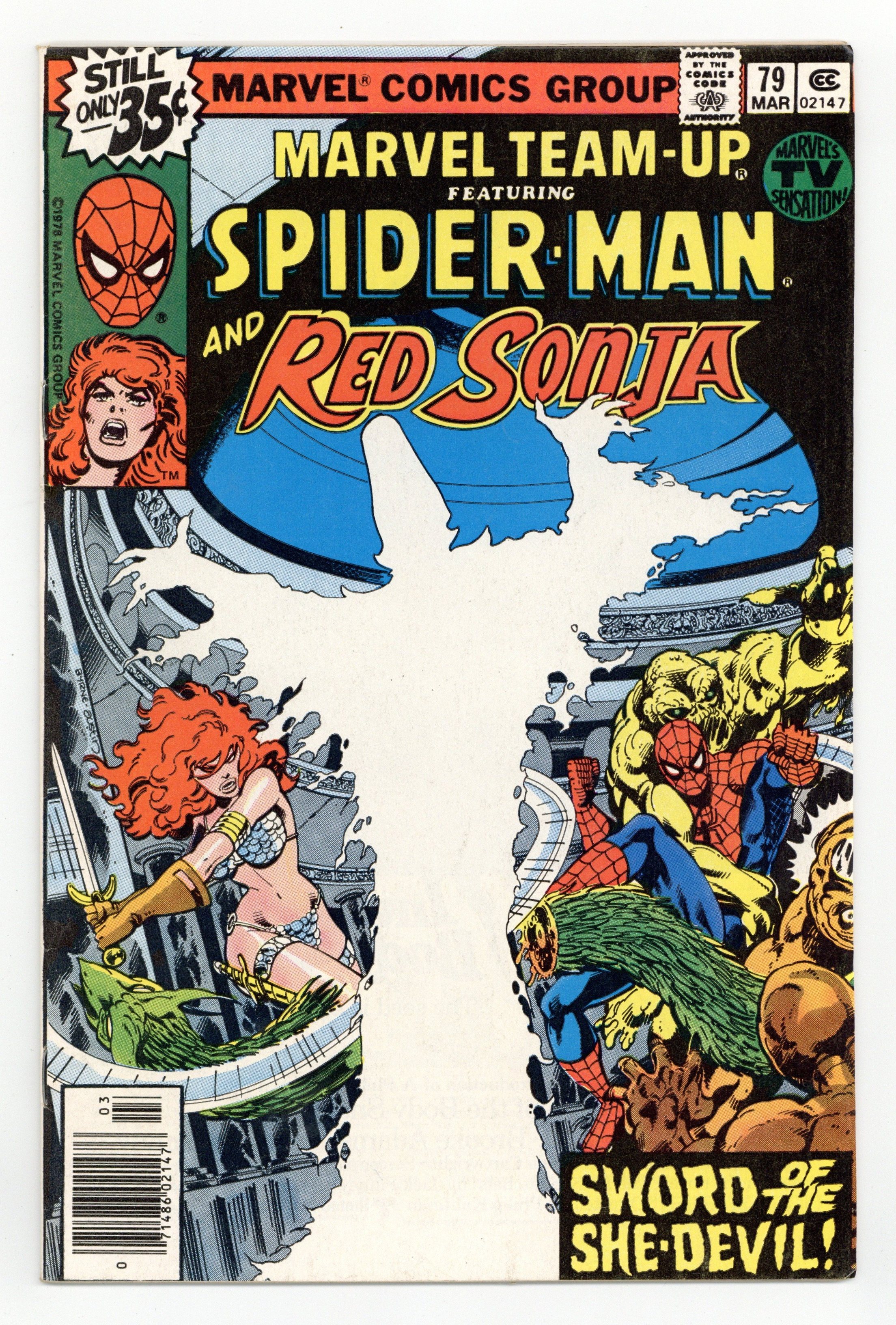 "Sword of the She-Devil" Guest-starring Spider-Man and Red Sonja. Plot and Script by Chris Claremont. Plot and Pencils by John Byrne. Inks by Terry Austin. Cover by John Byrne and Terry Austin. An emergency situation is developing at the Metropolitan Museum of Art! The Daily Bugle dispatches Peter Parker and a reporter to the site, but someone else sneaks along...Mary Jane Watson! The web-slinger quickly enters the museum and is attacked by grotesque monsters! Mary Jane rushes inside to help the struggling wall-crawler, but what can she do? How about grab the ancient sword of Red Sonja! And in a dazzling transformation...Mary Jane Watson becomes Red Sonja! Now the Amazing Spider-Man and the She-Devil with a Sword team up against the evil sorcerer Kulan Gath! Will New York City survive...and Ms. Watson too? An excellent story! Cameo appearance by Clark Kent on page 3. (Notes: This is a key appearance of Mary Jane Watson during the time period (between 1979 and 1983) when she rarely appeared in any of the Spider-Man titles. Kulan Gath appears next in Uncanny X-men 190. This is the final issue of the Claremont-Byrne run on the Marvel Team-Up title. This issue was reprinted in Marvel Tales 208.) 36 pages. Cover price $0.35.