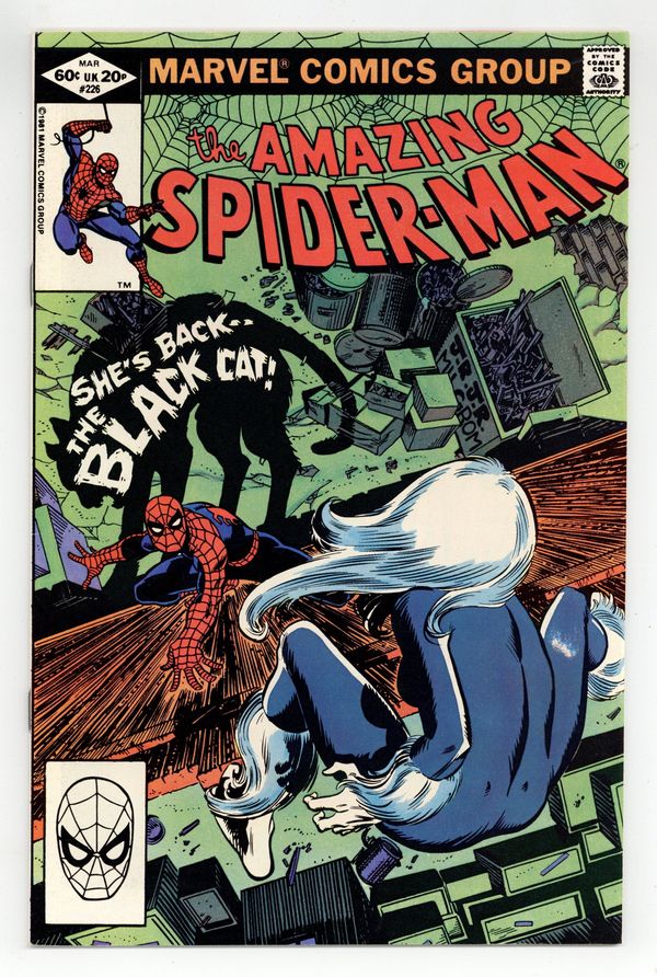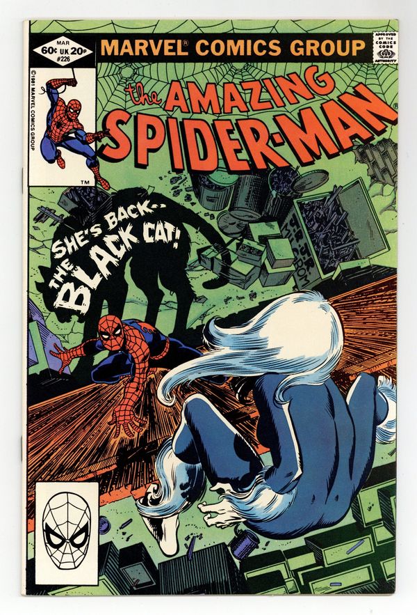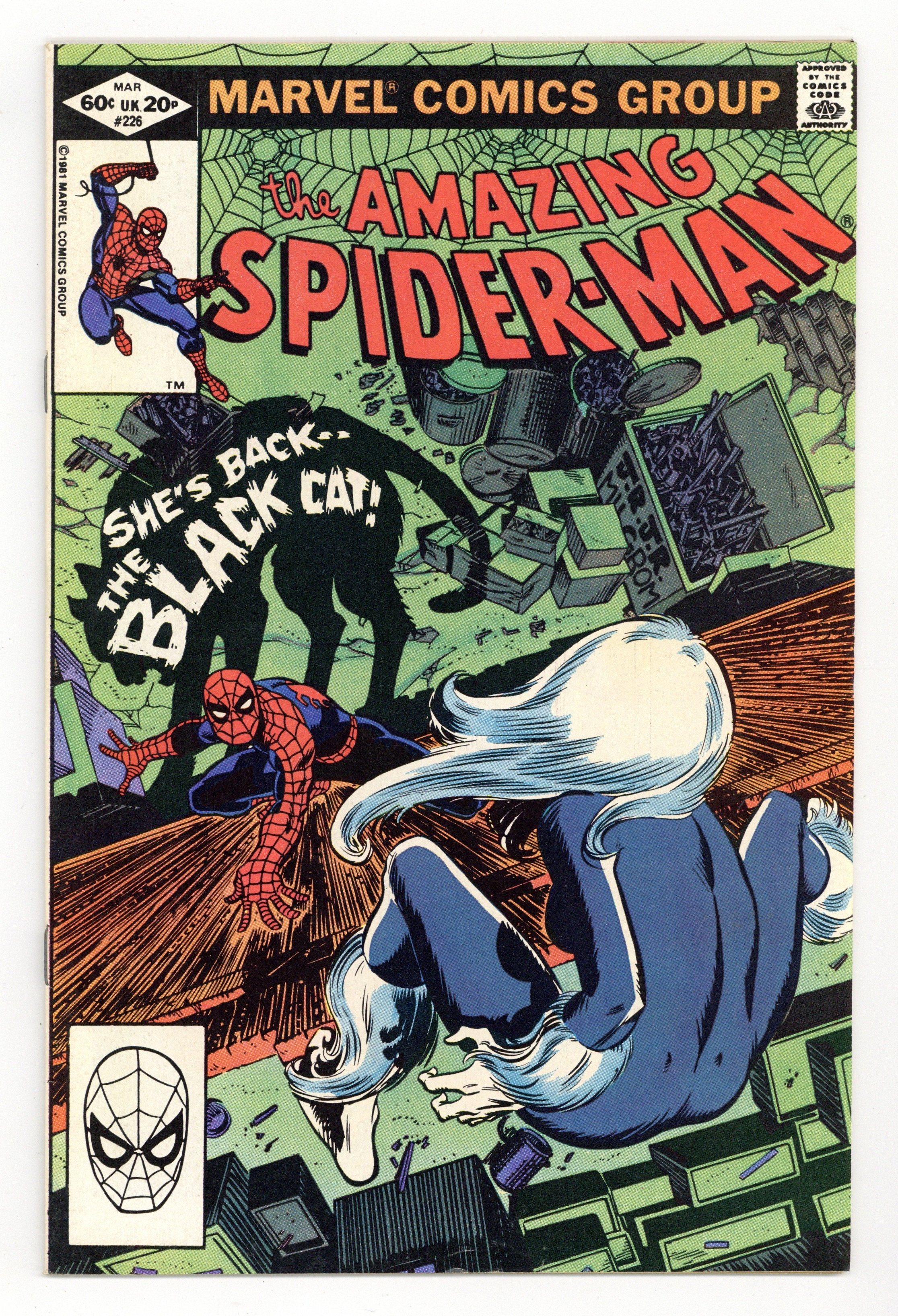 Tags: Marvel Legacy Numbering: Amazing Spider-Man (part 226), Spider-Man$20.50Direct Edition. "But the Cat Came Back" Part 1 of 2. Script by Roger Stern. Art by John Romita Jr. (breakdowns) and Jim Mooney (finishes). Cover by John Romita Jr. and Al Milgrom. Because the fans demanded her, the Black Cat is back! And flirting and fighting with the web-slinger all over again! After Felicia escapes from the psychiatric hospital, she resumes her high-dollar heists! But soon realizes that it's not as much fun without Spider-Man chasing her! So, the cat burglar extraordinaire arranges an evening rendezvous with her favorite wall-crawler at their first date location (from Amazing Spider-Man 194). Will the enchanting cat mesmerize the Spectacular Spider-Man once more? Or can the web-slinger resist her feline charms? An excellent issue! Cameo appearances by the Foolkiller and Captain Jean DeWolff. (Notes: This was a highly anticipated issue for fans of the wall-crawler; and Stern & Romita Jr. did not disappoint. The Black Cat previously appeared in Amazing Spider-Man 205. This story was reprinted in Spider-Man Magazine 2 and also in the trade paperback: Spider-Man vs. the Black Cat (2005). The back cover features a full-page ad for Dungeons & Dragons with art by Bill Willingham.) 36 pgs. Cover price $0.60.