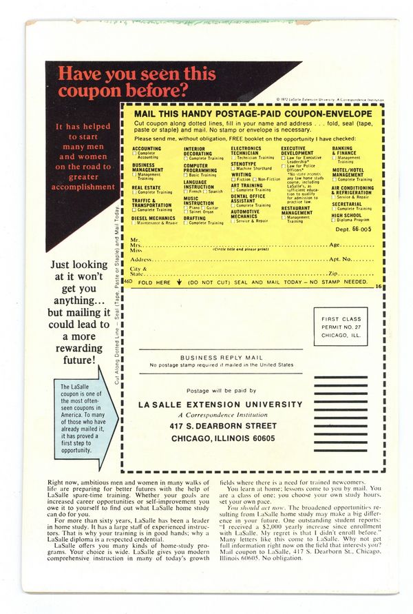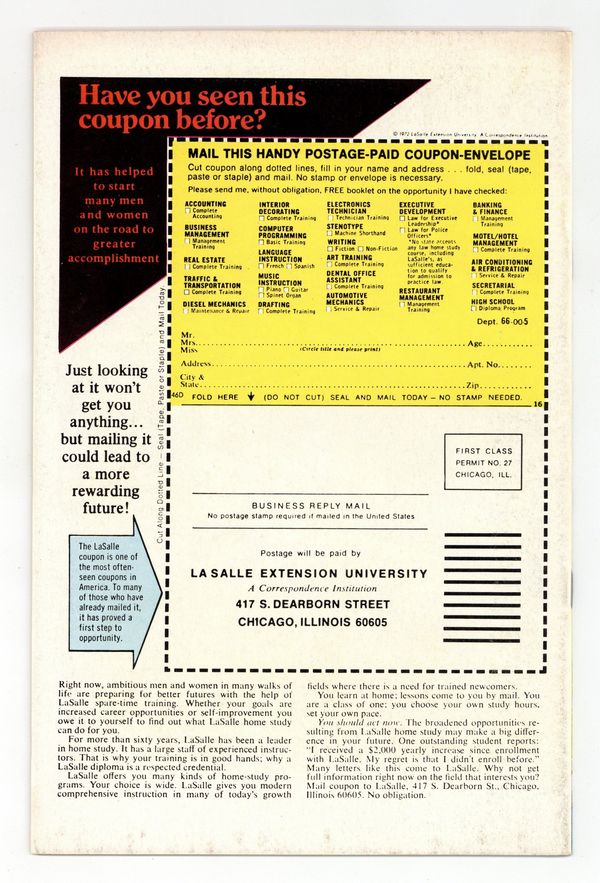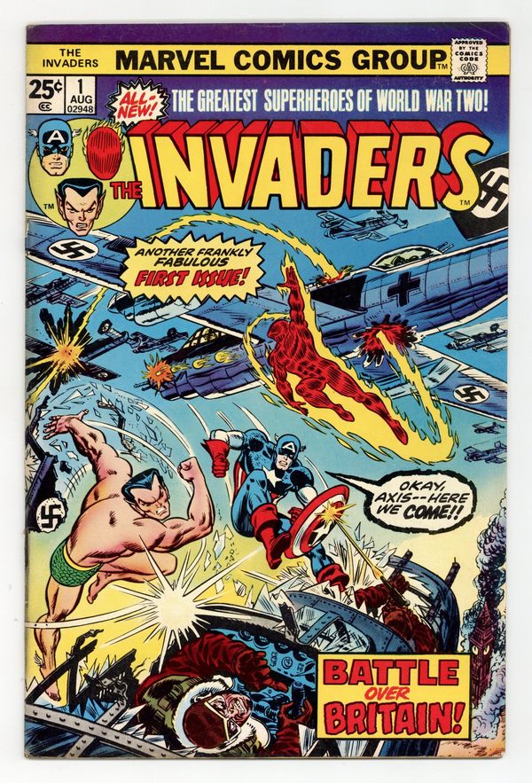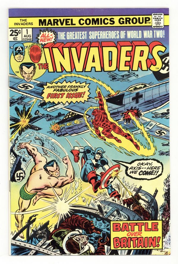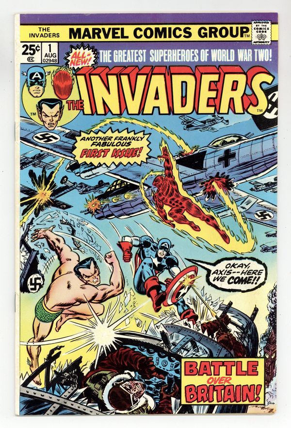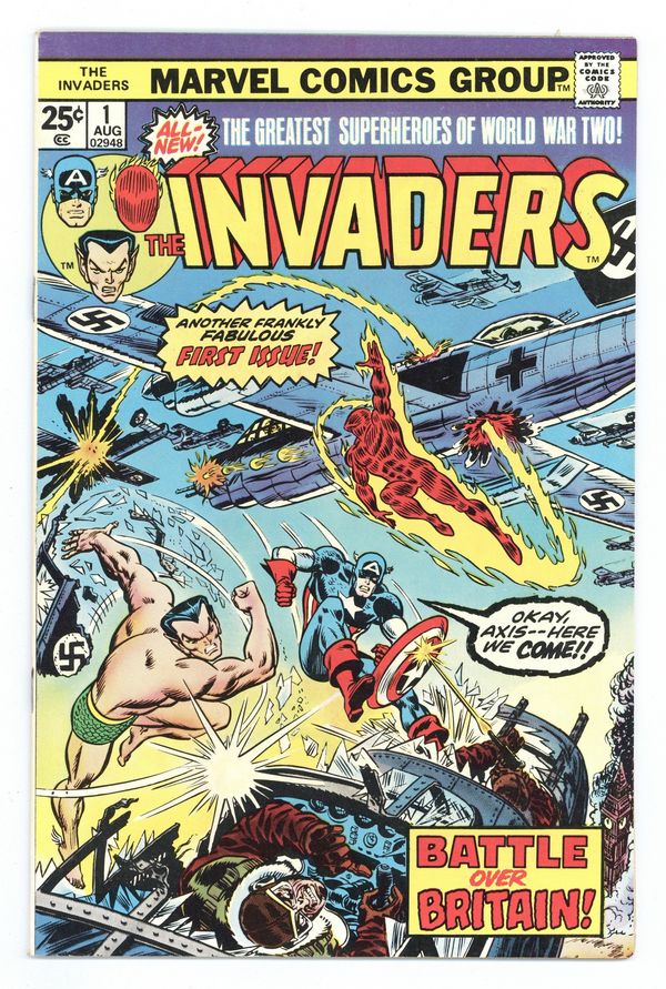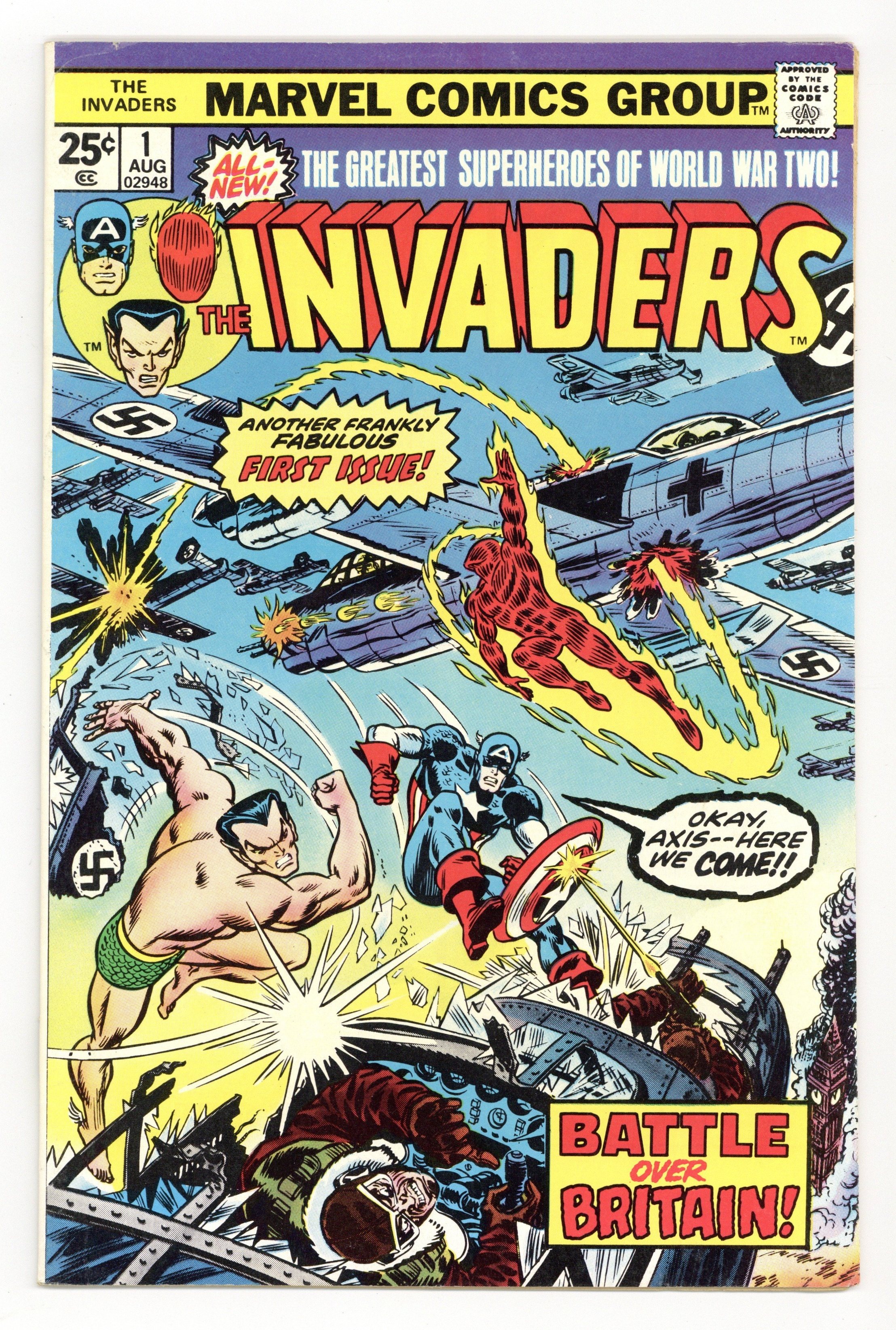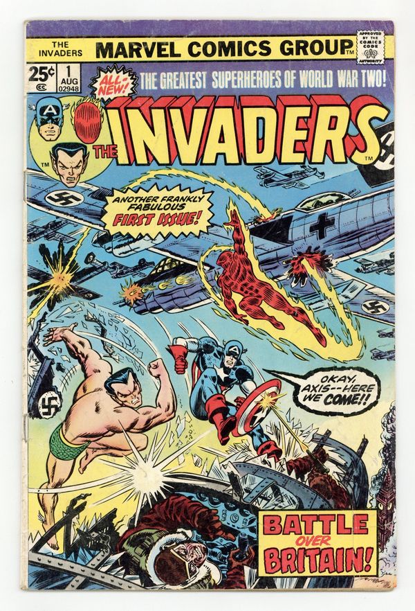 Part 1 of 2 - "The Ring of the Nebulas!" Written by Roy Thomas. Art by Frank Robbins and Vince Colletta. The greatest heroes of the Golden Age, Captain America, Human Torch, and Prince Namor alongside their sidekicks Bucky and Toro, unite to win World War II and take down the Axis Powers once and for all. But when Captain America rescues a mysterious woman of great beauty, the Invaders suddenly find themselves confronted with a threat greater than anything they've ever faced before. 32 pages FC. Marvel Value Stamp. Cover price $0.25.