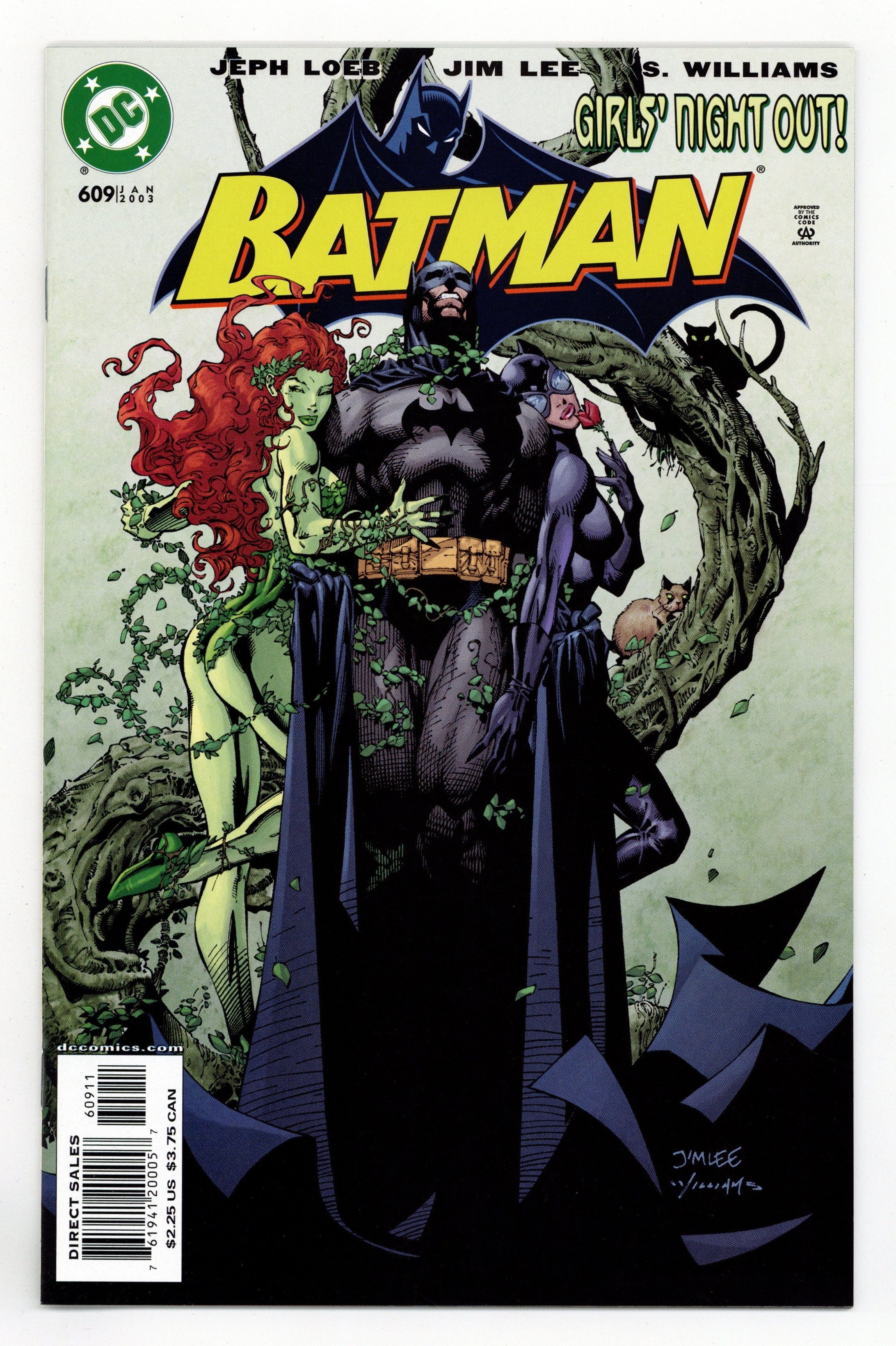 Direct Edition. WRITTEN BY JEPH LOEB; ART AND COVER BY JIM LEE AND SCOTT WILLIAMS In stores November 27. Jeph Loeb & Jim Lee continue their run on BATMAN with Part 2 of the 12-part "Hush." Lying near death, Batman must turn to the least likely person from the Bat family for help: the Huntress! Meanwhile, Catwoman continues to hunt down the mysterious individual responsible for wreaking havoc in their lives ? a path that leads her back to Poison Ivy. 48 Pages, Full Color. Cover price $2.25.
