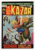 $26.00Cover pencils by John Buscema, inks by Joe Sinnott. Terror Stalks the Everglades!, script by Roy Thomas (pages 1-9, 17-21) and Len Wein (pages 10-16), pencils by John Buscema (pages 1-9, 17-21), Neal Adams (pages 10-16), and John Romita (touchups) (pages 10-16), inks by Dan Adkins (pages 1-9, 17-21), none (pages 10-16); Ka-Zar and Zabu fly to the Everglades to help Barbara Morris and Paul Allen search for Ted Sallis; Once there they encounter the Man-Thing and AIM agents; Also, the back story of how Dr Calvin was shot after the origin tale of Man-Thing in Savage Tales #1 is told. Cover price $0.20.