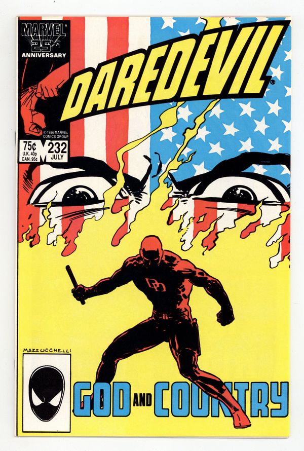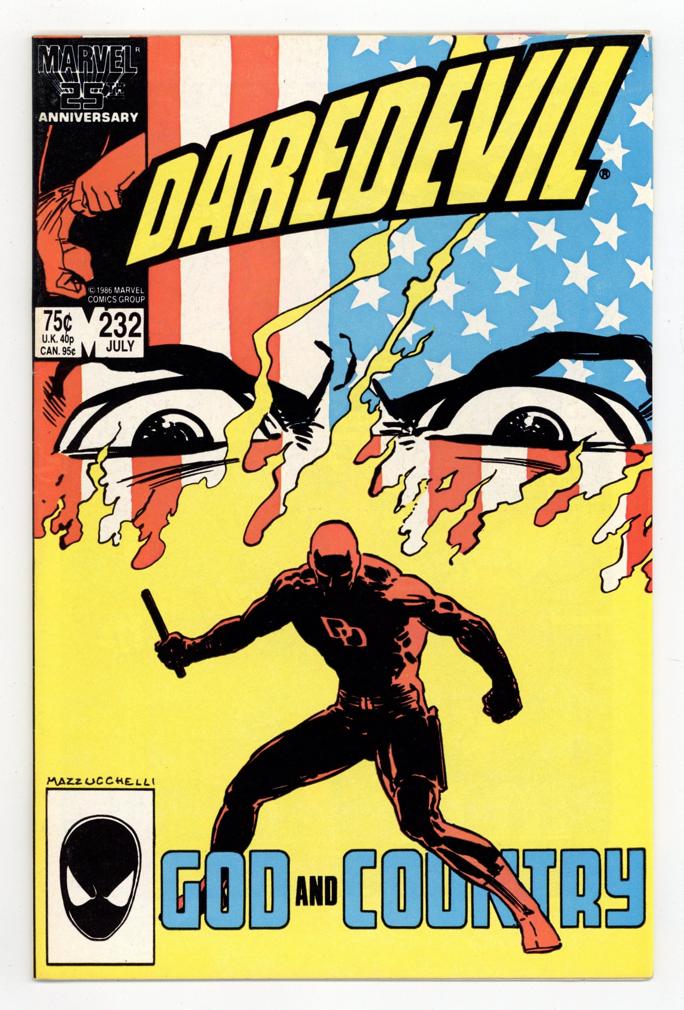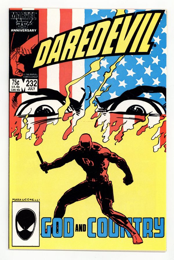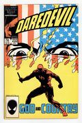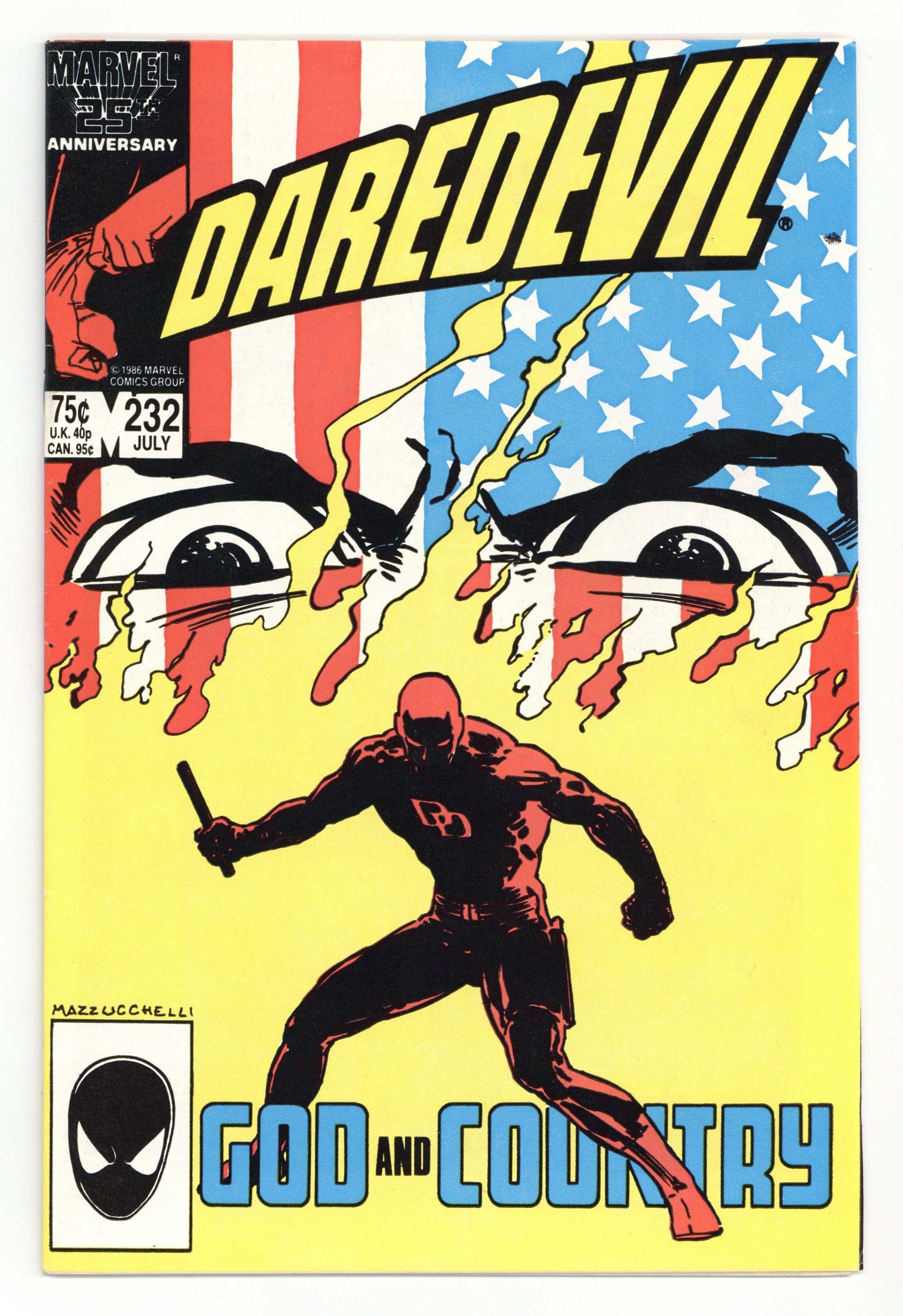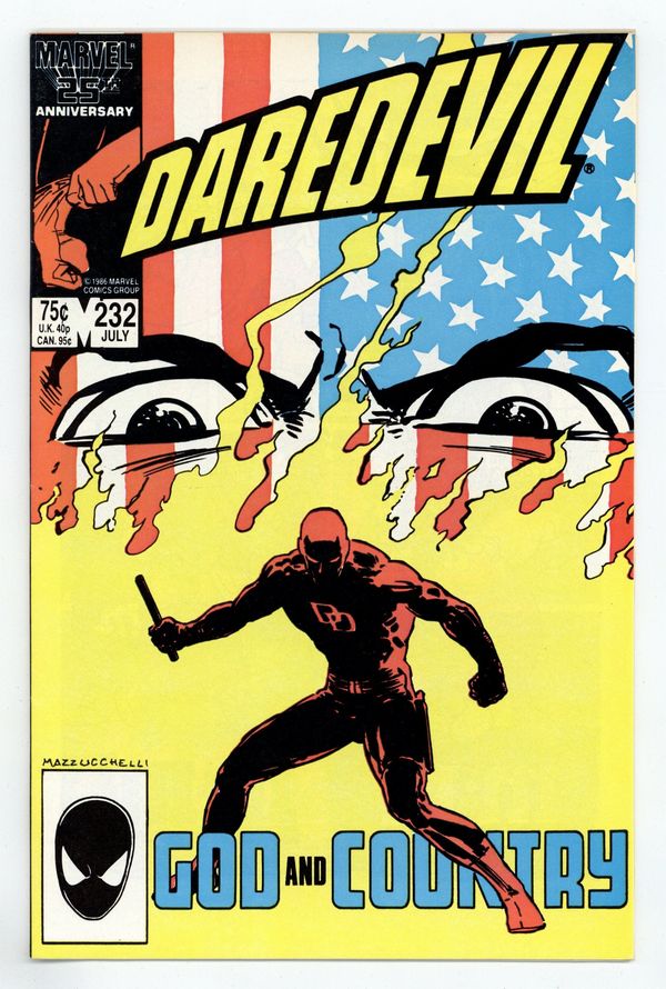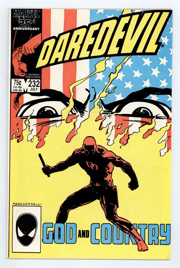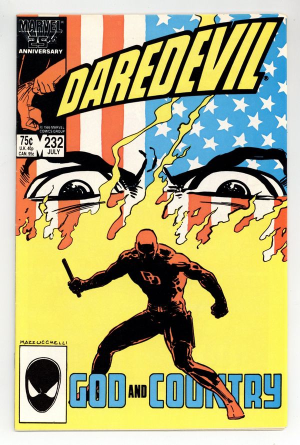 Direct Edition. Cover art by David Mazzucchelli. God and Country starring Daredevil, Karen Page, Foggy Nelson, Glorianna O'Breen, Ben Urich, Kingpin, and Nuke [Sgt. Simpson] (1st), script by Frank Miller, art by David Mazzucchelli; Matt helps Karen kick her drug habit; Kingpin hires a deranged Super Soldier to go after DD; part 6 of critically acclaimed Born Again storyline. 36 pgs. Cover price $0.75. Cover price $0.75.