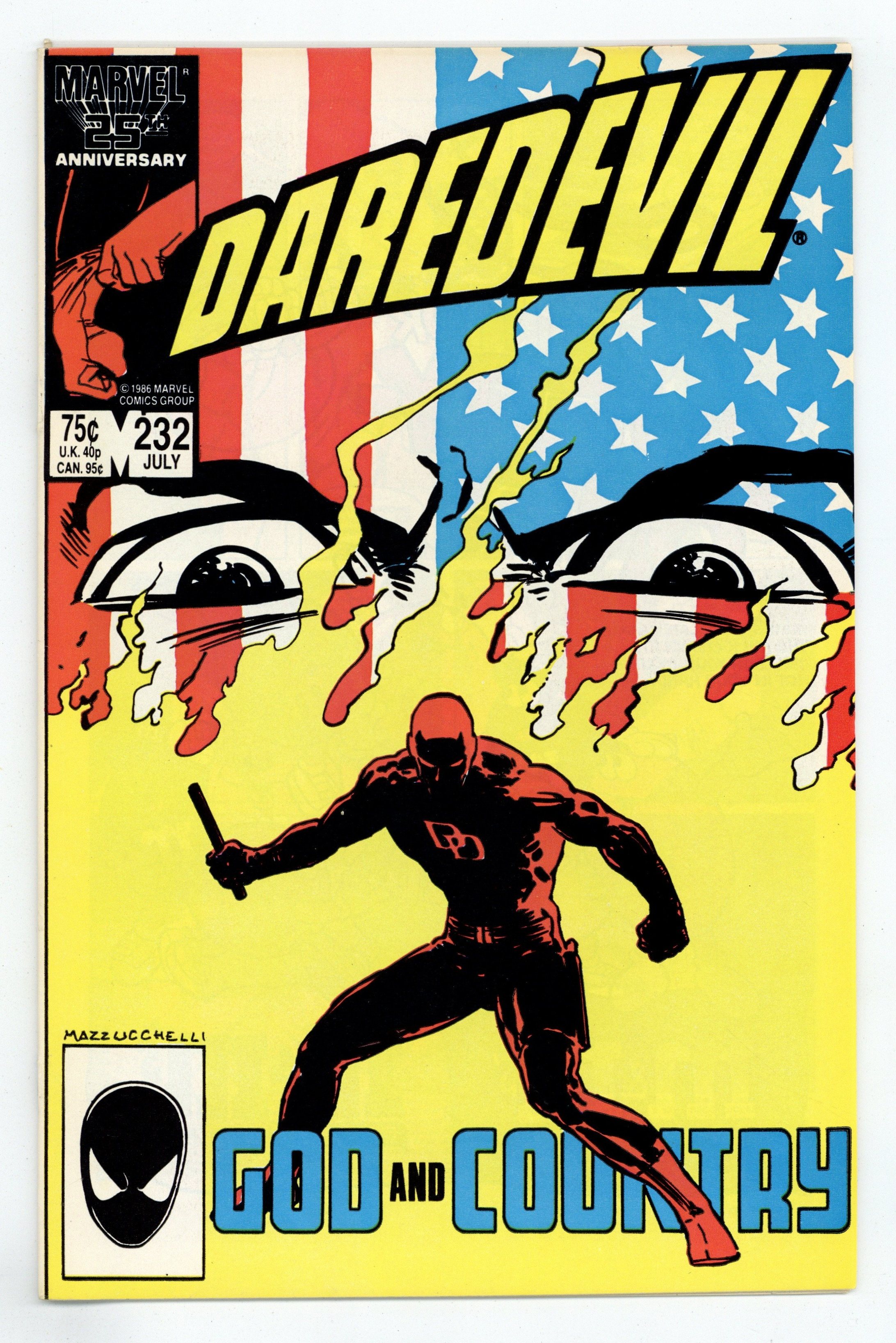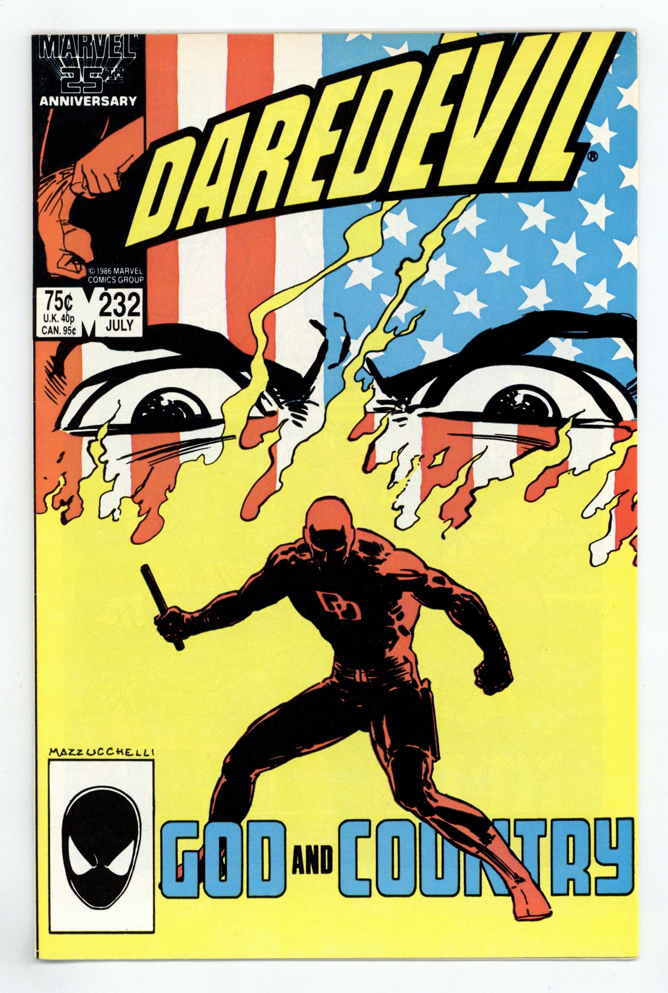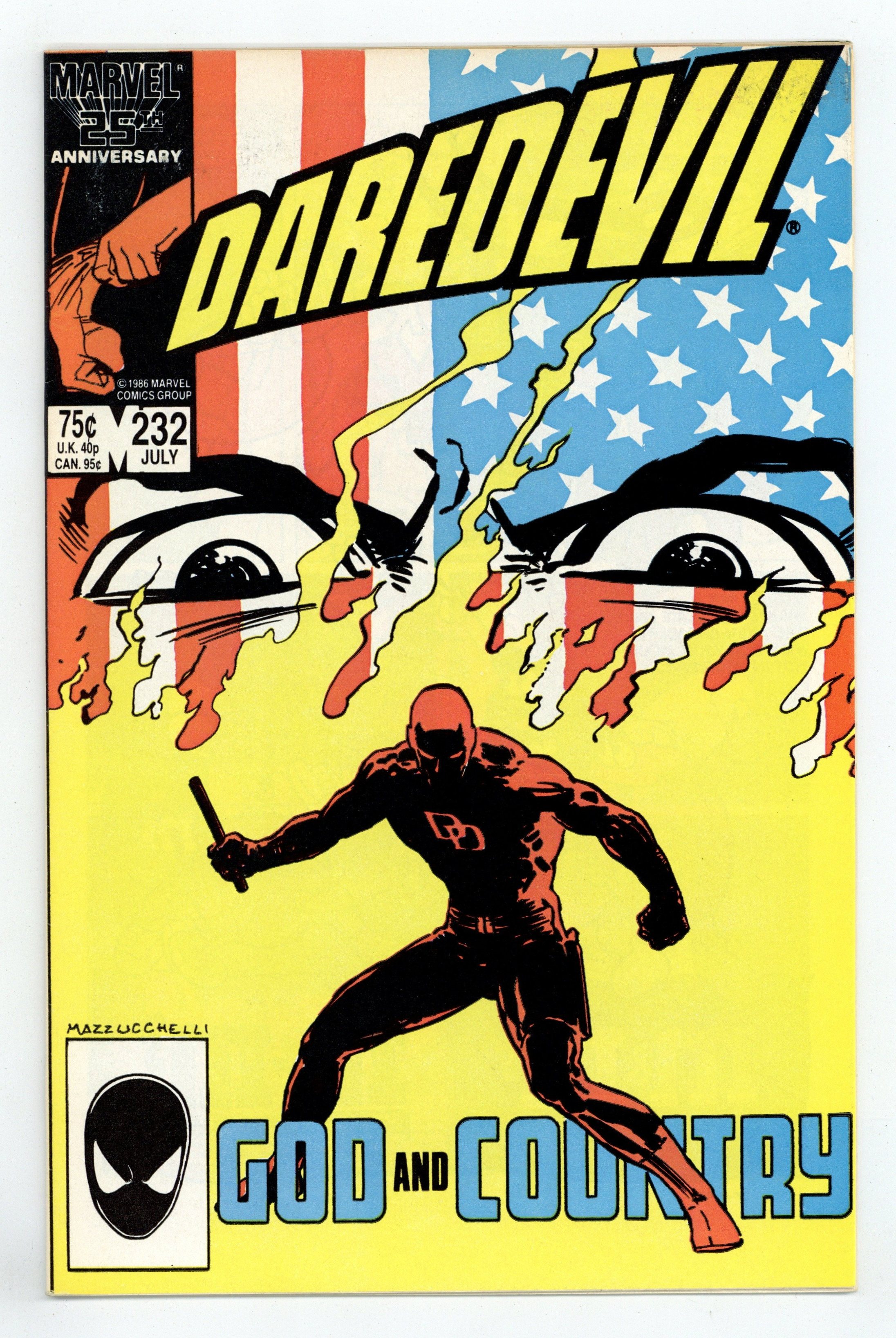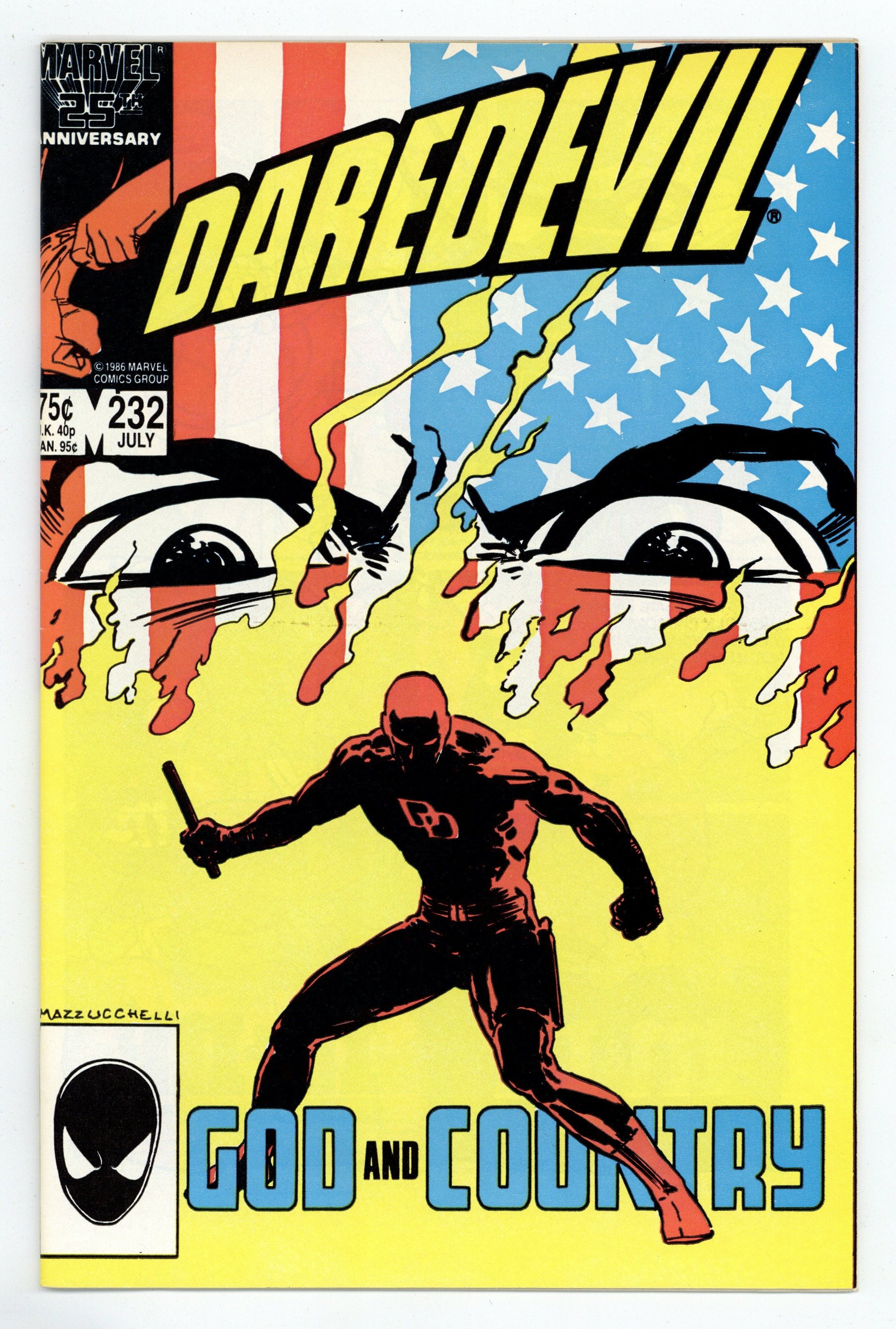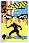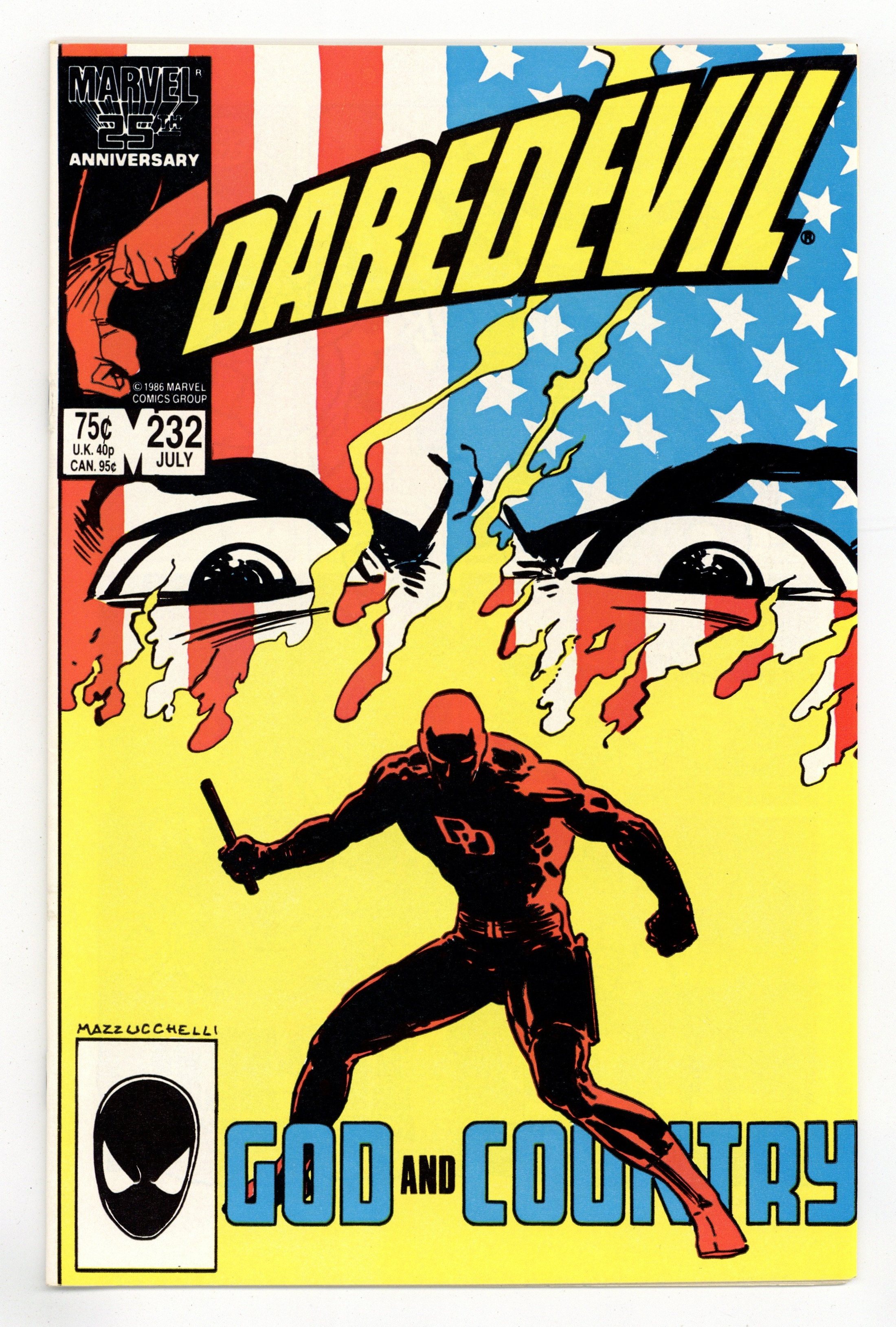 Direct Edition. Cover art by David Mazzucchelli. God and Country starring Daredevil, Karen Page, Foggy Nelson, Glorianna O'Breen, Ben Urich, Kingpin, and Nuke [Sgt. Simpson] (1st), script by Frank Miller, art by David Mazzucchelli; Matt helps Karen kick her drug habit; Kingpin hires a deranged Super Soldier to go after DD; part 6 of critically acclaimed Born Again storyline. 36 pgs. Cover price $0.75. Cover price $0.75.
