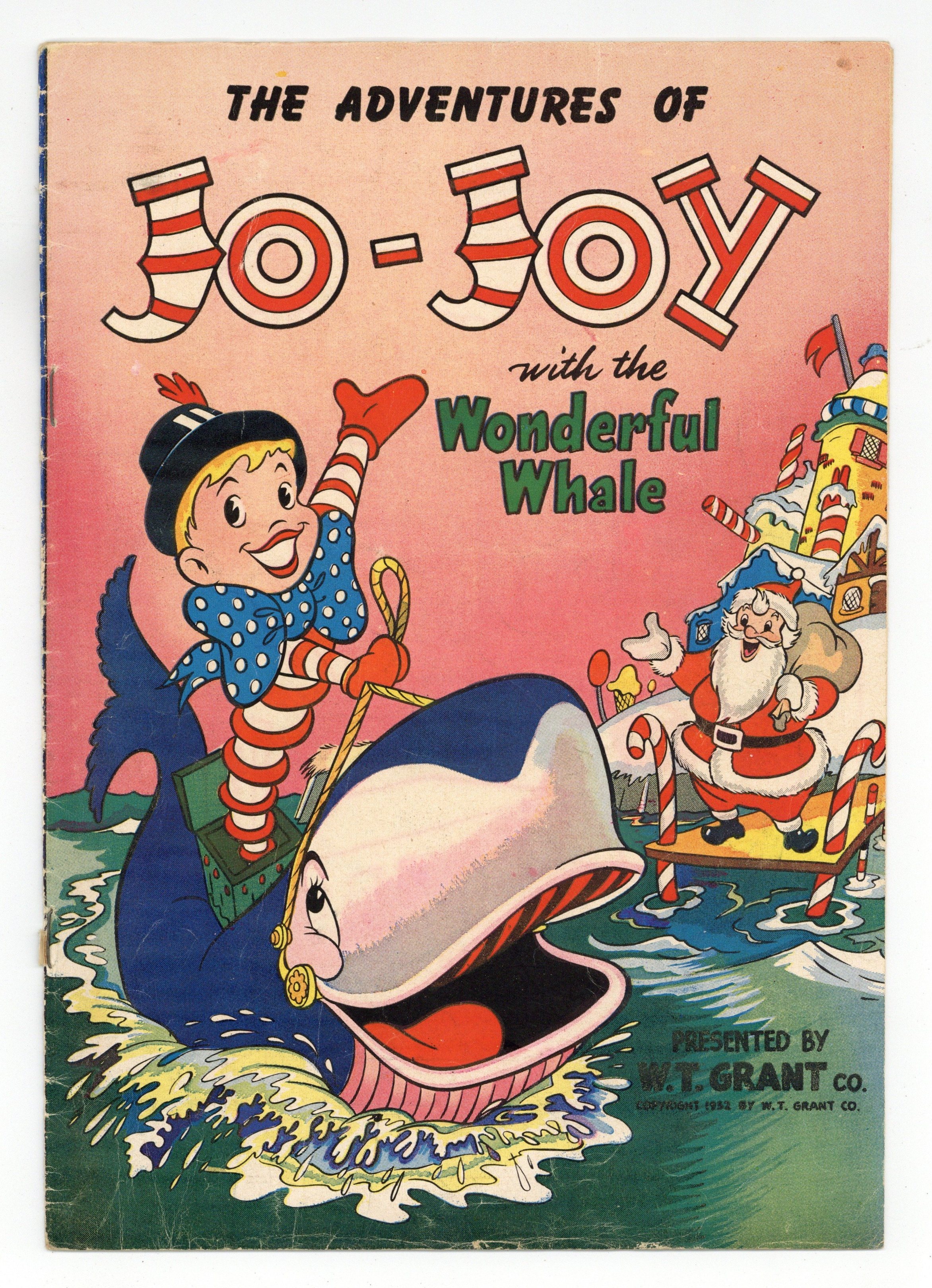 "The Adventures of Jo-Joy with the Wonderful Whale" Jo-Joy is a yearly Christmas giveaway comic book distributed by the W. T. Grant Co. department store chain. iPublished annually every Christmas from 1945-53. Each issue features a Jo-Joy story with Santa Claus, and illustrates many, many Jo-Joy toys that were manufactured and sold thru Grant's because the Jo-Joy jack-in-the-box character became wildly popular! Full color, 20 pages, 7-1/16-in. x 10-1/4-in., slick cover.