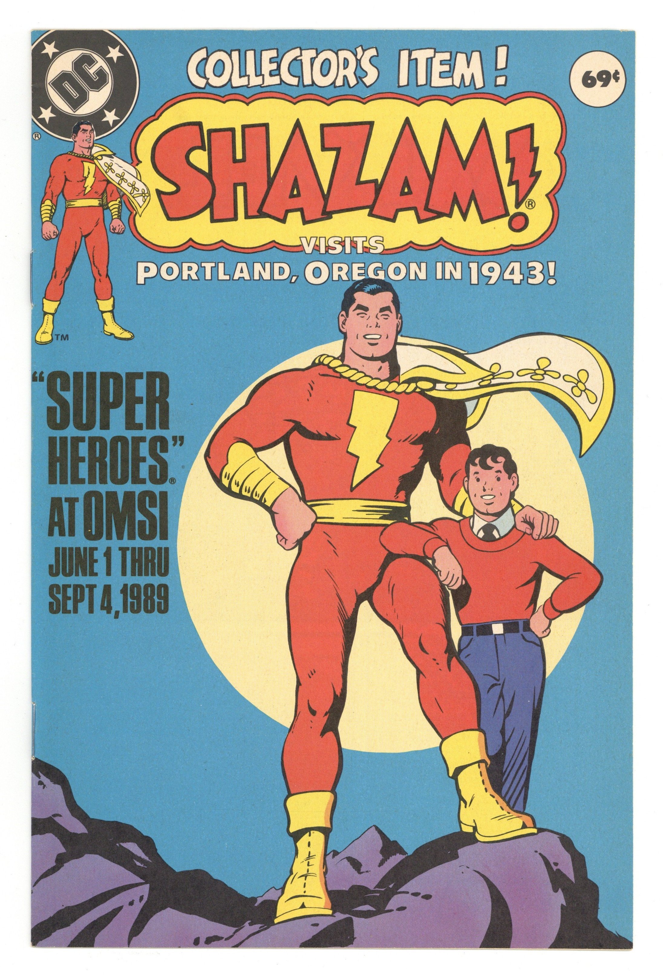 Shazam! Visits Portland Oregon in 1943! or Knighthood Flowers Again! (1989) is a promotional comic released as part a museum exhibit, "Super Heroes, a High-Tech Adventure," which ran June 1st through September 4th, 1989 at the Oregon Museum of Science and And Industry. No writer/artist credits. Full color, 16-pages, 6.5-in. x 10-in., heavy newsprint cover and interior. Cover price $0.69.