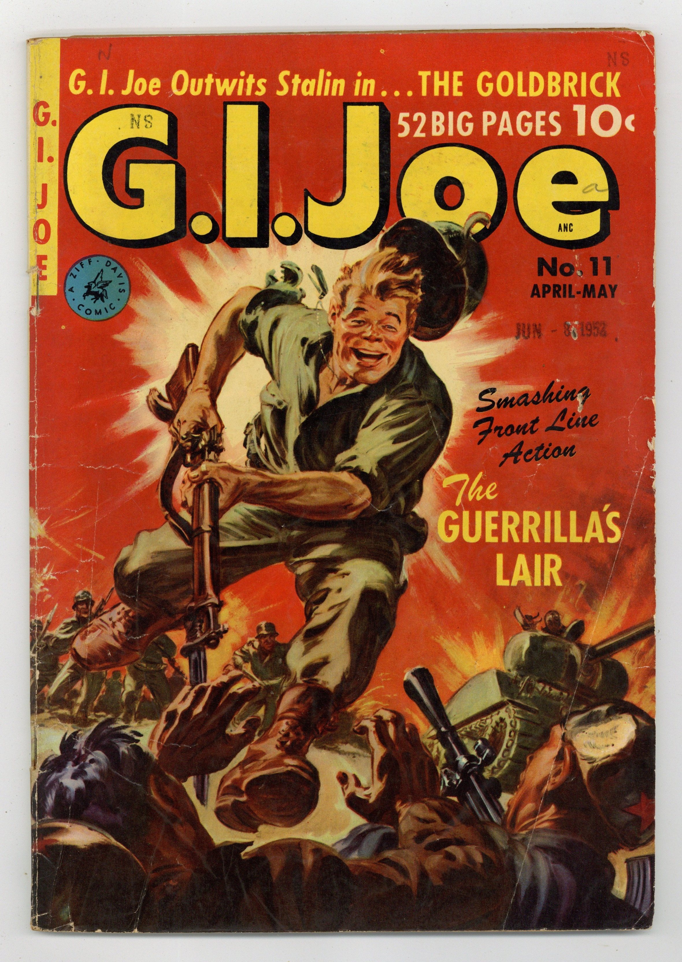 Painted cover by Norman Saunders. Stories and art by Dan De Carlo, John Celardo, Henry Sharp, Mike Sekowsky, Irwin Hasen and Bernard Sachs. Sometimes listed as GI Joe #2. Neither a tie-in with the later toy line/cartoon nor a grim war comic, this first-gen GI Joe focused on lighthearted tales of military life. The Yardbirds, featuring Pvts. Windy and Whitey, was straight-up comedy of the Beetle Bailey/Sad Sack variety. Soviet intelligence names GI Joe as the "average" American soldier, so Stalin has him kidnapped to the Kremlin to see what makes him tick. Pvt. Windy tries to help his portly buddy Whitey find a uniform that fits, in a story by future Archie legend Dan De Carlo. A redheaded cowgirl movie-star who's a crack shot helps Joe with his target practice. Plus G.I. lingo of the 1940s. G.I. Lingo; The Goldbrick!; The Troupers; The Two Yardbirds: The Tailored Uniform!; The First Cavalry Division; The Guerilla's Lair!; The Gun Slingin' Doll; It's A Small World!; GI Joe Meets the Bandit Queen. 48 pages, Full Color. Cover price $0.10.