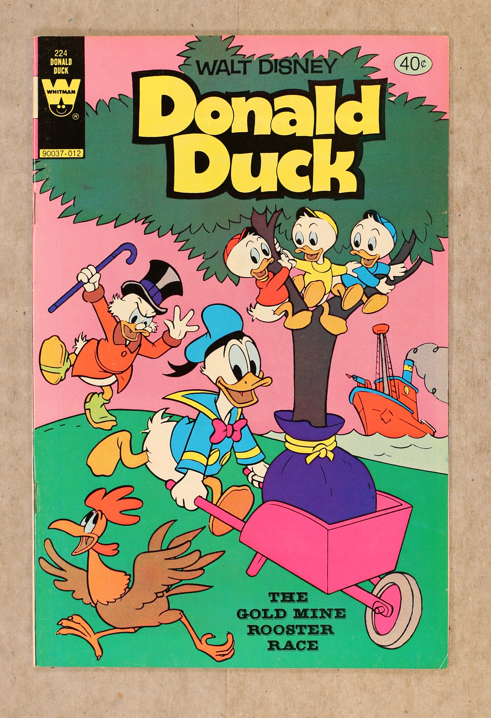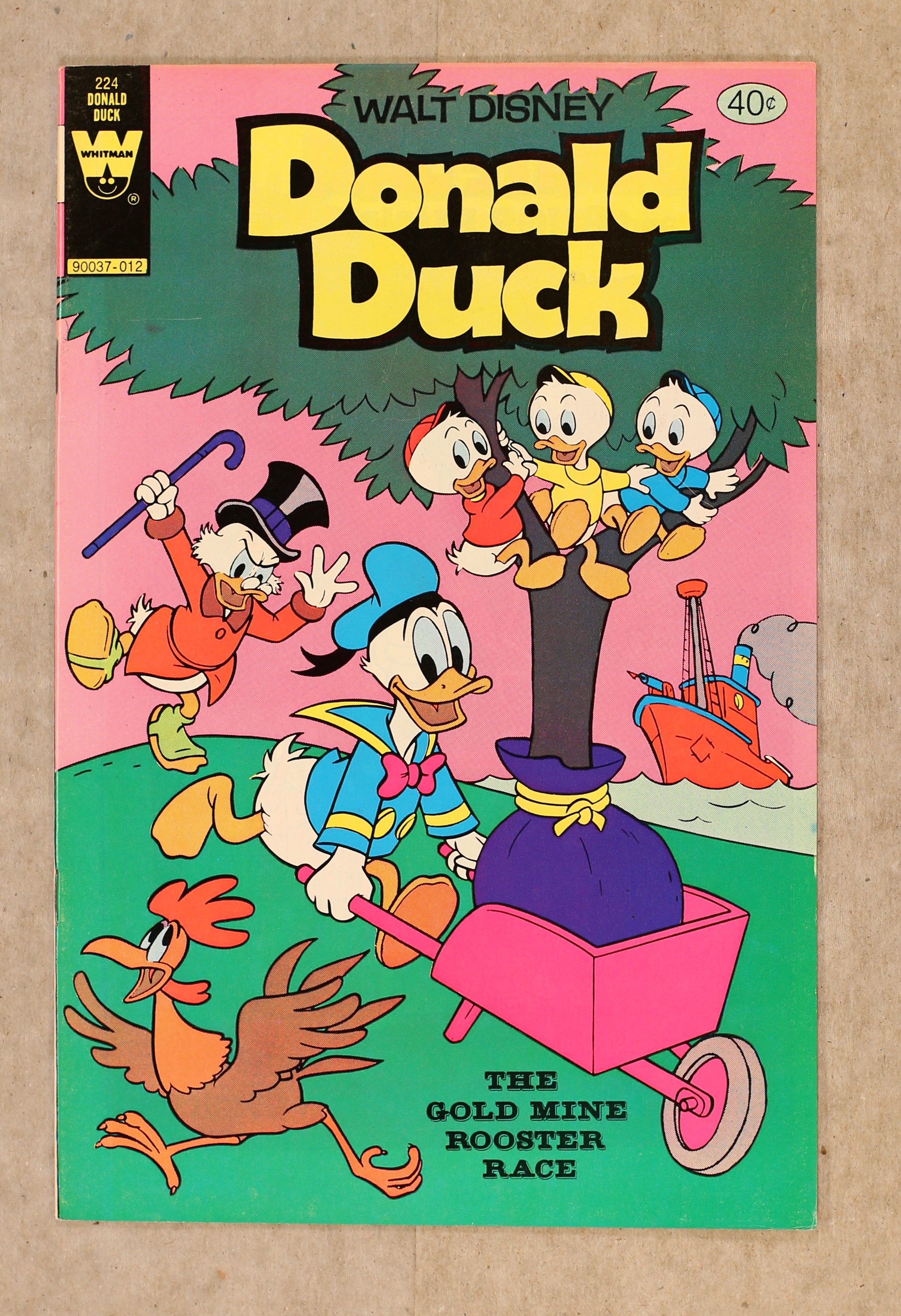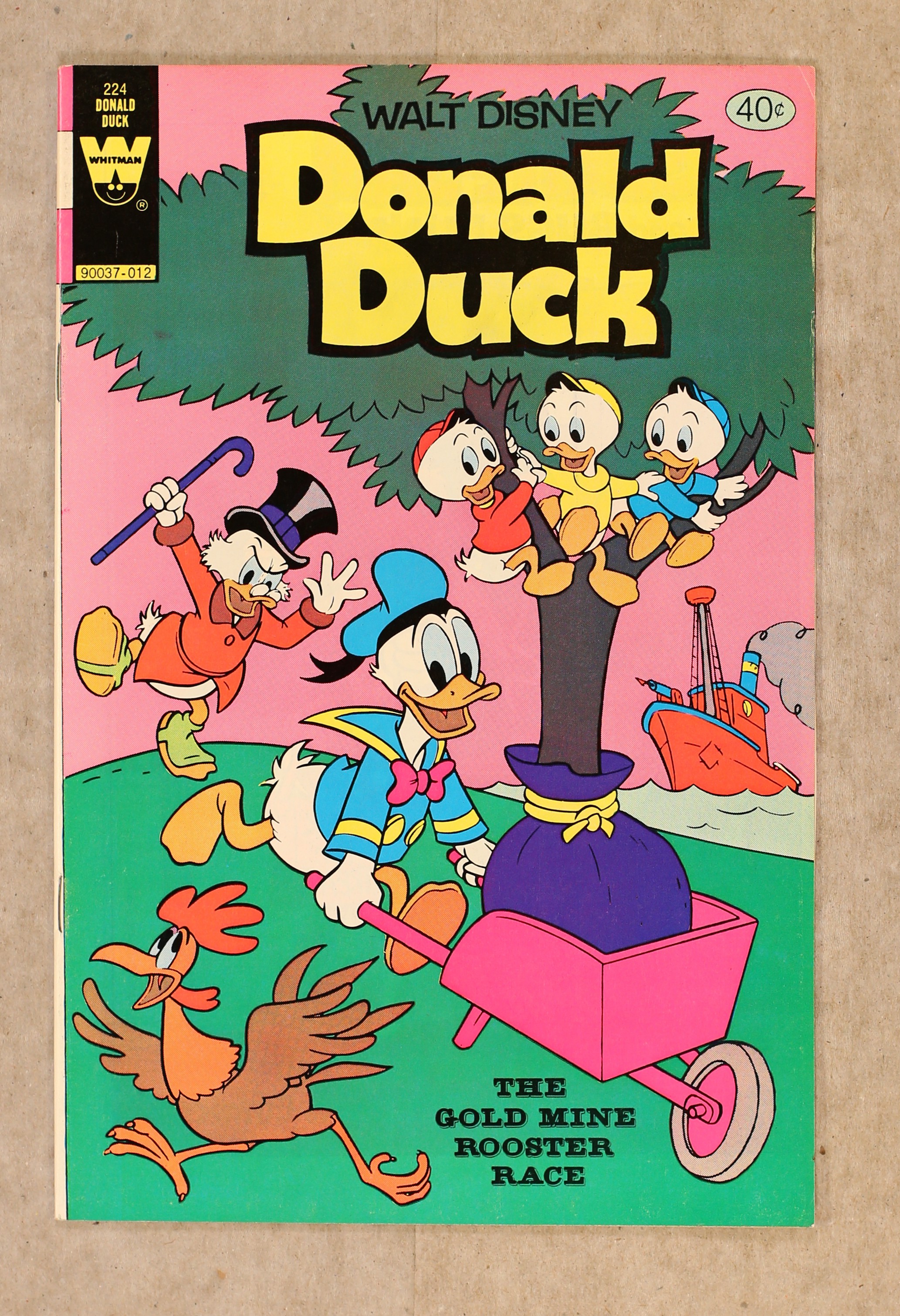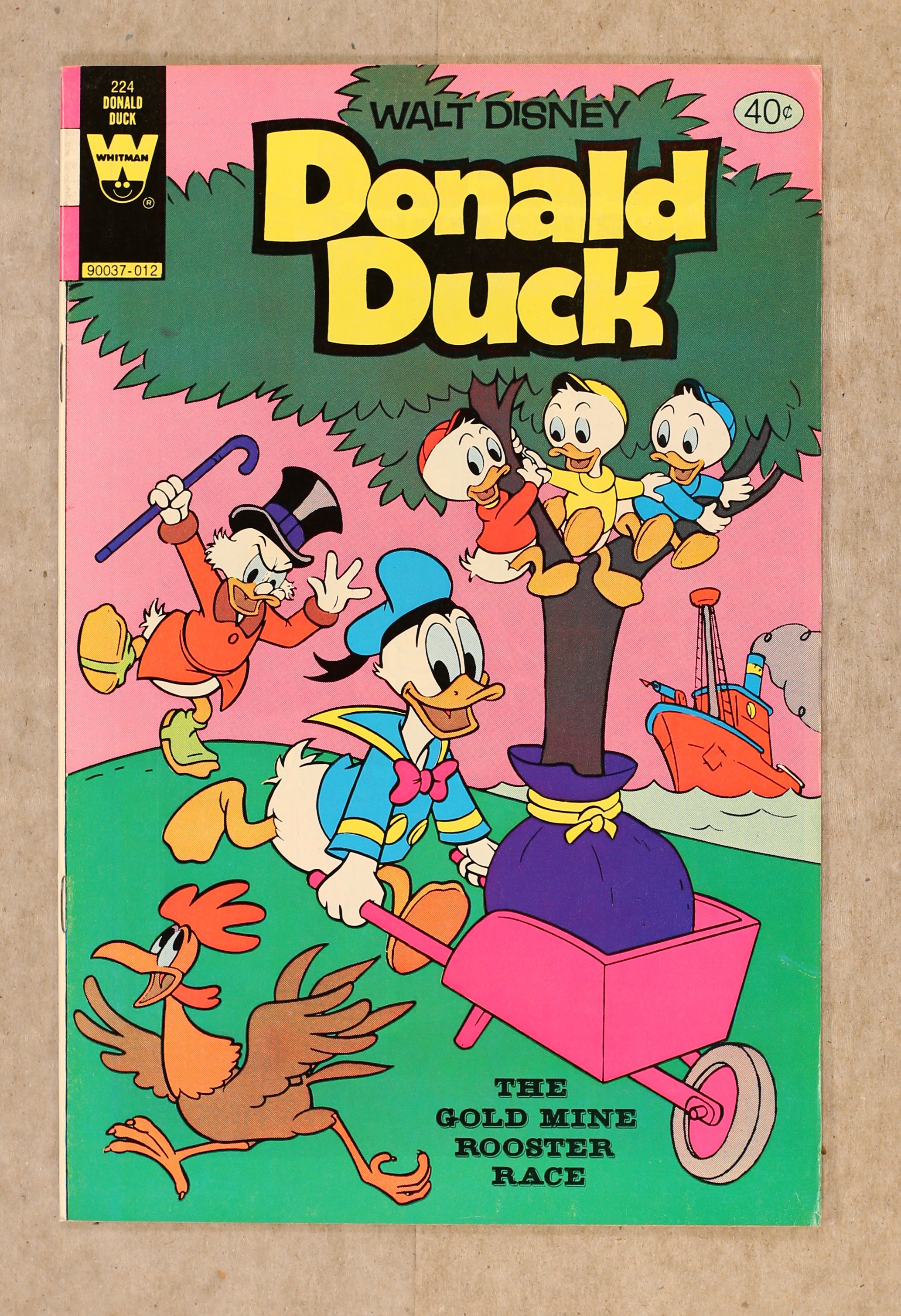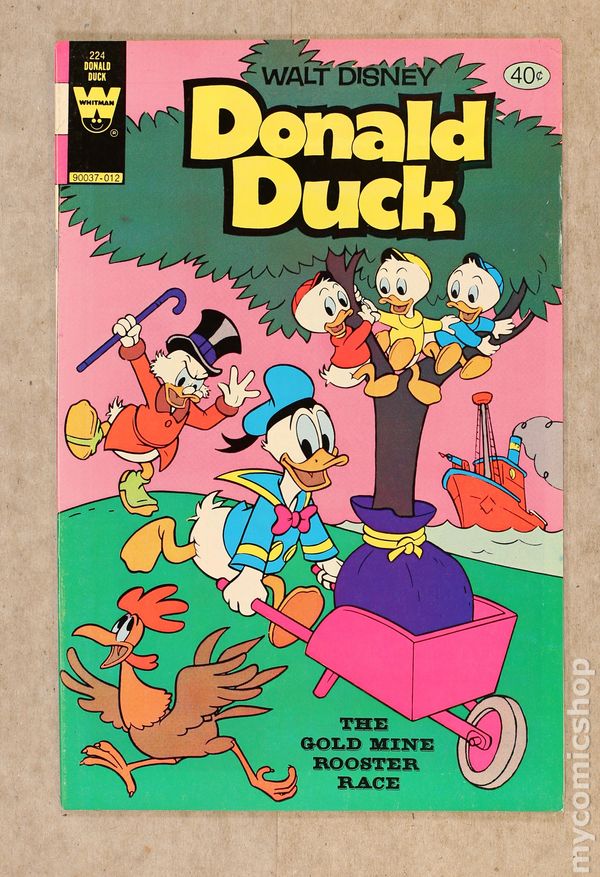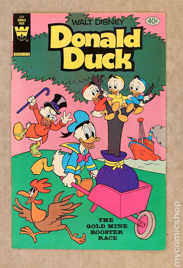 Published Dec 1980 by Dell/Gold Key/Whitman.$9.00Issue features "The Gold Mine Rooster Race" in which Donald and the nephews help Scrooge save his gold mine in Lodvia and "The Flying Egg." Issue also has Chip ?N' Dale in "The Medicine Man." All stories are reprints. Story and art credits: unknown. Number on Cover: 90037-012. 36 pages, full color. Cover price $0.40.