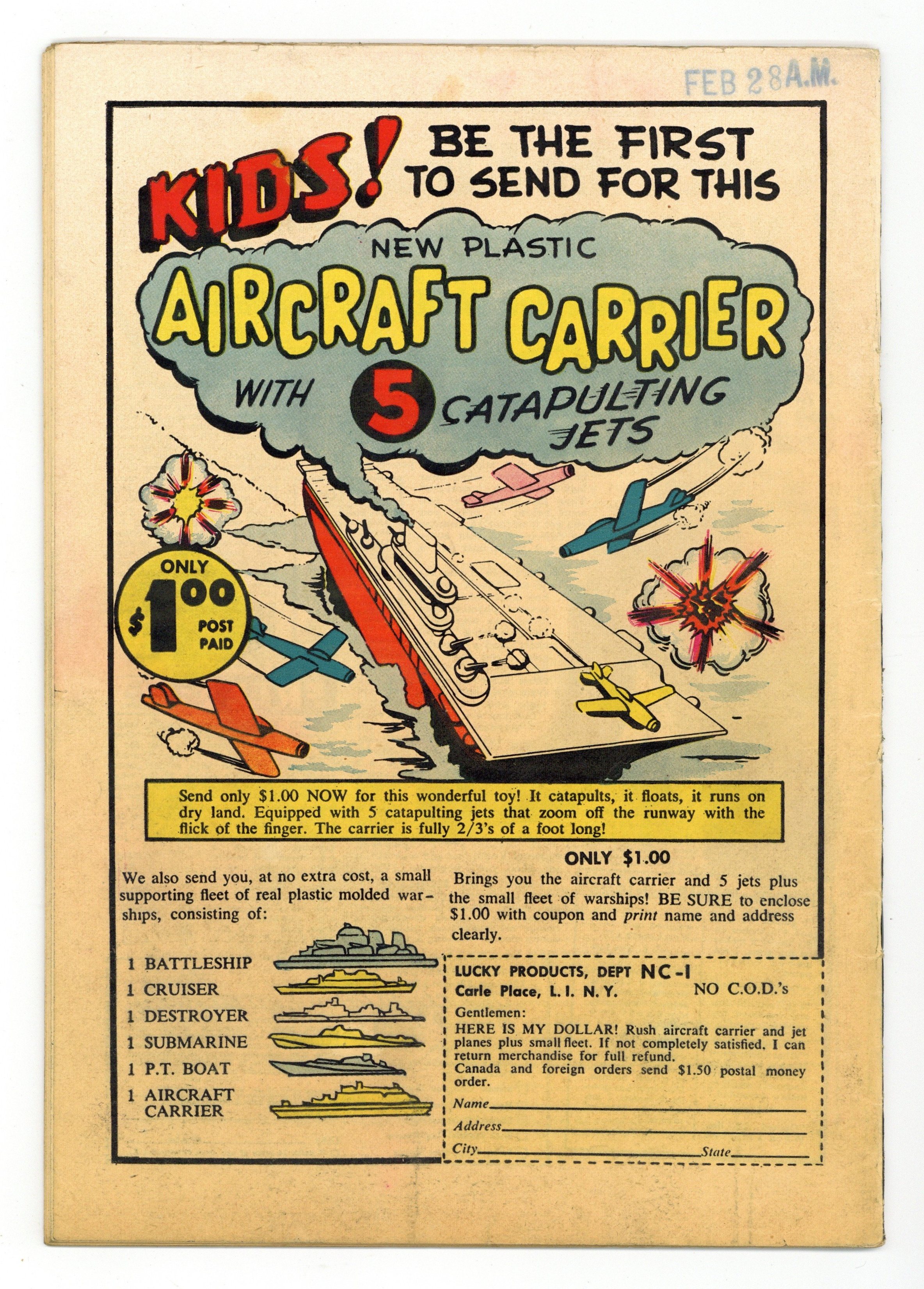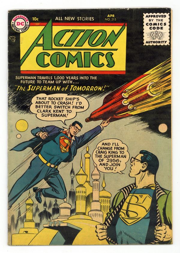 Cover pencils by Wayne Boring, inks by Stan Kaye. "The Superman of Tomorrow," pencils by Wayne Boring, inks by Stan Kaye; Craig King uses scientific gadgets in 2956 to duplicate Superman's powers but now he needs help to catch scientific bandits, so he beams a message across time to the Real Superman. "The Big Game Butterfly Hunter," art by Ed Smalle; Hector Doolittle unwittingly risks life and limb to collect rare butterflies. -page Bebe story by Henry Boltinoff. "Flying Rangers" text story by script by Jack Miller (as John Maxton), art by Raymond Perry. "The Mystery of the Stolen Worlds," script by Otto Binder, art by Jim Mooney; Giant hands out of nowhere move things around in space. 36 Pages, Full Color. $.10 Cover price $0.10.