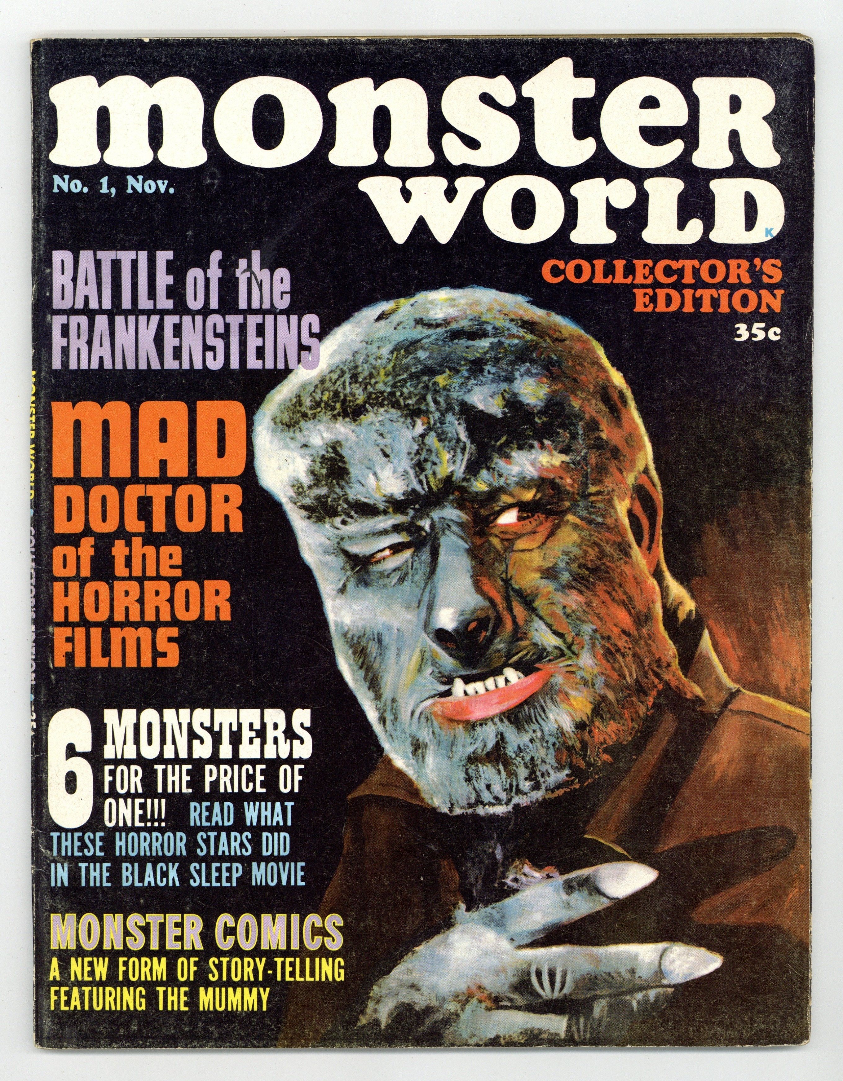 Monster World 1-10 has the same editorial staff as Famous Monsters of Filmland, and the magazine's brief run is essentially considered to be issues 70-79 of Famous Monsters. Beginning with issue #80, Famous Monsters went back to its original name. Features in Monster World #1 include: an intro to the "new" magazine by publisher James Warren; a comic book reprint of The Mummy (by Russ Jones and Wally Wood); filmbook The Black Sleep; "Terror Talk" by Bill Obbagy; and more. The Chaney Wolfman cover painting is by an unknown artist. Cover price $0.35.
