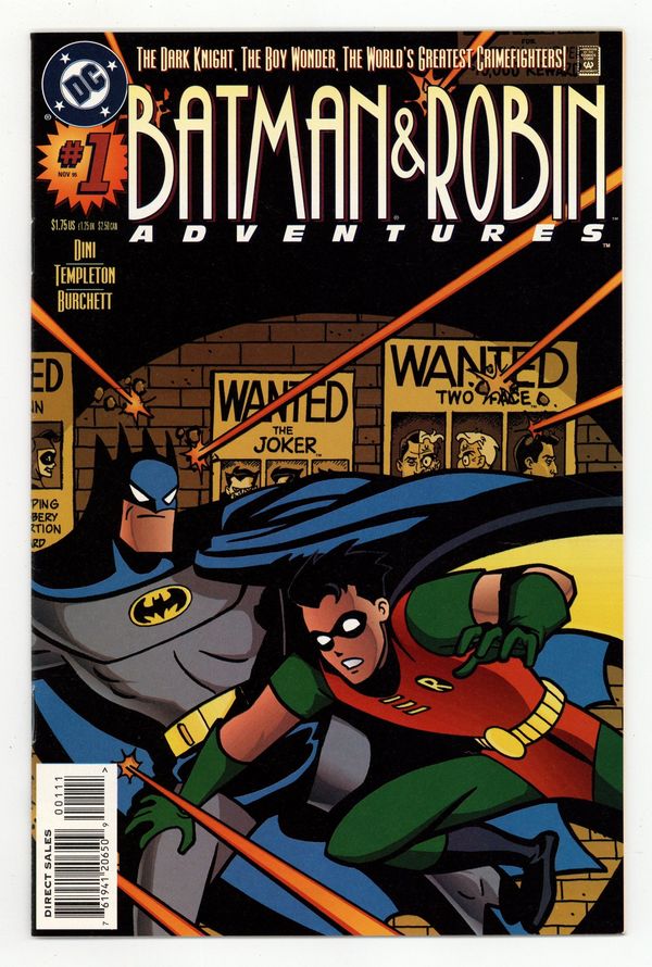 Cover by Ty Templeton. DC relaunches its popular comic book based on the award-winning cartoon with a new title and a new #1 issue. This new series premieres with a 2-part Two-Face story! "Two Timer" Part One, script by Paul Dini, pencils by Ty Templeton, inks by Rick Burchett; Harvey Dent is finally on the brink of recovery, and he has his best friend Bruce Wayne and his fiancé Grace Lamont to thank for that; The Joker plants the seeds of doubt in Dent's mind, gradually building through suggestion and false evidence that Bruce and Grace have been having an affair while Dent's been imprisoned at Arkham Asylum; With Harley Quinn's help, the Joker destroys all of Harvey's hard work, unleashing Two-Face on the world. "Welcome to the first issue of The Batman and Robin Adventures" article. 36 pgs., full color. Cover price $1.75.