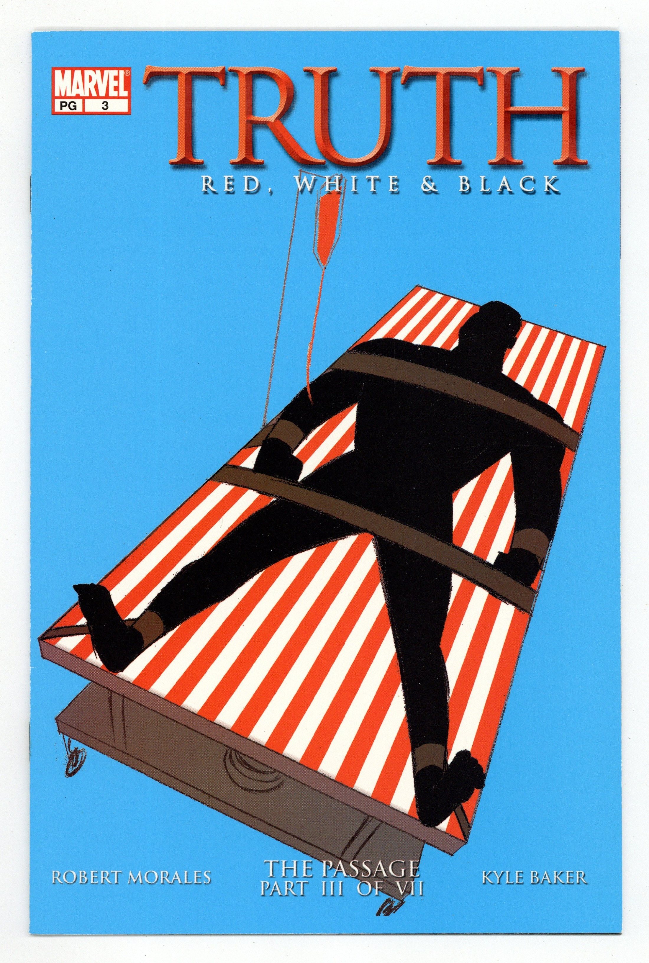 Tags: Captain America$18.00The Passage - Written by Robert Morales. Art and Cover by Kyle Baker. In the tradition of ORIGIN, Marvel reveals the shocking secret history of Captain America! In this issue (spoilers ahead): The army uses African American soldiers as experimental guinea pigs for the "super soldier" serum that will create Captain America. Most of the experiments are fatal, but once the dose is refined, the few survivors become super soldiers. The families of even the survivors are informed that their loved ones died in a massive explosion. Characters: Colonel Walker Price; Sgt. Lucas Evans; Larsen; Faith Bradley; Dr. Josef Reinstein; Lt. Phillip Merritt; Isaiah Bradley; Maurice Canfield; Jack. 32 pages, full color. Marvel PG Cover price $3.50.
