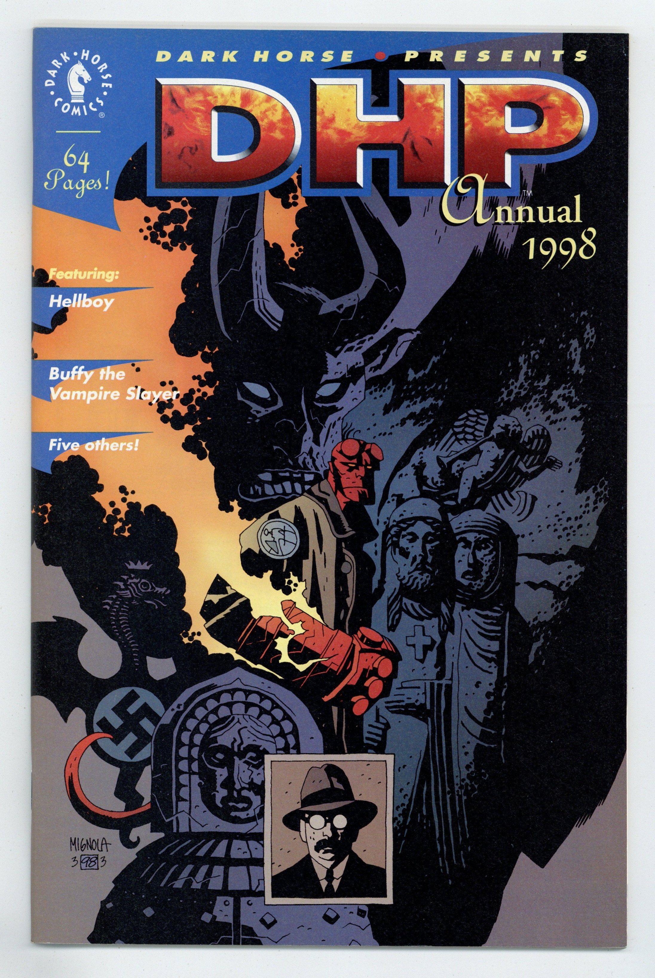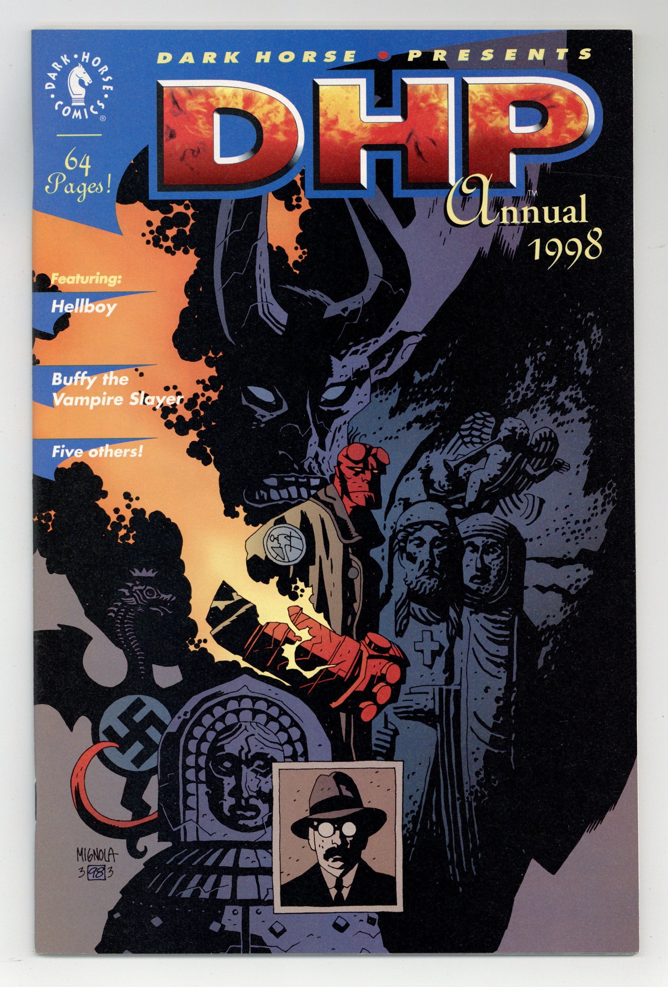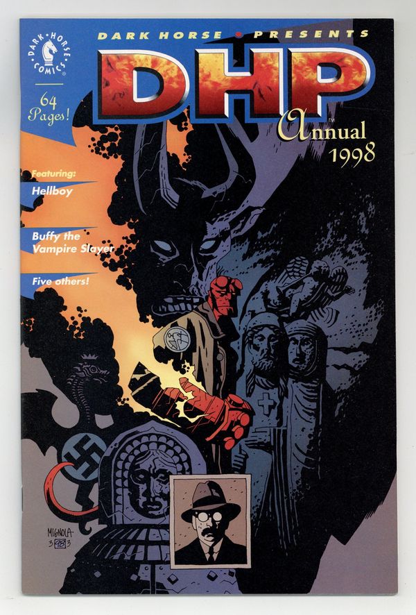 Hellboy Cover by Mike Mignola. This action packed 64-pages features the further adventures of Hellboy, My Vagabond Days, Skeleton Key, The Ark, Phineas Page, and . . . Buffy the Vampire Slayer! Save your allowance and get in line, children, 'cuz this one is gonna go fast! 64 pages, B&W. Cover price $4.95.