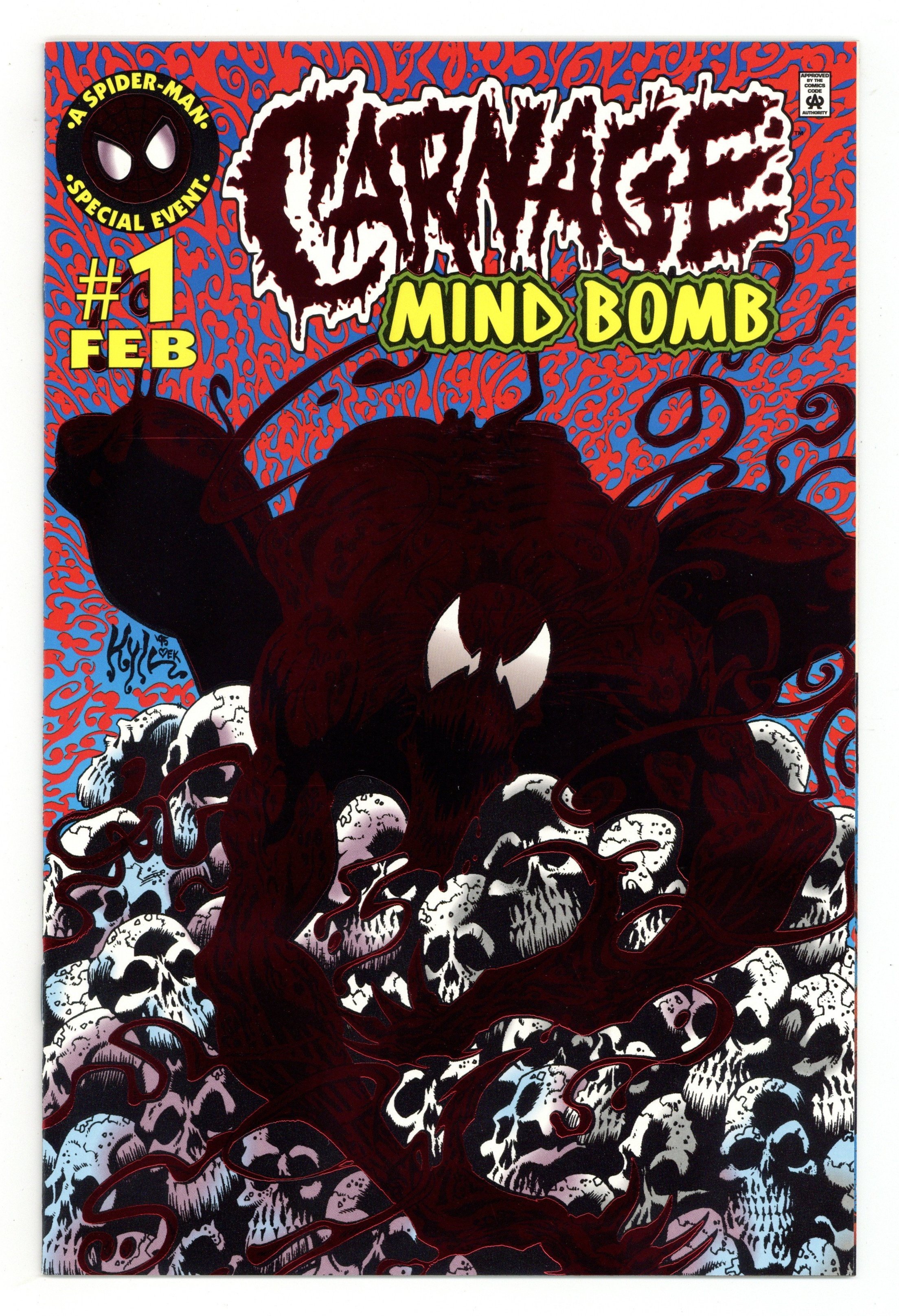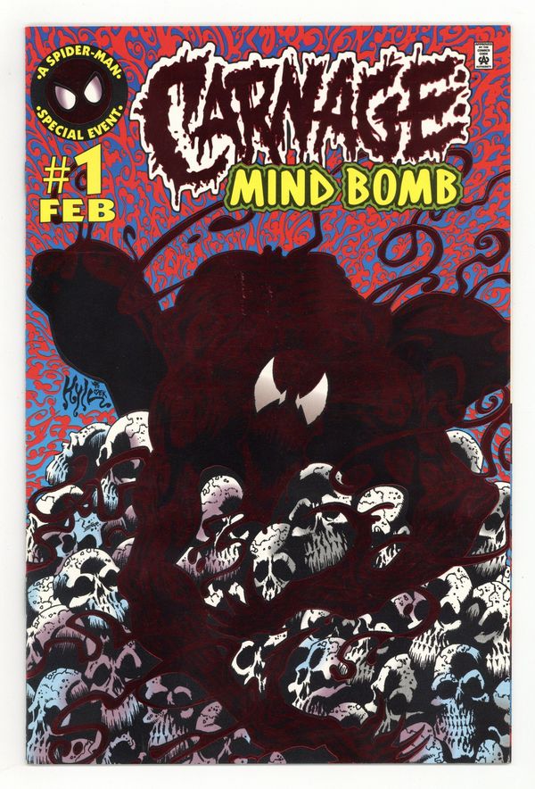 Carnage cuts loose in his own one-shot! Just in time for the Holidays: a warm and cozy look into the mind of a psychopath! It's 32 pages of Spider-Man's most fearsome foe decking the halls with gobs of gore! Written by Warren Ellis. Art and foil-stamped cover by Kyle Hotz. Cover price $2.95.