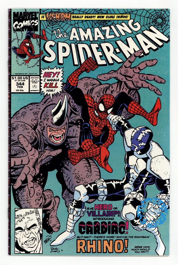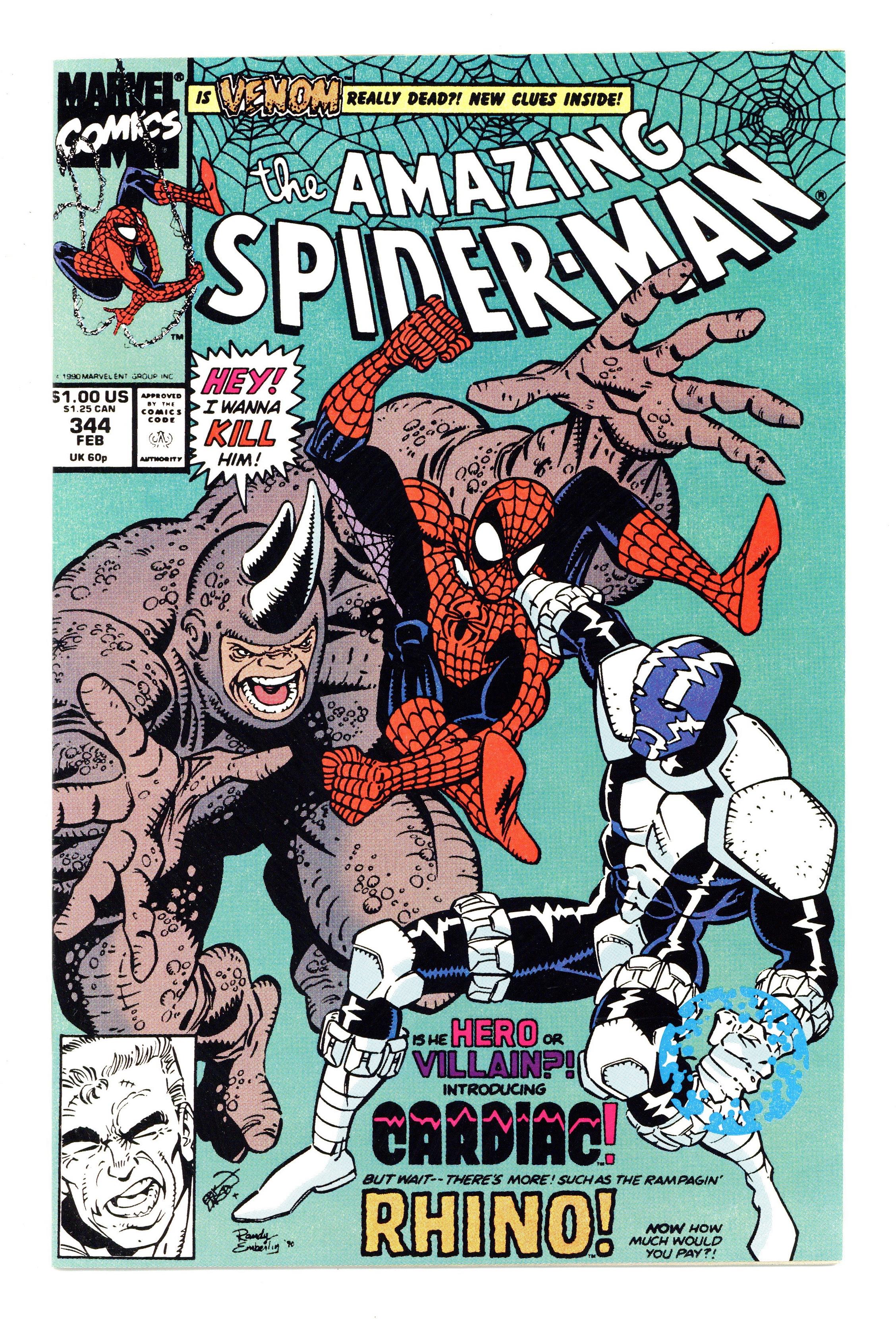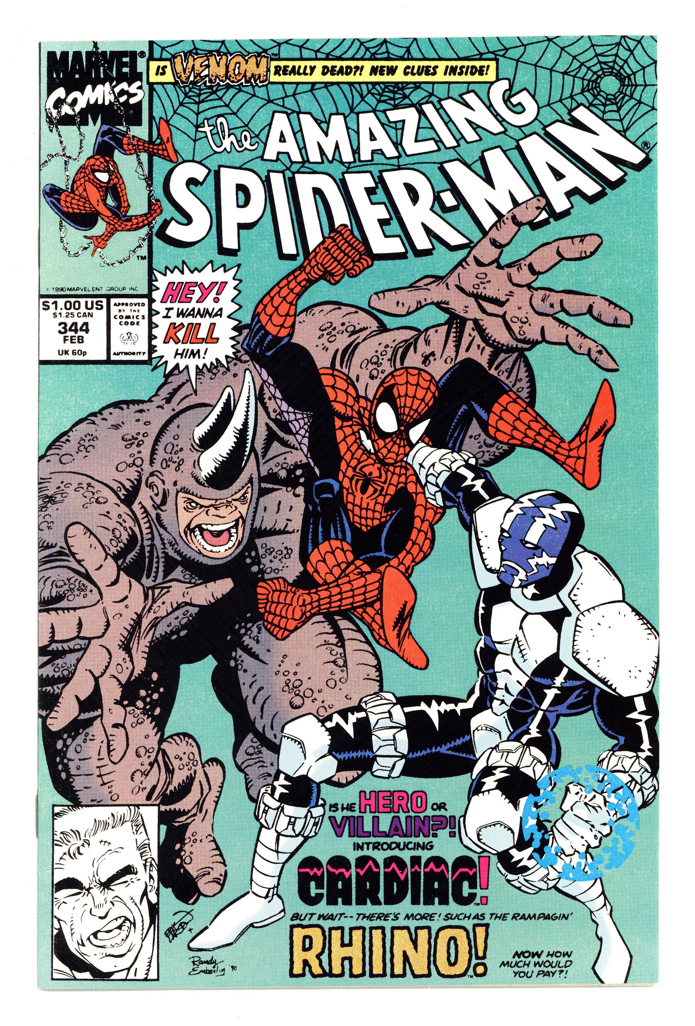 Tags: Marvel Legacy Numbering: Amazing Spider-Man (part 344), Spider-Man$14.50Direct Edition. First appearance of Cletus Kasady aka Carnage in "Hearts and Powers." Script by David Michelinie. Pencils by Erik Larsen. Inks by Randy Emberlin. Cover by Erik Larsen and Randy Emberlin. In a warehouse on the waterfront, the Spectacular Spider-Man runs into a new costumed crusader...Cardiac! Is he a hero or villain or vigilante or all of the above? After a brief confrontation, the web-slinger isn't quite sure! But later on, at a chemical plant in the Bronx, Cardiac and the wall-crawler are forced to team up to tackle the rampaging Rhino! So, Spidey will consider Cardiac a friend...for now! Meanwhile, in Ryker's Island, Eddie Brock gets to know his new cellmate: Cletus Kasady...the future Carnage! Cameo appearances by Justin Hammer and Mary Jane Watson. 36 pages. $1.00 cover price. Cover price $1.00.